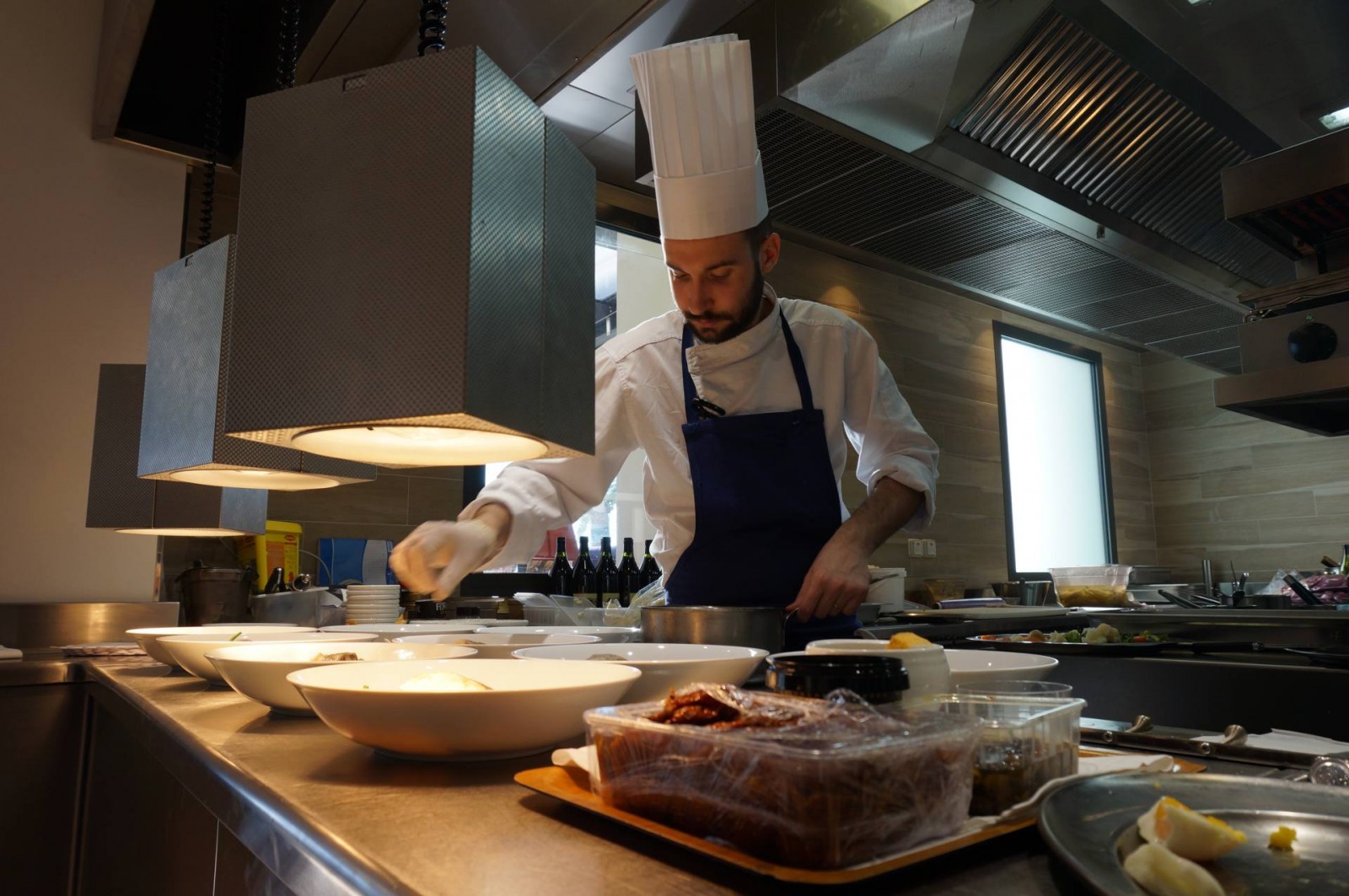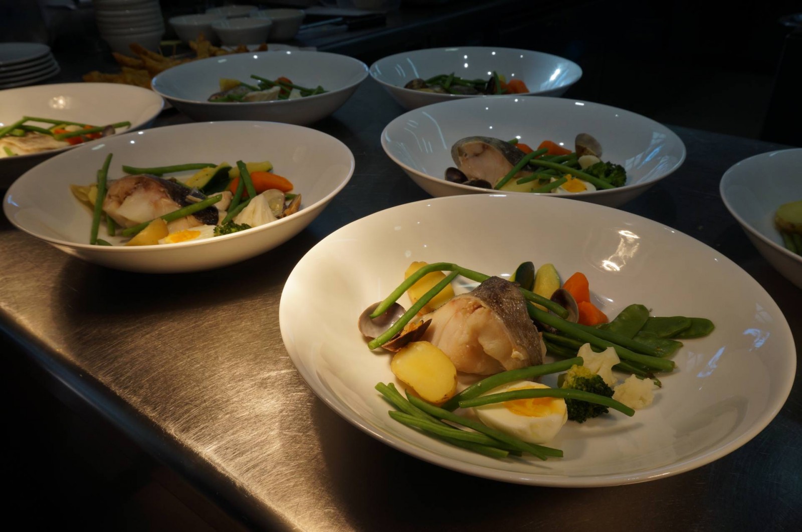 A peine entrée, le premier truc qui me frappe, c’est le soleil ! Le restaurant est intégralement vitré. Du coup, le soleil est vraiment dans la pièce, il fait bon, c’était parfait ! Et toutes les vitres sont prévues pour rentrer dans le sol, donc l’été, le restaurant intérieur se transforme en terrasse. Le restaurant est en plus surélevé, ce qui offre une vraie vue mer et surtout, on fait complètement abstraction des voitures, ce qui est quand même bien plus sympa que les restaurants au bord de la route ! Pour l’instant, il avait tout pour me plaire et j’avais hâte de m’attabler pour choisir ce que j’allais manger. Mais avant d’attaquer, j’avais remarqué au loin les cuisines apparentes. J’adore ça, je suis donc allée jeter un œil du côté des plats qui sortaient pour m’ouvrir l’appétit ! De retour à table, j’opte pour le menu du jour avec le plat du jour qui est un aïoli de cabillaud que j’avais vu passer dans les cuisines. Le menu du midi change tous les jours. A chaque jour sa spécialité niçoise : le quasi de veau le lundi, la cuisse de lapin confite le mardi, la morue le mercredi, l’épaule d’agneau confite le jeudi, l’aïoli le vendredi, la daube le samedi et le filet de loup de la Méditerranée le dimanche ! Je trouve l’idée plutôt sympa de pouvoir découvrir une spécialité à prix très correct. J’ai évidemment enchaîné avec un dessert : une poire pochée avec un biscuit aux amandes, c’était un délice ! Le plat du jour + café + eau est à 15€, l’option avec le dessert est à 19€. Et avec l’entrée en plus, cela fait 25€ ! Je peux vous dire qu’en plus d’être au soleil et sur la Promenade des Anglais avec la vue mer, la qualité est vraiment au rendez-vous ! C’est une très bonne adresse pour un lunch sympa à Nice hiver comme été !