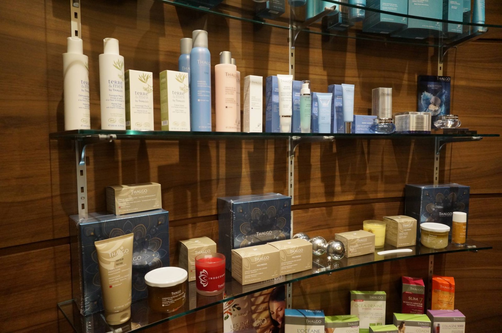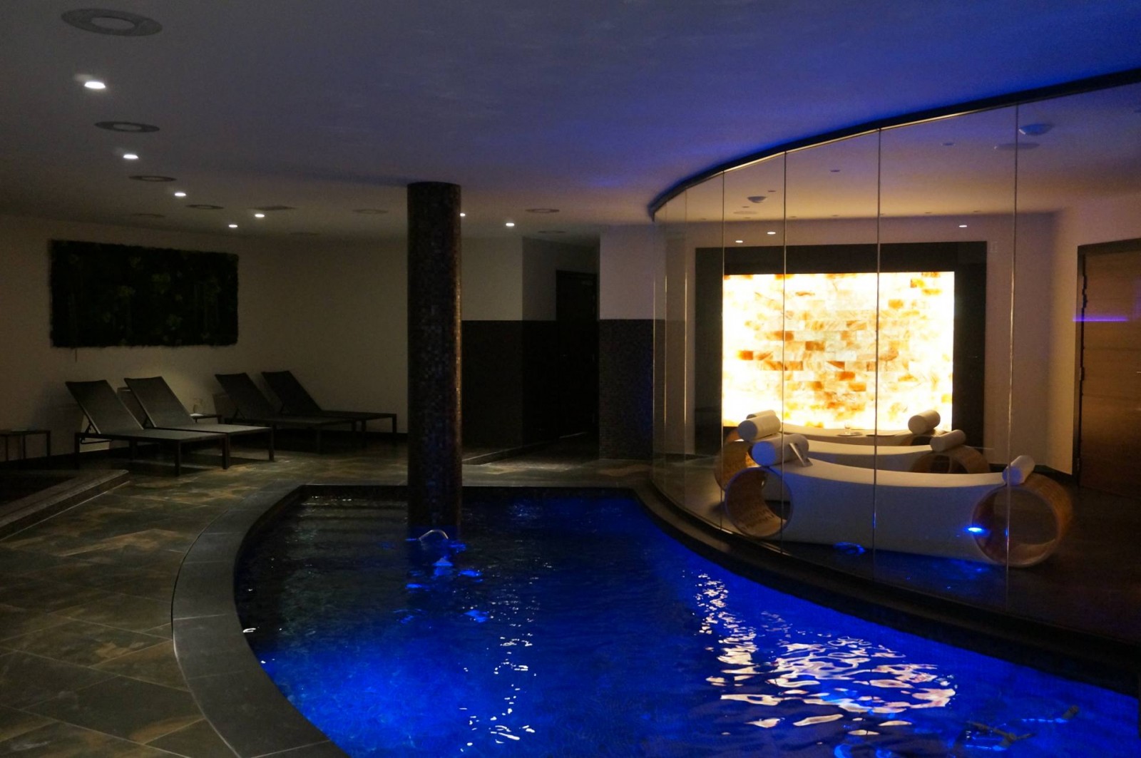 Du coup, je vais vous raconter tout ça. En arrivant, j’ai été reçue dans un hall où les cosmétiques utilisées par le spa sont exposées. La tentation ultime car tu as envie de tout essayer, de tout emmener chez toi. Après un rapide passage par le vestiaire, je pénètre dans le spa qui est juste sublime. J’ai rarement vu une décoration si travaillée. L’ambiance est vraiment cosy, chaleureuse dans des tons bleu nuit, noir, j’ai adoré. J’ai commencé par une petite session piscine avec nage à contre-courant et une belle cascade d’eau sur la nuque, un passage dans le sauna et dans le jacuzzi bien chaud. Je peux vous dire qu’après une semaine de bureau, un déplacement à Paris, des nuits un peu courtes, c’était magique !