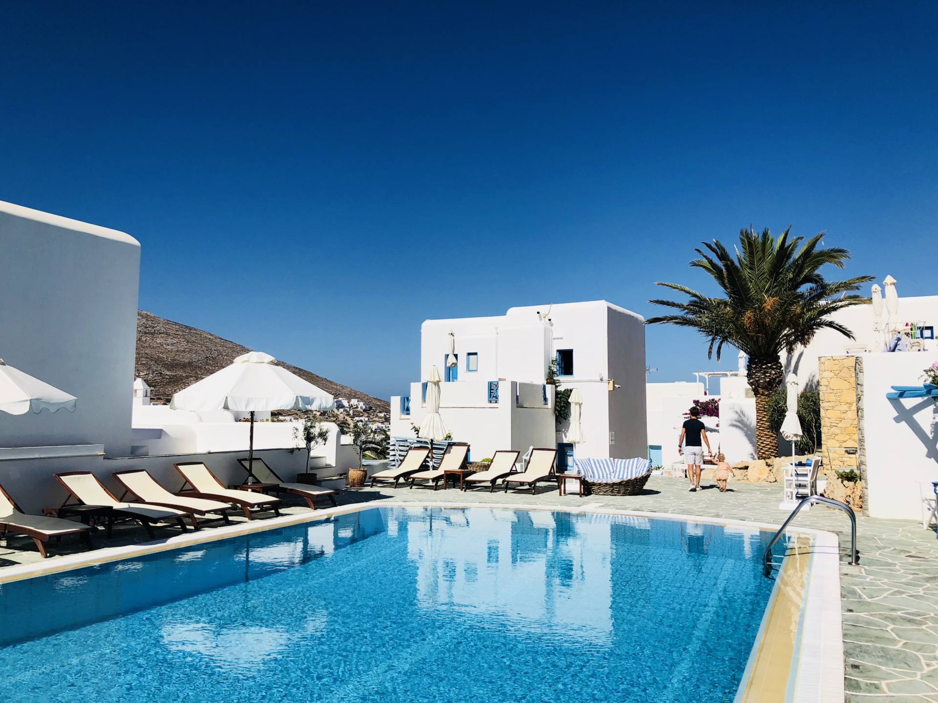 Je n’ai pas cherché longtemps, je suis vite tombée sur Folegandros Apartments, un hôtel avec piscine à la Chora. Le rapport qualité-prix est top puisqu’on a payé moins de 600€ pour 3 nuits. L’hôtel est superbe, ce sont des petits appartements en rez-de-chaussée ou premier étage. Le nôtre avait une vue sur la piscine et sur la colline d’en face, c’était canon ! La piscine est très grande, il y a aussi un jacuzzi et un petit pool-house, c’est vraiment mignon. On a aussi trouvé 2 terrasses poir chiller, tout en haut de l’hôtel, avec des petites banquettes, bref, tip top ! Il est situé juste à côté du chemin qui monte à l’église Panagia d’où on peut admirer le coucher du soleil. L’hôtel propose un service de transfert gratuit avec leur navette, un vrai plus ! Côté chambre, elle est assez grande avec un lit de 180, un canapé et une kitchenette avec une petite table, mais aussi une terrasse équipée donc c’est parfait. Seule la salle de bains est un peu rustique avec juste un lavabo et une douche basique avec un simple rideau. C’est un peu petit et simple par rapport au reste des prestations ! En tous cas, je vous recommande de loger à Chora, c’est idéal !