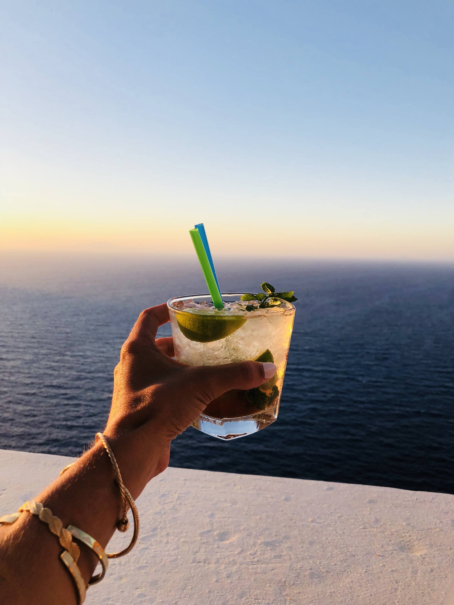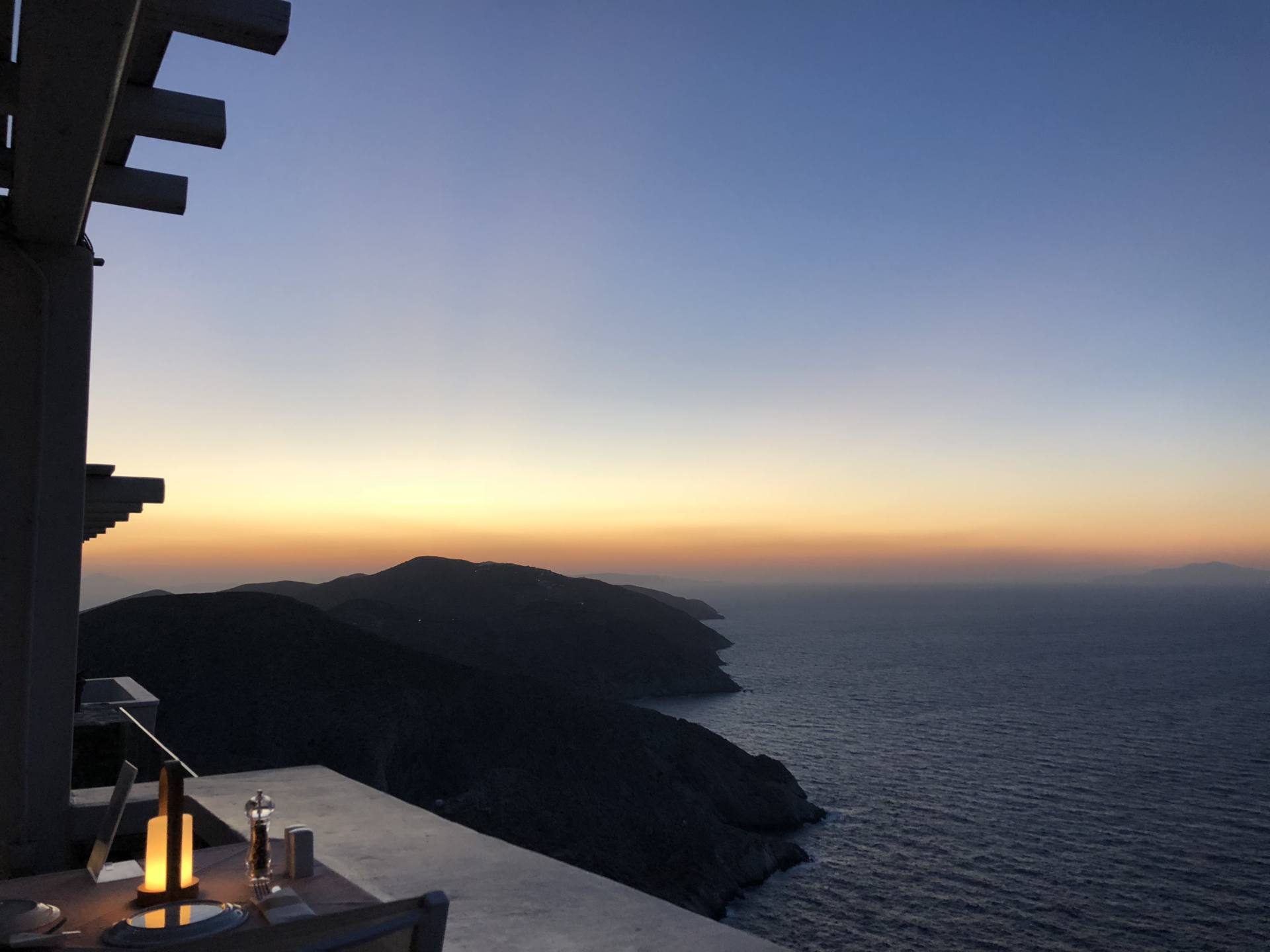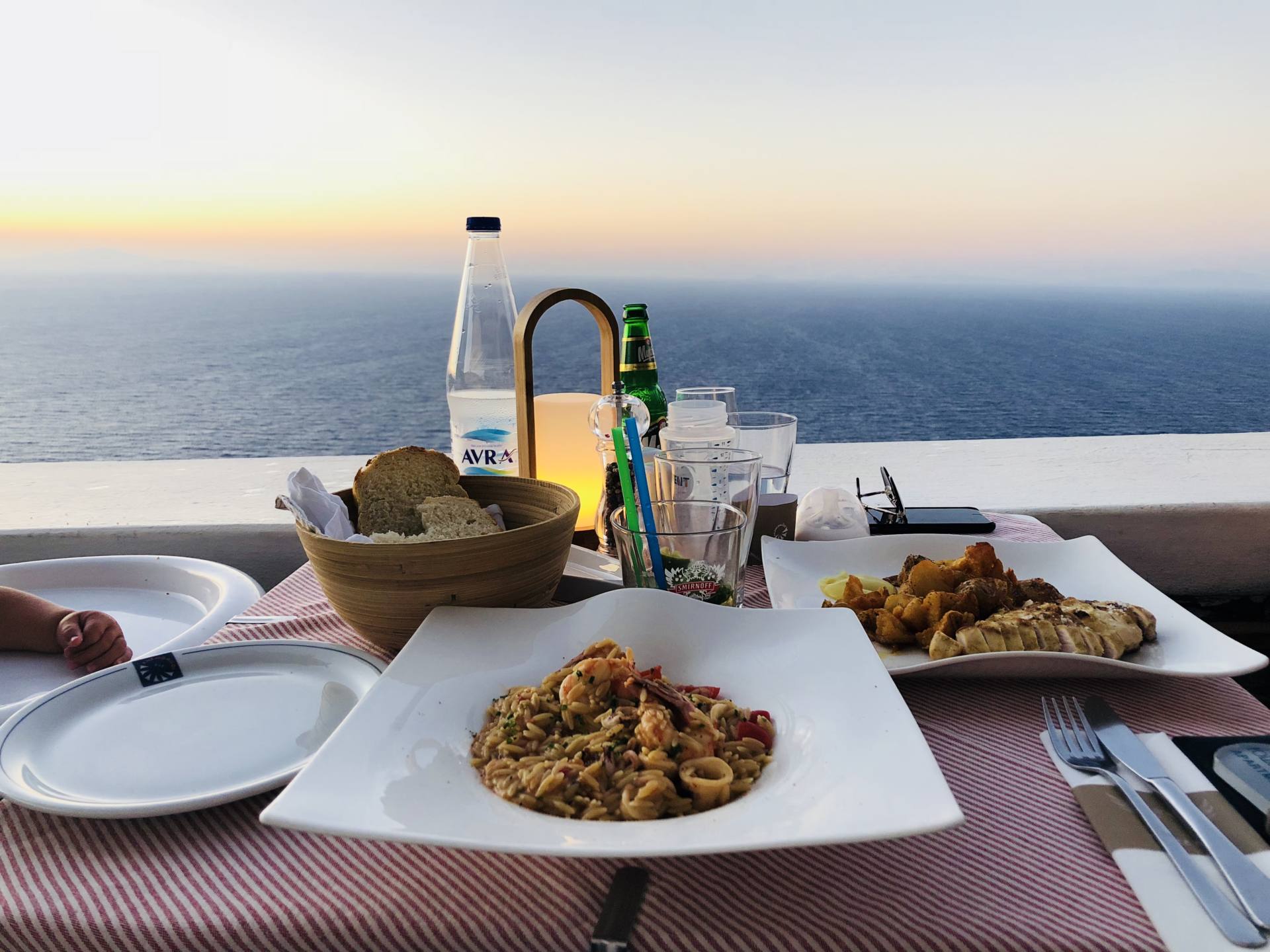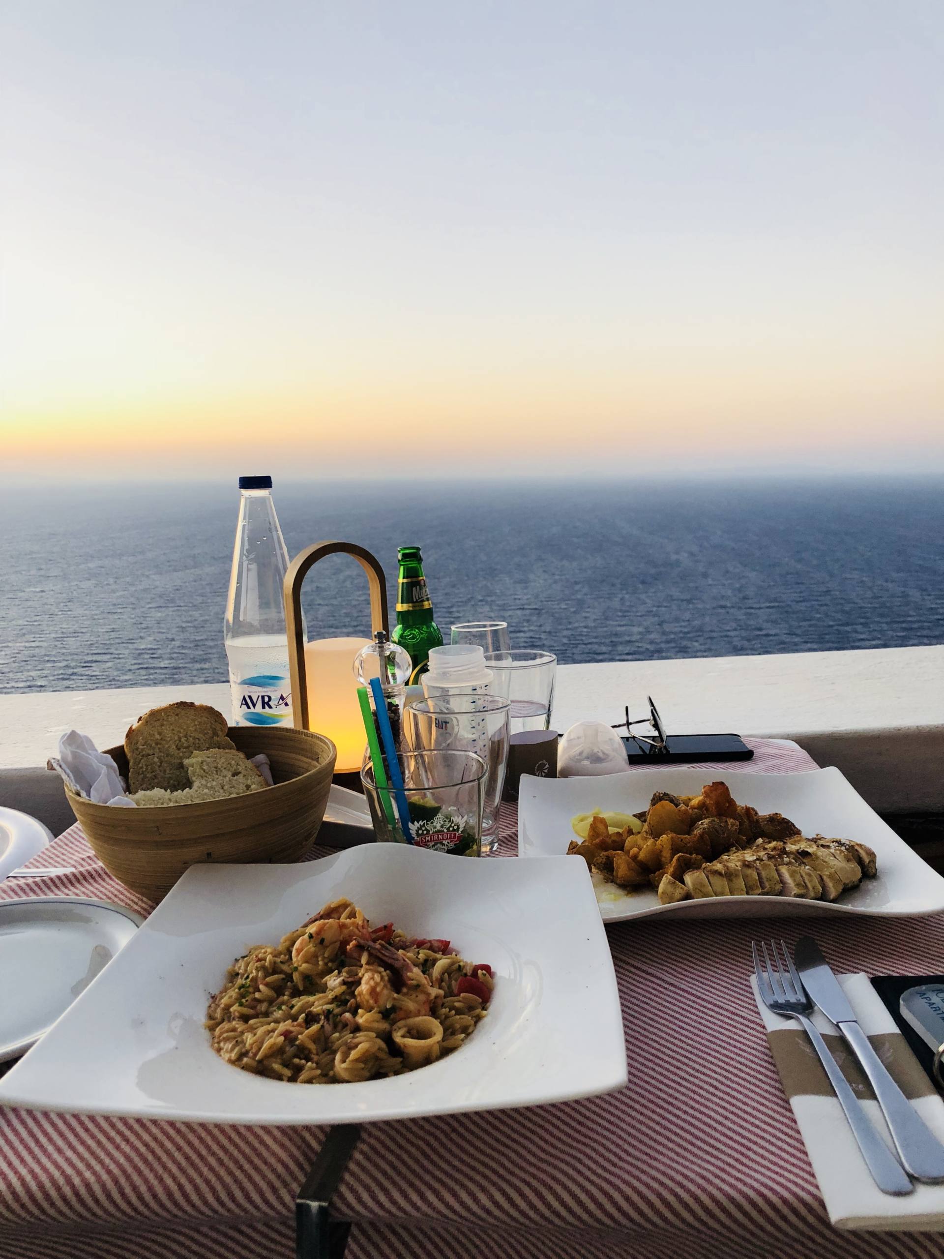 Pour un dîner romantique face à la mer et au coucher du soleil : on nous a conseillé de dîner dans l’hôtel à côté du nôtre : Anemomilos. Il surplombe la mer donc la vue est sublime ! C’est bien le cas et on s’est régalé ! Mon mojito était très bon, tout comme mes petites pâtes façon risotto aux fruits de mer. Délicieux !