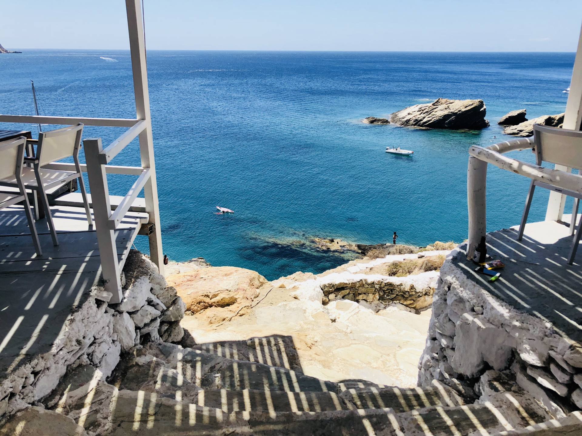 Pour aller à la plage, on en a regardé plusieurs et c’est Agios Nikolaos qui nous a donné envie, surtout qu’on nous l’avait recommandée ! Pour y aller depuis Chora, il faut prendre un bus. Attention, l’arrêt est en dehors du centre, il y a une petite gare routière et un parking. C’est 1,80€ par personne, quelque soit le trajet, et il y en a 1 par heure entre 10h30 et 17h30 ! Il faut 30 minutes environ pour y aller. Une fois là-bas, on peut soit prendre un sentier et marcher 30 minutes environ, soit y aller avec des petits bateaux-taxi. C’est 5€ l’AR par personne et c’est canon car on voit la vue depuis la mer, moi j’adore ! Sur place, il y a un petit restaurant sur la plage et un autre qui surplombe la baie dont je vous parle dans mes bonnes adresses plus loin !