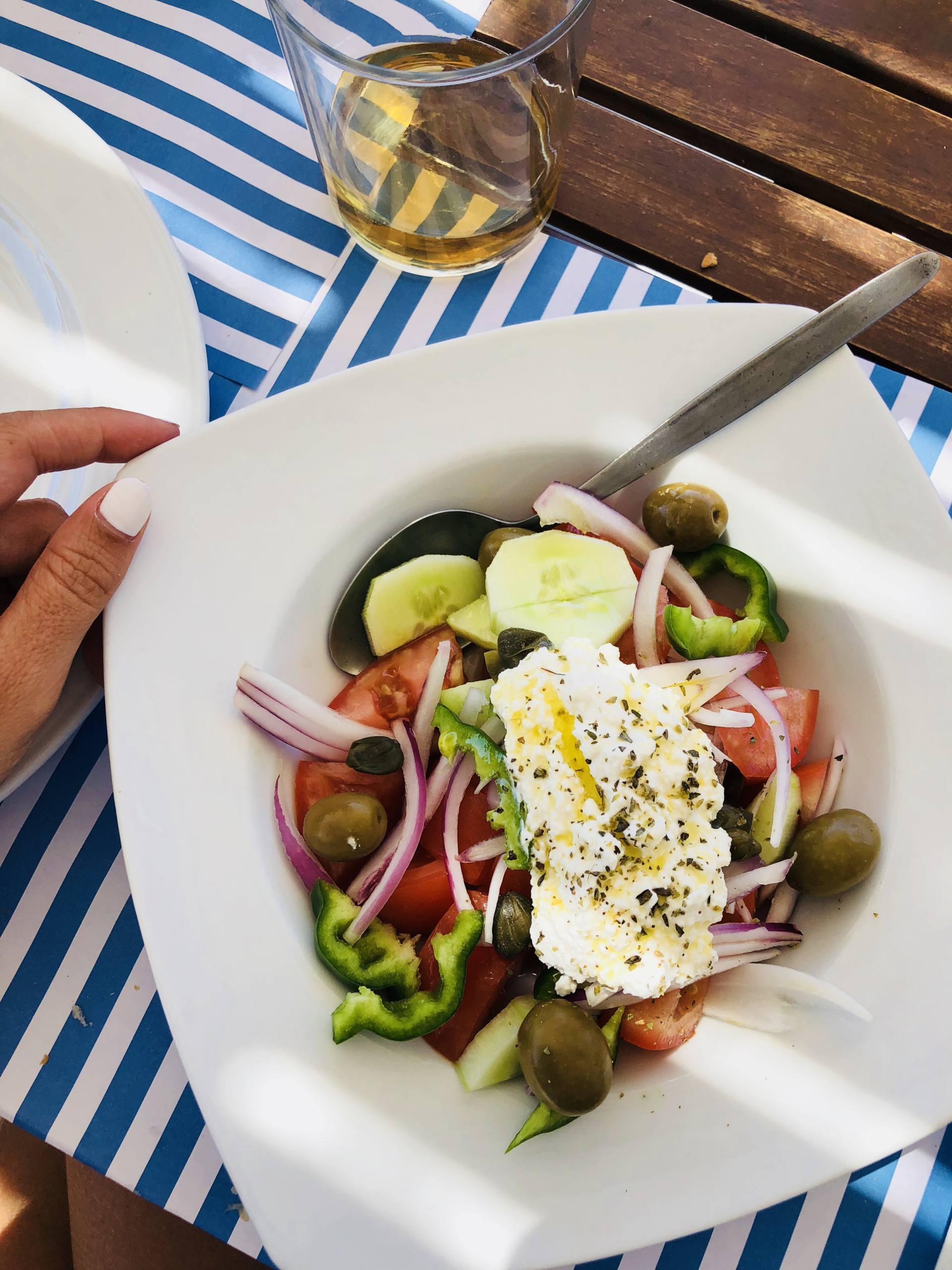 Pour un déjeuner sur la plage : on nous avait recommandé un lieu superbe dont je vous ai parlé au-dessus, la plage Agios Nikolaos. On nous avait dit d’aller mangé à Papalagi ! Quelle vue, c’est un endroit magique !!! On a simplement pris 2 bières, un pavé de thon et une salade grecque, mais c’était un super moment ! Je vous recommande vraiment d’y aller !