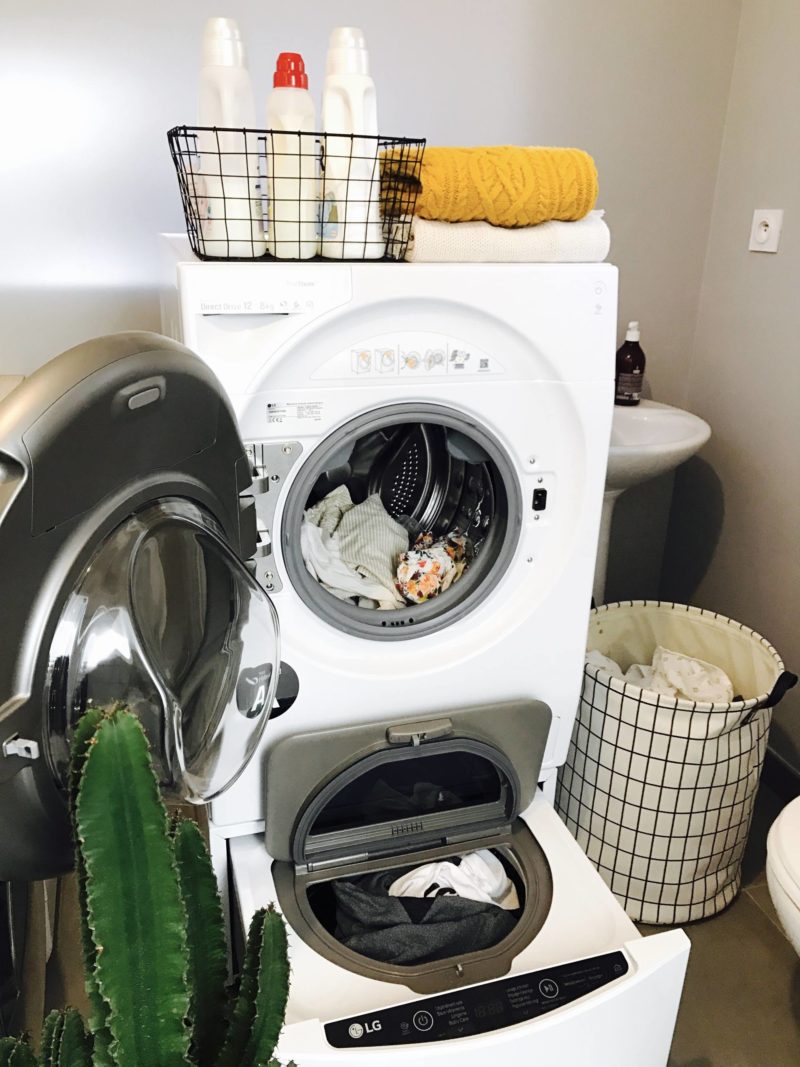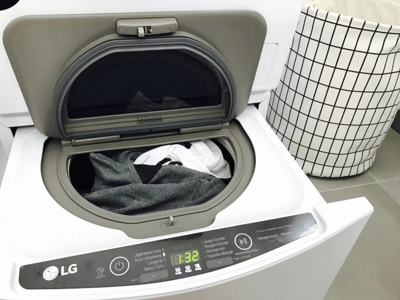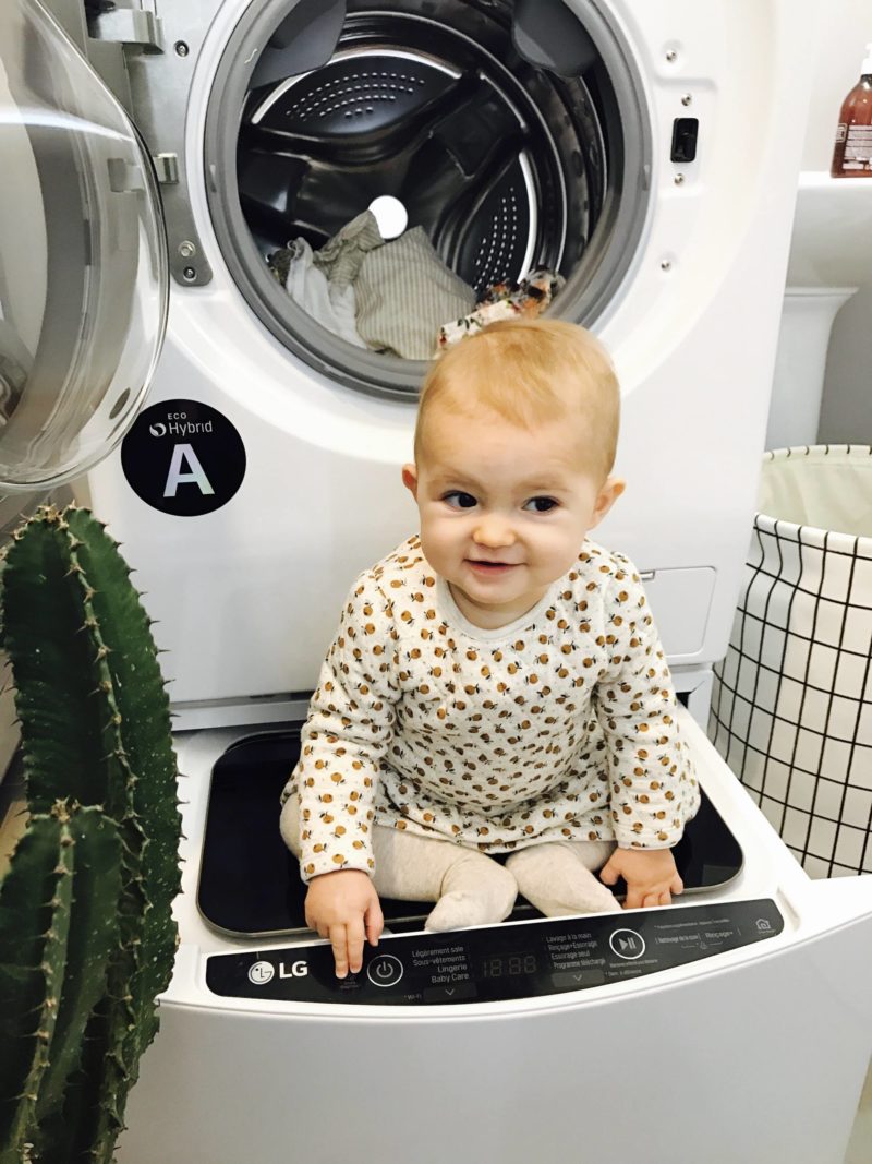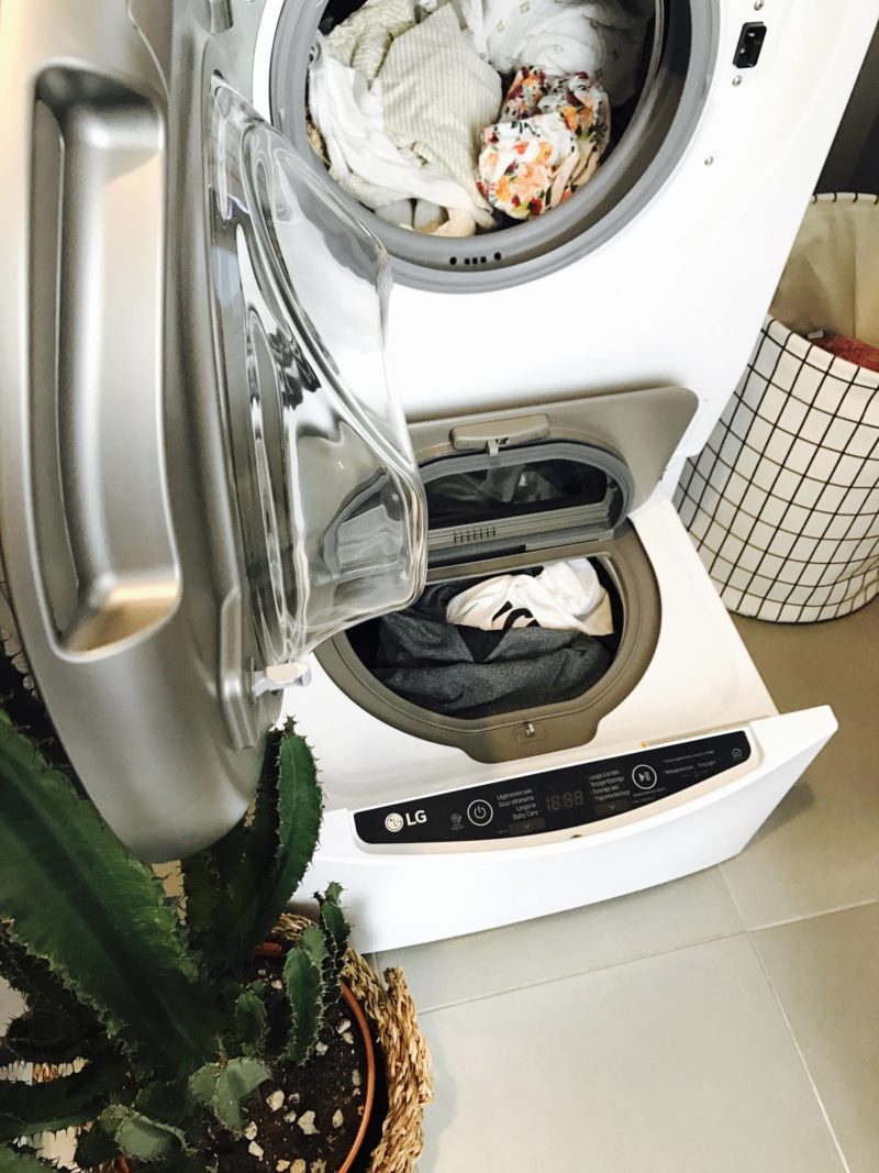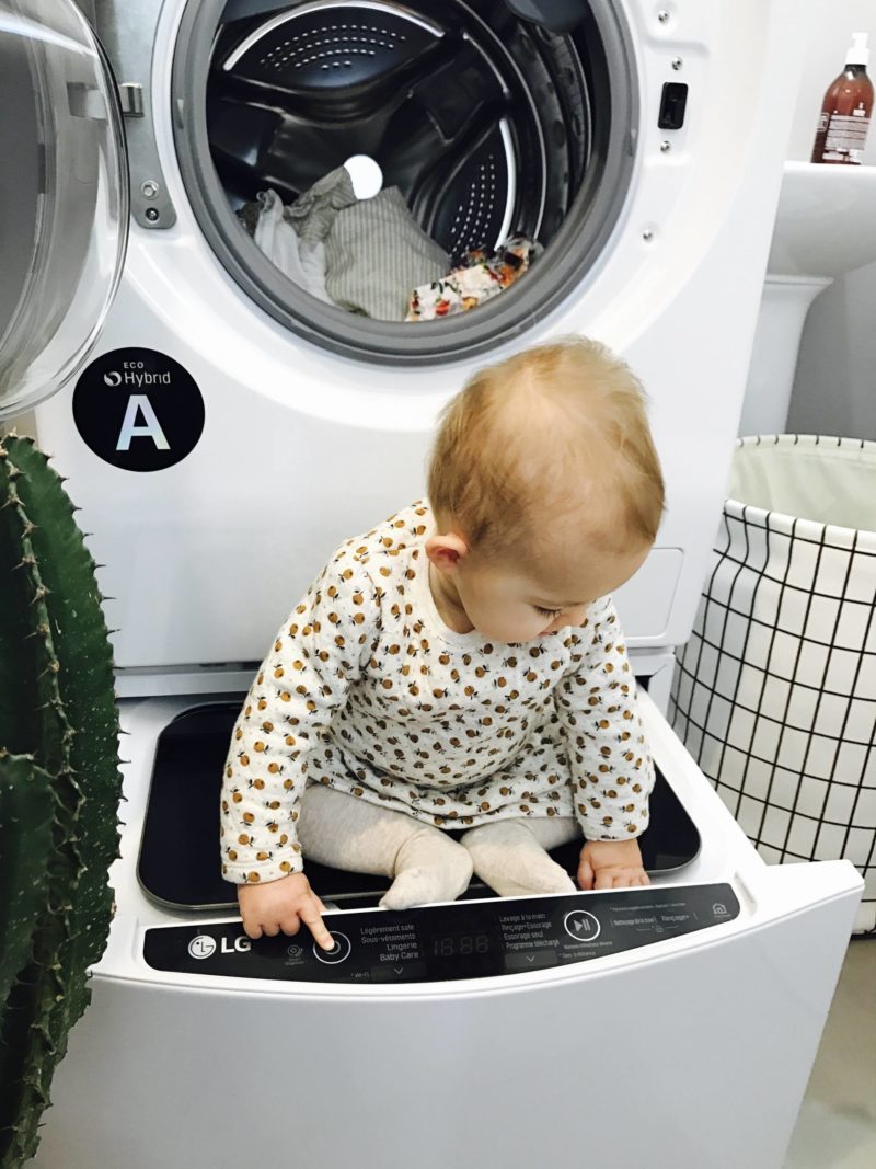 Dans le courant du mois d’octobre, LG m’a proposé de tester une nouvelle machine lavante-séchante, la LG TWINWASH™. Quand on m’a expliqué le concept, je me suis dit “waou, je vais gagner du temps !”. C’est vrai que pour moi, le soin du linge, c’est important, que ce soit pour préserver les matières délicates (vêtements en soie, en laine …) ou pour bien nettoyer les vêtements de Louise sans les abîmer ! Je me suis dit qu’elle avait l’air géniale cette machine et donc pourquoi pas vous partager quelque chose qui vous fera, comme à moi, gagner du temps ! Cette machine, c’est en fait deux machines en une ! La partie haute est une machine d’une contenance de 12 kgs. La différence est qu’il y a un deuxième tambour en dessous, plus petit, de 2 kgs, ce qui permet de dissocier les vêtements pendant qu’on fait tourner une machine. C’est simple, c’est juste l’idéal ! Ça fait depuis mon retour de Las Vegas qu’on la teste et c’est très pratique pour nous.