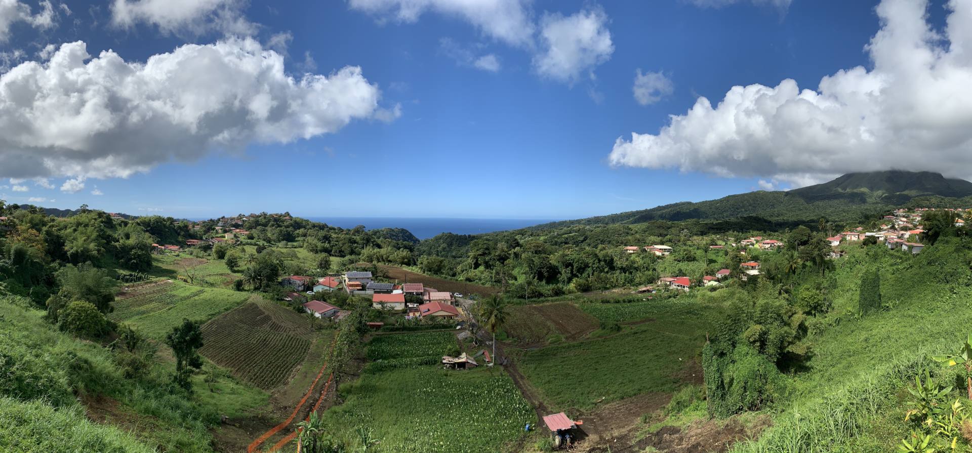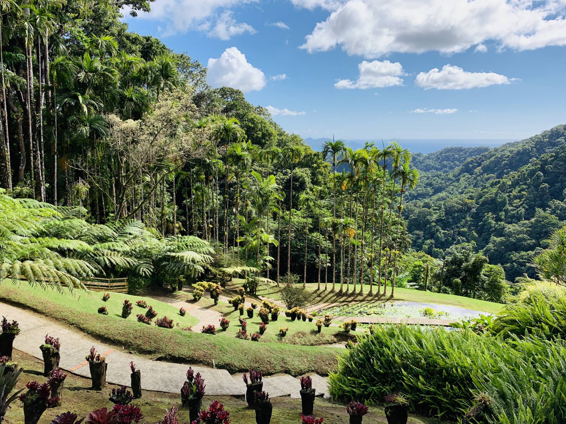Ce qu’on a préféré, c’est la Route de la Trace ! Pour deux raisons différentes ! Pendant que je faisais le Jardin de Balata, Stéphane allait à la découverte du volcan, direction la Montagne Pelée ! Le Jardin de Balata est au début de la Route de la Trace. C’est un superbe jardin botanique où il y a notamment d’immenses palmiers royaux ! Sublime ! Il faut compter 45 minutes pour en faire le tour. Si vous avez un bébé, privilégiez le porte-bébé à la poussette car il y a pas mal d’escaliers quand même ! C’est ce que j’aurais du faire. La Route de la Trace se poursuit entre une alternance de jolies vues sur l’intérieur de l’île et des passages dans une végétation très humide et dense, d’ailleurs, c’est marrant de regarder les variations de températures. Une fois arrivé à Morne-Rouge, il y a un magnifique point de vue sur la gauche avant l’église (photo panoramique juste en dessous), ne le ratez pas, c’est un chouette panorama, on voit jusqu’à la mer. Ensuite, on monte jusqu’au Refuge du Volcan, point de départ des randonnées menant au sommet. Stéphane a adoré la randonnée qu’il avait trouvée sur le guide. Il l’a trouvée très sympa et assez technique. Il faut de bonnes chaussures, notamment pour rescendre car c’est raide. Prévoyez aussi un gilet car il fait plus frais. Bon, ça reste des températures de Martinique, frais = 16-18 degrés !