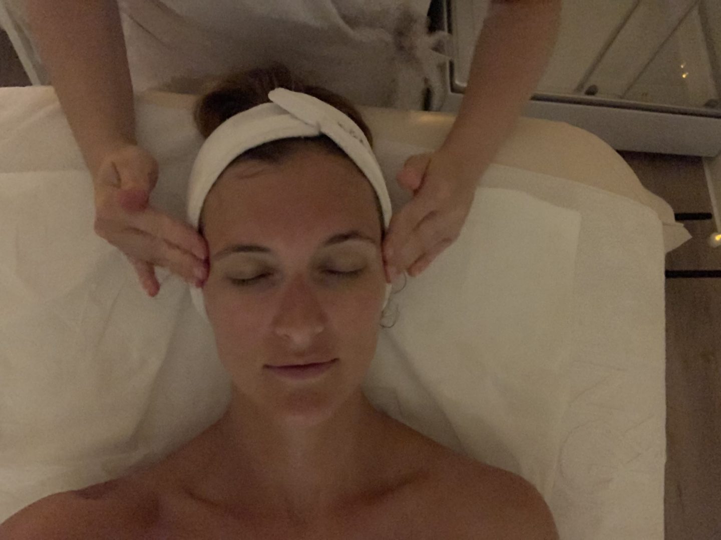 Côté soin, il était prévu un soin détox pour mon visage, mais avec la canicule, ma peau est déssêchée et assoifée en ce moment, avec plein de ridules de déshydratation, la peau inconfortable … Du coup, on est finalement parti sur un soin Hydralessence. Comme son nom l’indique, on part sur une hydratation intense, et j’en ai bien besoin. Pour les soins du visage, c’est la marque Yonka qui est utilisée. Des formules naturelles, des produits fabriqués en France et des odeurs délicieuses. Je connaissais déjà cette marque et j’ai été ravie d’en découvrir davantage. Le soin commence par l’application d’une compresse qui sent hyper bon et elle a mis une brume aux huiles essentielles de lavande, géranium, romarin, cyprès et thym. L’odeur était fraîche et très agréable ! Juste après, avec le visage encore humide, elle a appliqué un gommage végétal puis un masque sous un bain de vapeur. Ce n’est pas la vapeur chaude comme pour les nettoyages de peau, c’était tiède et bien plus agréable. Ensuite, elle m’a fait un modelage avant de faire un deuxième masquz hydratant sur le visage et le coup. L’odeur de cassis/fruits rouges était à tomber ! Il s’enlève comme une seconde peau mais sans le côté agressif des masques peeling. Très surprenant. Il est vraiment très efficace. En sortant, j’ai fait une story et vous étiez nombreuses à me dire que ma peau était bien plus eclatante, repulpée, lissée etc … c’est vrai qu’il correspond vraiment bien à ma peau ! Pour prolonger à la maison, je suis repartie avec le Masque n•1 de la marque, similaire à celui du soin, que je fais en sleeping mask, en cure de plusieurs jours ! Ça fait du bien.