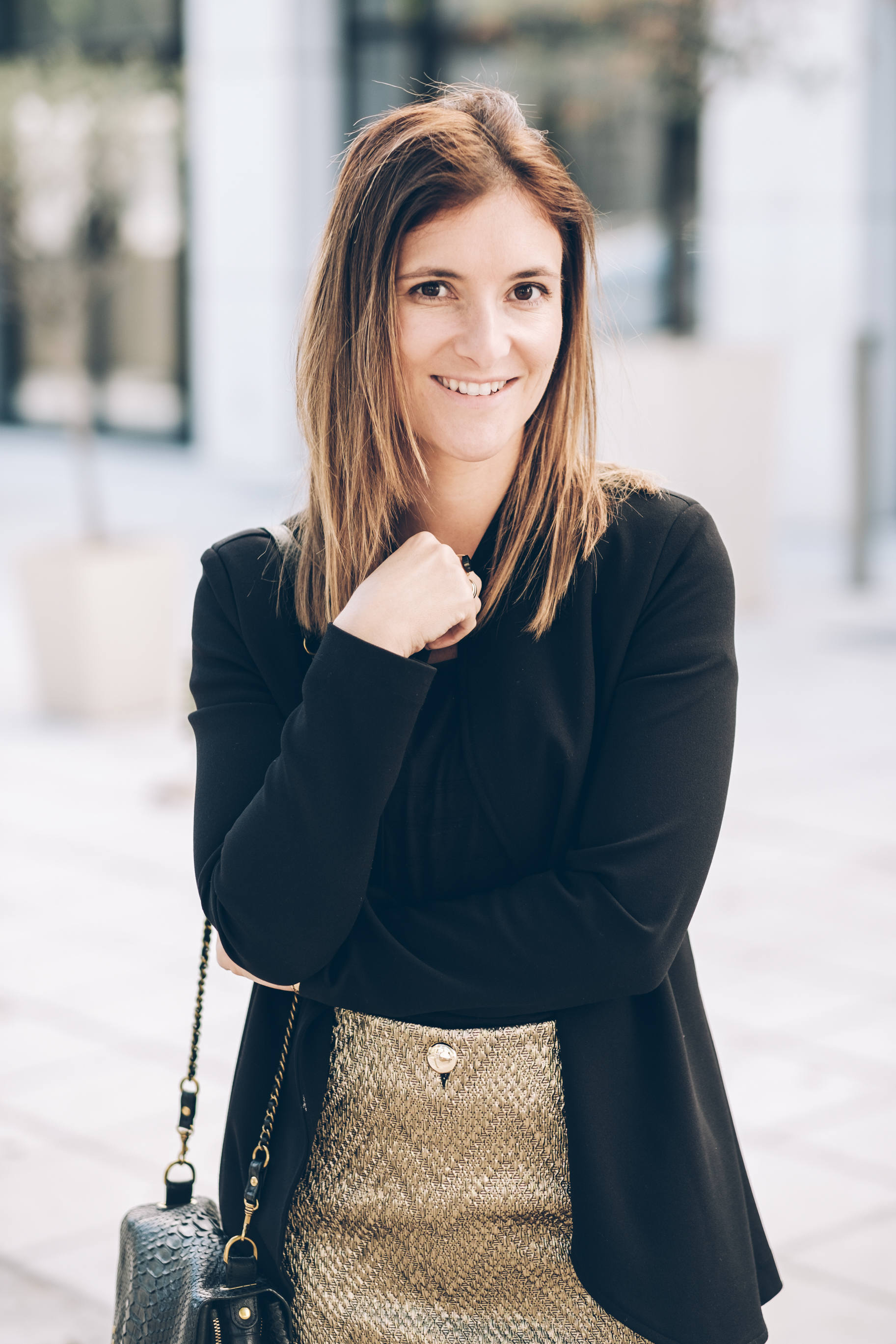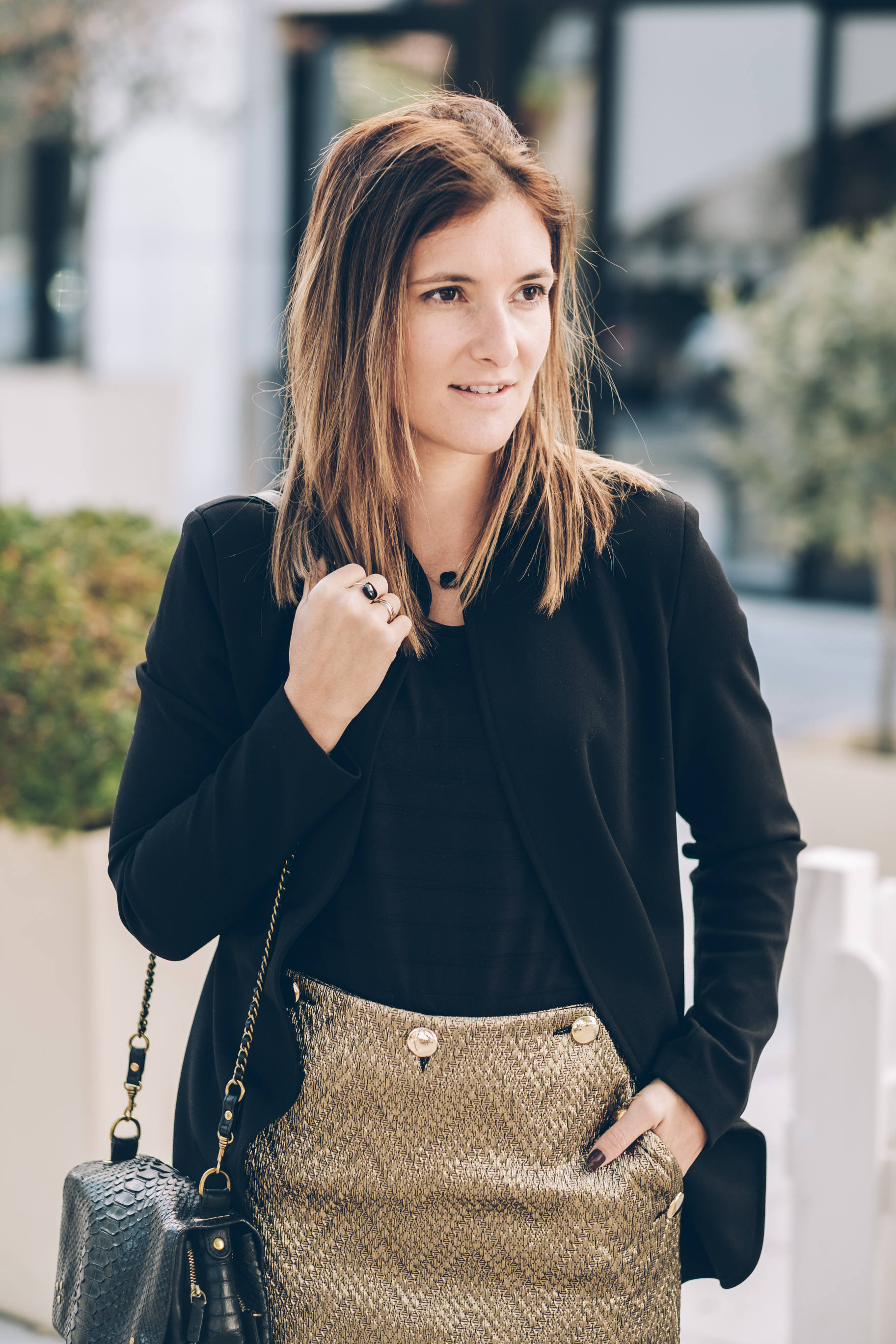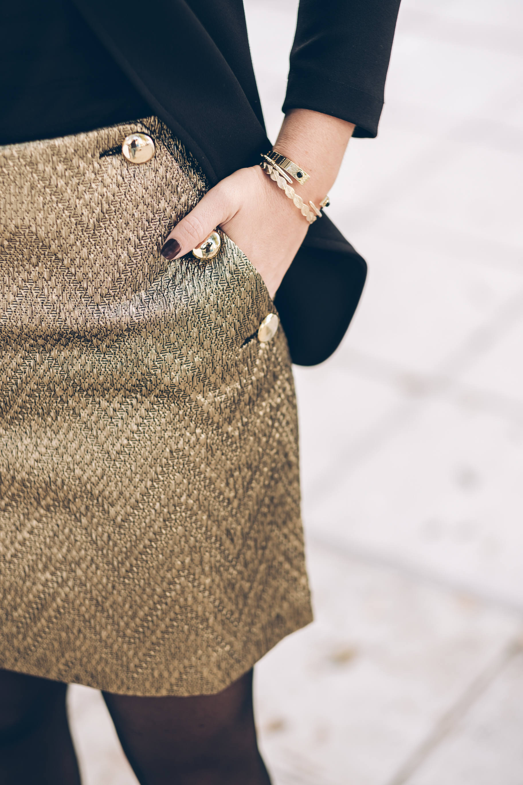 Pour ce look de fêtes, j’ai choisi de vous proposer mon look du jour de Noël avec une pièce forte, et des basiques ! Je n’ai jamais fait partie de celles qui achètent des tenues complètes pour Noël. Je préfère porter au maximum ce que j’ai déjà dans mon dressing, dans mes pièces de saison. Par contre, depuis que j’ai 10-12 ans, avec ma maman, on avait l’habitude d’acheter une pièce ou deux pour twister notre tenue, avoir quelque chose de nouveau et de plus festif. J’adore la couleur dorée ! D’ailleurs, chez ma grand-mère, il y a une photo d’un Noël où j’ai 13 ans environ, et j’avais un top noir et doré. Je m’en souviens car je l’ai adoré. Tout cela pour vous dire que cette année encore, je me tourne vers du doré pour la pièce forte de mon look, avec cette jupe incroyable ! C’est plus qu’un coup de coeur, je l’adore vraiment beaucoup. C’est une jupe en jacquard doré donc une matière que j’adore, un superbe rendu, et une finition magnifique avec de gros boutons dorés comme j’ai déjà sur un pull. Vraiment, c’est une très jolie pièce pour les fêtes. Je vous conseille de prendre votre taille habituelle ou celle en-dessous si vous êtes entre deux tailles. Comme toujours, j’aime choisir des pièces que je reporterai par la suite. Celle-ci est facilement portable en dehors des fêtes en cassant le côté festif avec un petit pull, des chaussures plates ou autres ! Je porte avec ma jupe un tee-shirt fluide dans une matière fine. Je trouve que c’est toujours élégant en toutes circonstances. Par dessus, un blazer noir mais sans col. J’adore ! Si vous avez un blazer avec de jolies finitions type col en velours, ça peut aussi être très beau ! Côté accessoires, je porterai mes escarpins noirs achetés cette saison, mon sac adoré, le Bobi python, et des bijoux dorés et noirs !