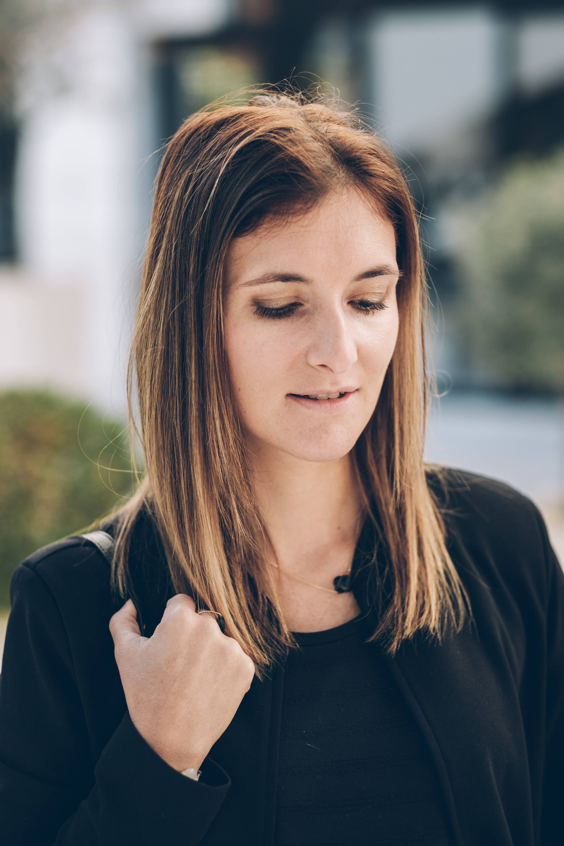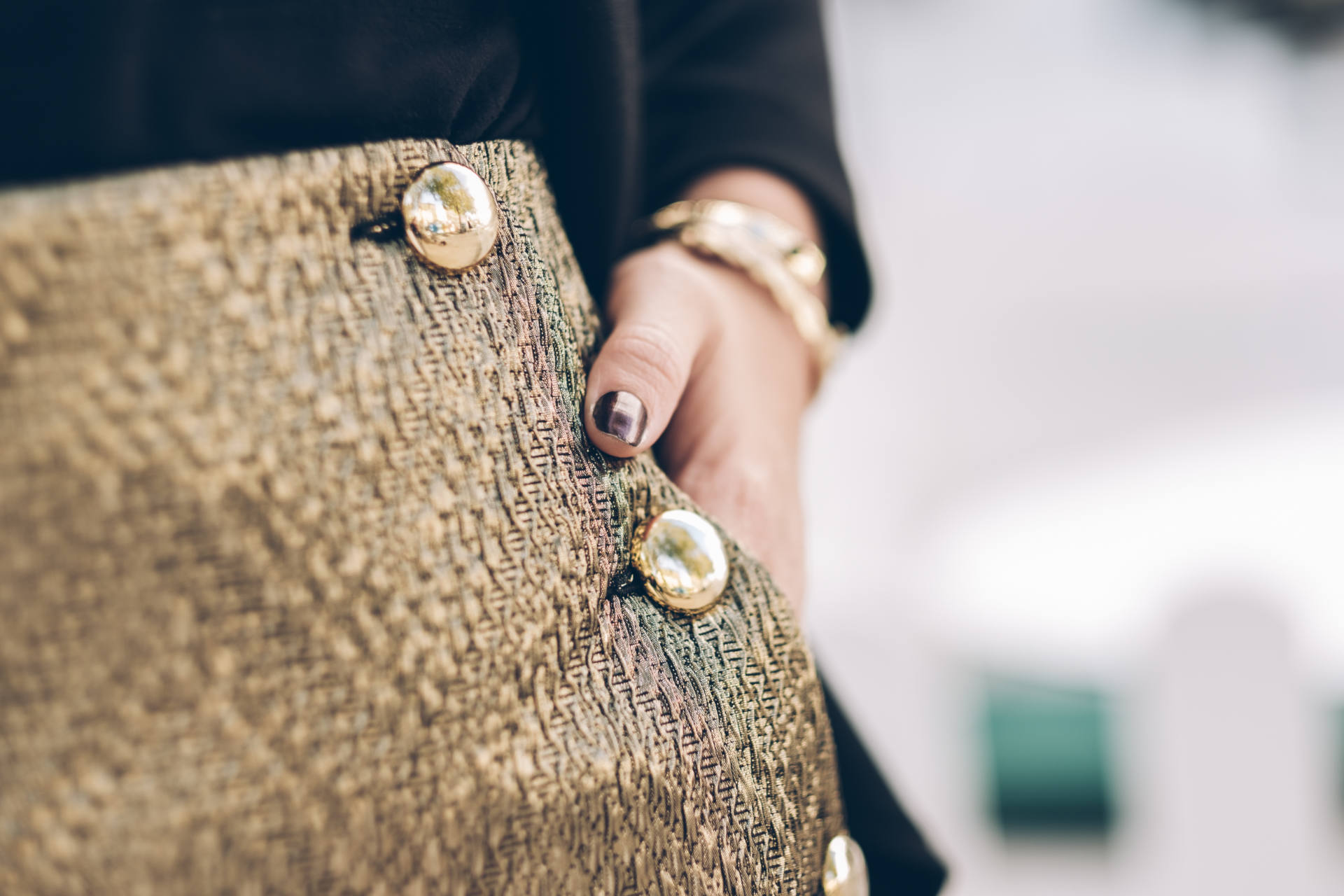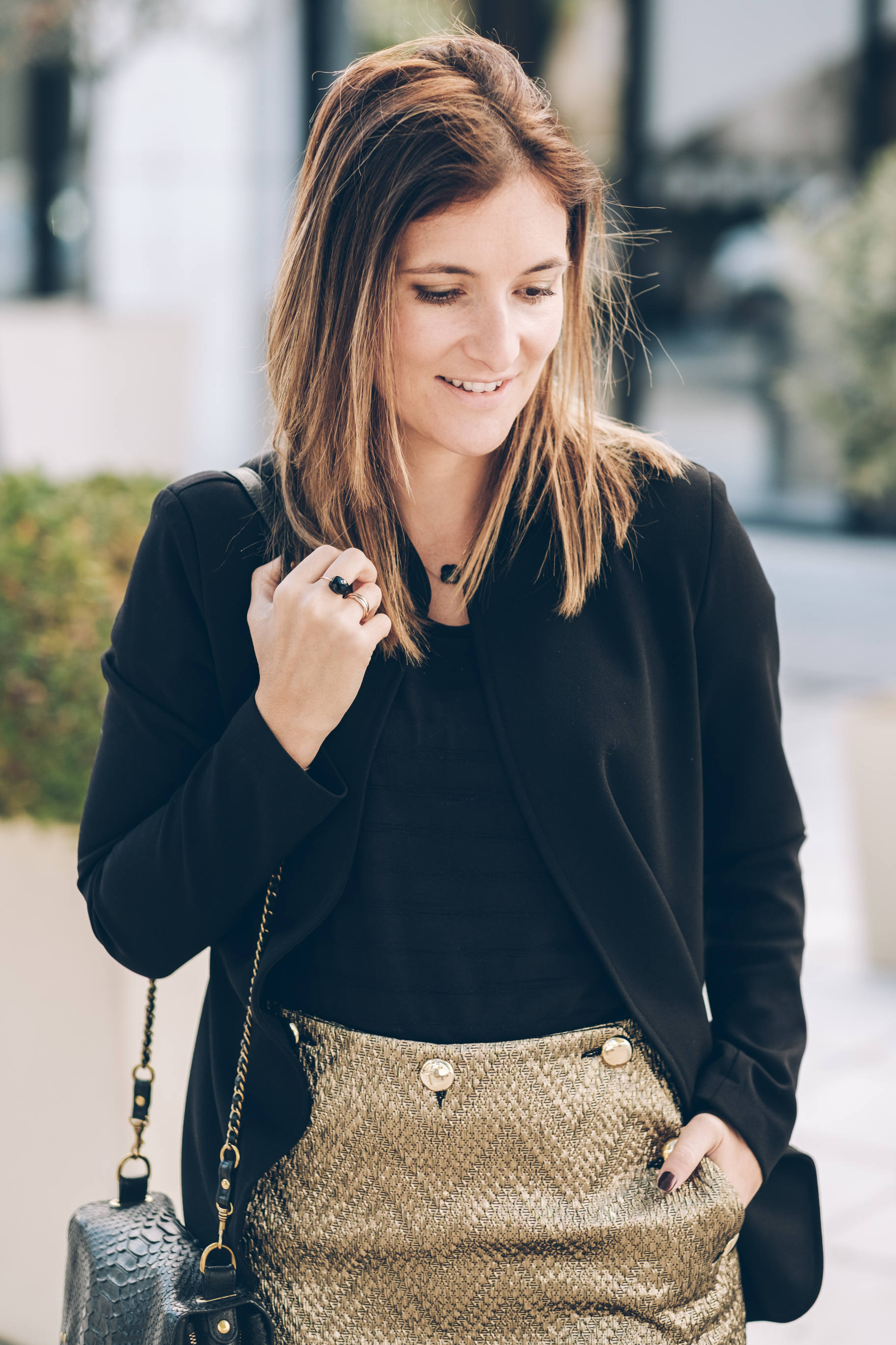 Pour ce look de fêtes, j’ai choisi de vous proposer mon look du jour de Noël avec une pièce forte, et des basiques ! Je n’ai jamais fait partie de celles qui achètent des tenues complètes pour Noël. Je préfère porter au maximum ce que j’ai déjà dans mon dressing, dans mes pièces de saison. Par contre, depuis que j’ai 10-12 ans, avec ma maman, on avait l’habitude d’acheter une pièce ou deux pour twister notre tenue, avoir quelque chose de nouveau et de plus festif. J’adore la couleur dorée ! D’ailleurs, chez ma grand-mère, il y a une photo d’un Noël où j’ai 13 ans environ, et j’avais un top noir et doré. Je m’en souviens car je l’ai adoré. Tout cela pour vous dire que cette année encore, je me tourne vers du doré pour la pièce forte de mon look, avec cette jupe incroyable ! C’est plus qu’un coup de coeur, je l’adore vraiment beaucoup. C’est une jupe en jacquard doré donc une matière que j’adore, un superbe rendu, et une finition magnifique avec de gros boutons dorés comme j’ai déjà sur un pull. Vraiment, c’est une très jolie pièce pour les fêtes. Je vous conseille de prendre votre taille habituelle ou celle en-dessous si vous êtes entre deux tailles. Comme toujours, j’aime choisir des pièces que je reporterai par la suite. Celle-ci est facilement portable en dehors des fêtes en cassant le côté festif avec un petit pull, des chaussures plates ou autres ! Je porte avec ma jupe un tee-shirt fluide dans une matière fine. Je trouve que c’est toujours élégant en toutes circonstances. Par dessus, un blazer noir mais sans col. J’adore ! Si vous avez un blazer avec de jolies finitions type col en velours, ça peut aussi être très beau ! Côté accessoires, je porterai mes escarpins noirs achetés cette saison, mon sac adoré, le Bobi python, et des bijoux dorés et noirs !