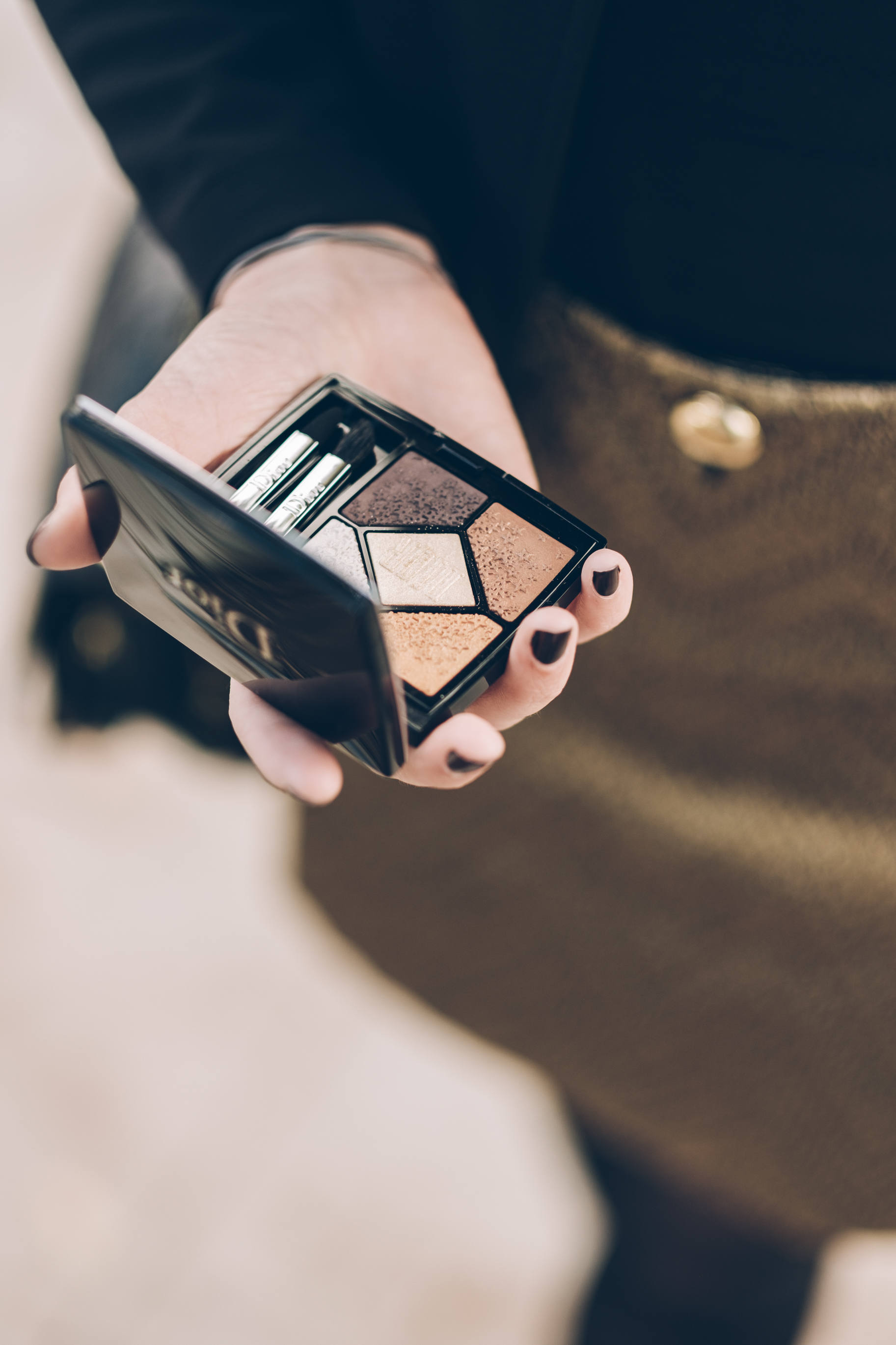 Côté make-up, je porte les teintes brunes/dorées de la palette Midnight Wish de Dior que je vous avais présentée en story. J’en suis amoureuse. Cet automne, je porte beaucoup de beige, de marron pour mon maquillage. Cette palette de fêtes est dingue, avec au centre une teinte dorée pailletée que j’aime beaucoup ! Je sais que certaines d’entre vous l’ont achetée ! Malheureusement, elle est sold out en ligne ! Peut-être dispo en points de ventes ! Sachez que si vous commandez des produits Dior sur leur site ou dans les Grands Magasins avec un corner de la marque, vous aurez les belles boîtes comme celles que je reçois et que vous adorez chaque fois ! Je trouve que ça fait un plus quand on offre un paquet, plutôt qu’avoir un emballage du magasin où on fait son shopping !