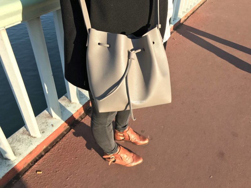 Pour cette tenue mi-automne, mi-hiver, je porte mon jean de grossesse préféré, celui que ma collègue m’a prêté et qui est vraiment très agréable à porter. Je l’associe avec une chemise blanche à carreaux que j’ai achetée pendant l’été. Je suis contente de pouvoir toujours la mettre car je l’adore et je trouve qu’elle est parfaite pour l’hiver, elle donne un coup de lumière ! J’ai quand même mis un manteau pour le plaisir car à Nice, je n’ai pas trop l’occasion de porter cette pièce que j’adore. Je l’ai shoppé chez Sandro il y a maintenant 3 ans et c’était la première fois que je m’offrais un beau manteau. Et franchement, je ne suis pas déçue. C’est sa quatrième saison, il se tient à la perfection, la qualité n’a pas bougé d’un poil, il est toujours aussi chaud et il me plait toujours autant ! Le tout avec mes petites boots d’amour sur lesquelles vous êtes nombreuses à avoir craqué et mon sac bourse gris que vous aviez déjà vu par ici !