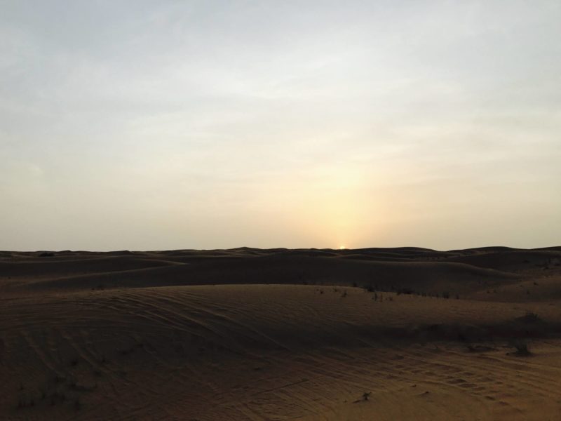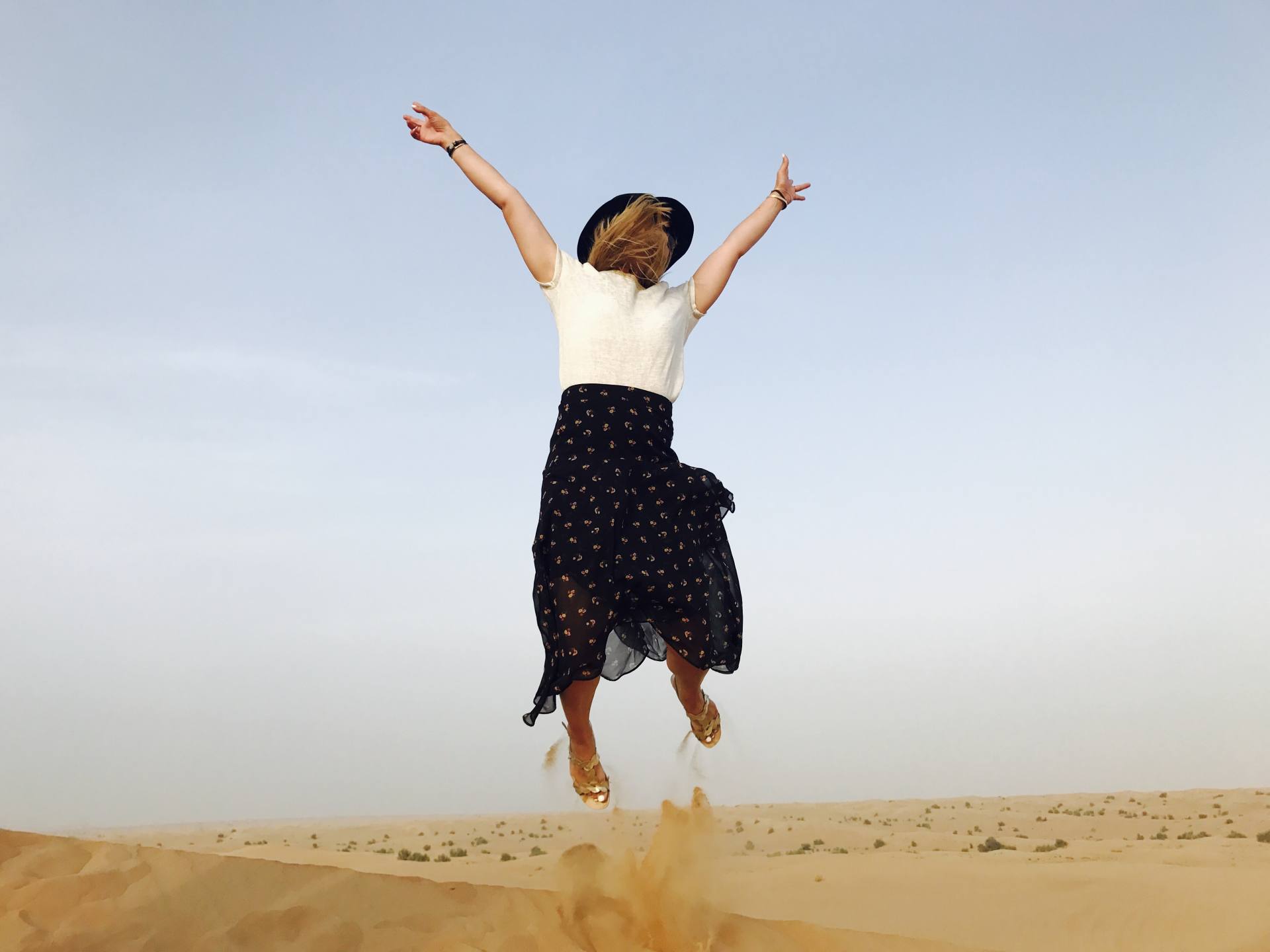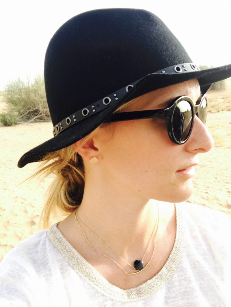 L’après-midi et le soir, pour aller dans le désert, j’ai opté pour une jupe mi-longue et fluide, plutôt légère, avec des sandales. En haut, je portais un top blanc et doré ouvert dans le dos, que j’aime beaucoup en ce moment ! Un look simple, frais, idéal pour le lieu ! Évidemment, j’ai pris un chapeau, ça tape fort à Dubaï !