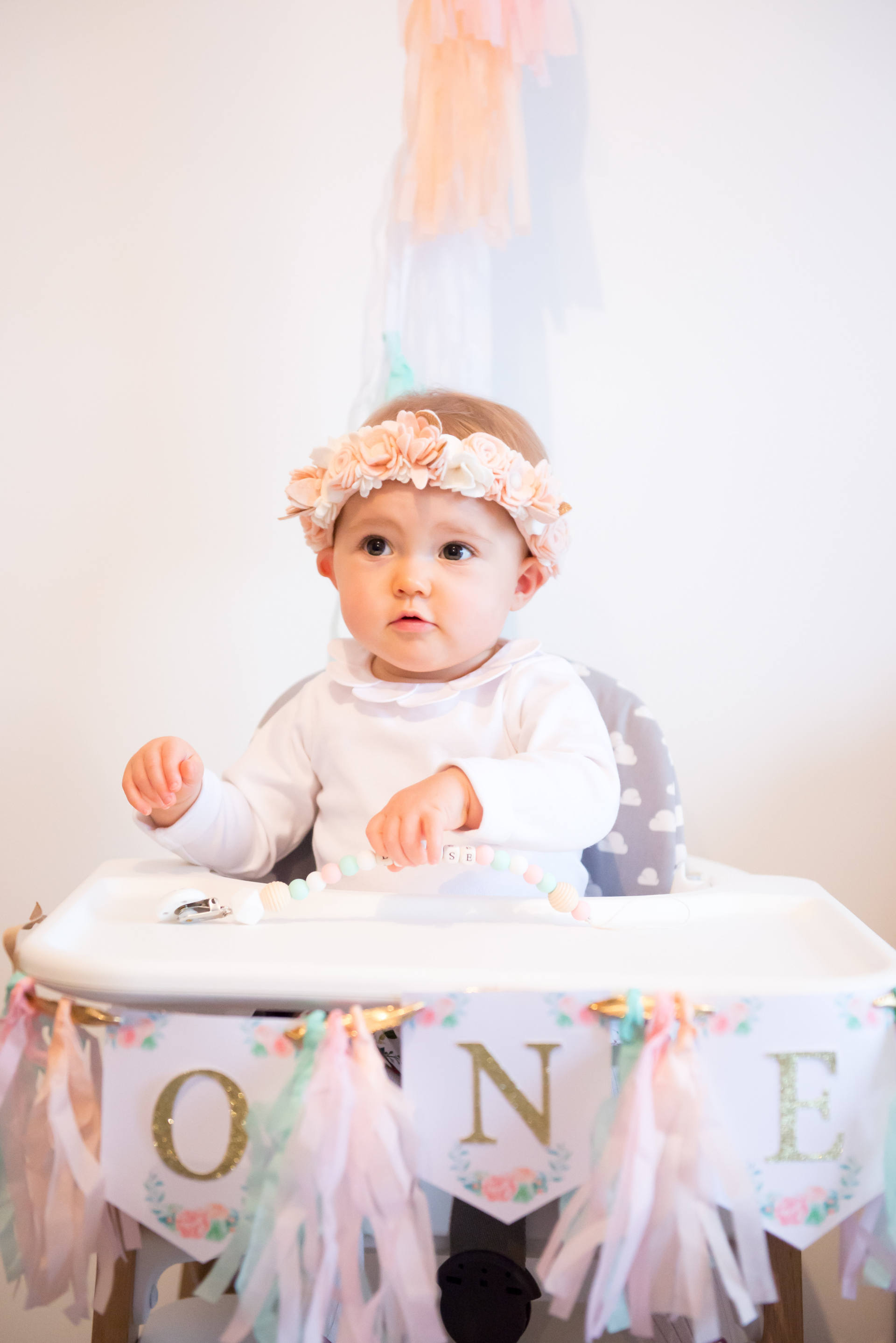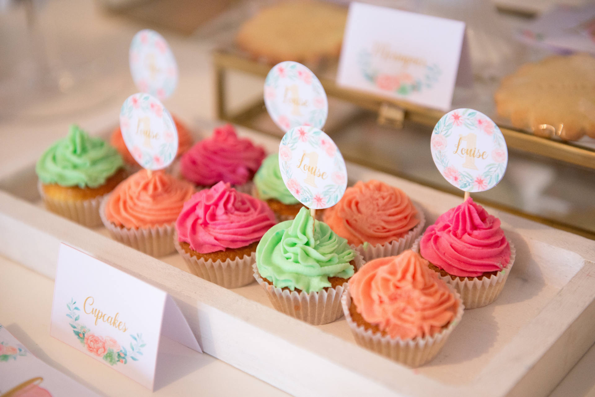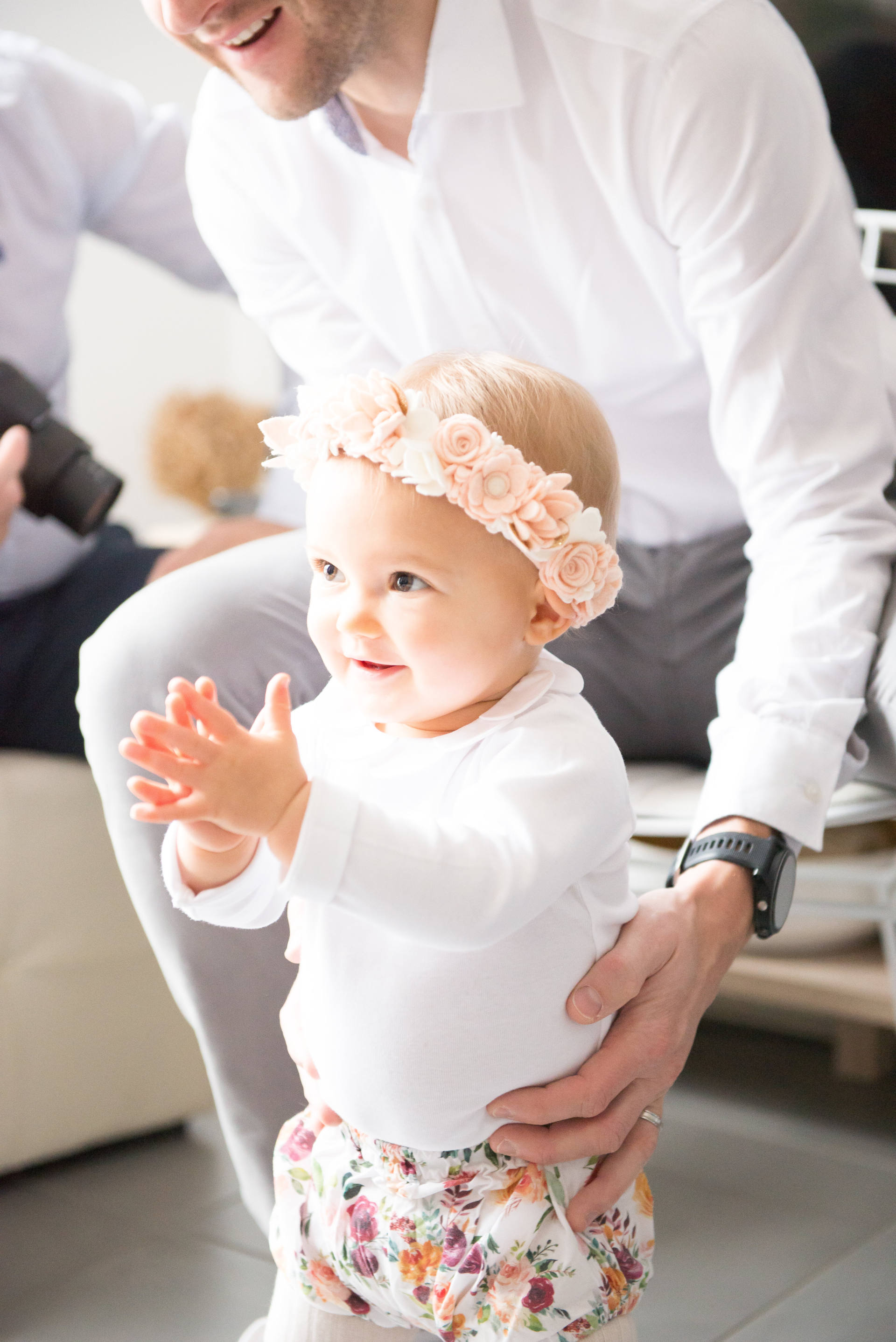 Pour Louise, j’avais quelques idées. Je passe beaucoup de temps sur Pinterest, j’adore les jolies tables d’anniversaire, de mariages et autres types d’évènements. Autant pour la welcome baby party, j’avais envie de rester dans des tons neutres et doux, autant cette fois, j’avais envie de couleurs. Louise devient une petite fille avec du peps, de l’énergie, je voulais que sa petite fête d’anniversaire soit à son image ! J’aime beaucoup le mint, le rose poudré, le pêche et le vert plus vif. J’avais vu quelques photos sur Pinterest alors je les ai envoyées à Happy Confetti qui a beaucoup aimé ce thème. Ensuite, je leur ai fais confiance et je n’ai rien vu. Le jour J, je les ai vues arriver avec plein de cartons. Au fur et à mesure que la décoration s’installait, c’était le bonheur, tout était vraiment superbe. Louise voulait toucher à tout déjà, ça semblait bien lui plaire. Pendant cette matinée, petite Loulou a joué à l’étage, puis comme si elle avait une horloge dans la tête, elle a mangé à 12h puis fait 1h30 de sieste. Juste ce qu’il fallait pour être en forme à 14h à l’arrivée de nos amis et des grands-parents. J’ai pris le temps de l’habiller : un petit boomer et un body avec un joli col, une petite paire de chaussures et hop, elle était prête. Juste pour faire la photo, j’ai voulu lui mettre un joli bandeau mais je savais que ça ne durerait que 2 minutes car elle passe son temps à les enlever. Et là, je sais pas pourquoi, elle l’a finalement gardé. Je crois qu’elle n’a pas capté que je lui avais mis vu qu’elle venait de se réveiller. J’adore sa petite moue endormie, je la trouve tellement choukinette. Je trouve que commencer à 14h était une bonne idée car une après-midi, ça suffit pour un bébé. C’est déjà beaucoup d’attention et beaucoup de sollicitations. On a commencé par dire bonjour à tout le monde et je lui ai montré sa jolie table avec des sablés, des bonbons, des chocolats. Tout y était et même si elle ne se rend pas encore compte, je peux vous dire qu’elle était contente de voir toutes ces couleurs et de goûter à tout ça ! Les filles d’Happy Confetti ont vraiment été top car elles ont pensé à décoré sa chaise haute avec une jolie guirlande ONE, des franges en papier et un ballon. C’était vraiment trop mignon. Du coup, on en a profité pour sortir le gâteau. Et là, croyez-moi ou non, j’avais pensé à tout, sauf à une bougie ! Le cake topper du gâteau était tellement beau qu’il se suffisait à lui-même. Elles l’ont reproduit quasiment à l’identique d’une des photos repérées sur Instagram. Et je leur tire mon chapeau, il était superbe !! Il allait parfaitement sur le magnifique gâteau mascarpone-vanille, une merveille créée par Cupcakes & Confetti ! J’ai eu de la chance car la merveilleuse pâtissière qui crée ces naked cakes que j’adore est enceinte, et le 14 janvier, c’était son dernier jour avant le congé maternité ! Un signe ! Habituellement, ces gâteaux sont plus beaux que bons mais alors là, tout le monde était d’accord pour dire qu’il était délicieux car plus léger que ce qu’on imaginait. Ce n’est pas Louise qui dira le contraire vu qu’elle a mangé une part entière, la même que pour les invités ! Je lui ai servi mais je pensais qu’elle grignoterait juste un peu. Au bout d’un moment, mon père me dit “Tu crois pas qu’elle va faire une indigestion, c’est gros et elle s’arrête pas !”. Du coup, je lui ai enlevé juste avant qu’elle ne finisse et elle s’est vraiment régalée. Du coup, je lui avais planté une “bougie qui crépite”, mon père en avait pris à Noël et ça l’avait beaucoup fait rire ! Ce sera un souvenir :).