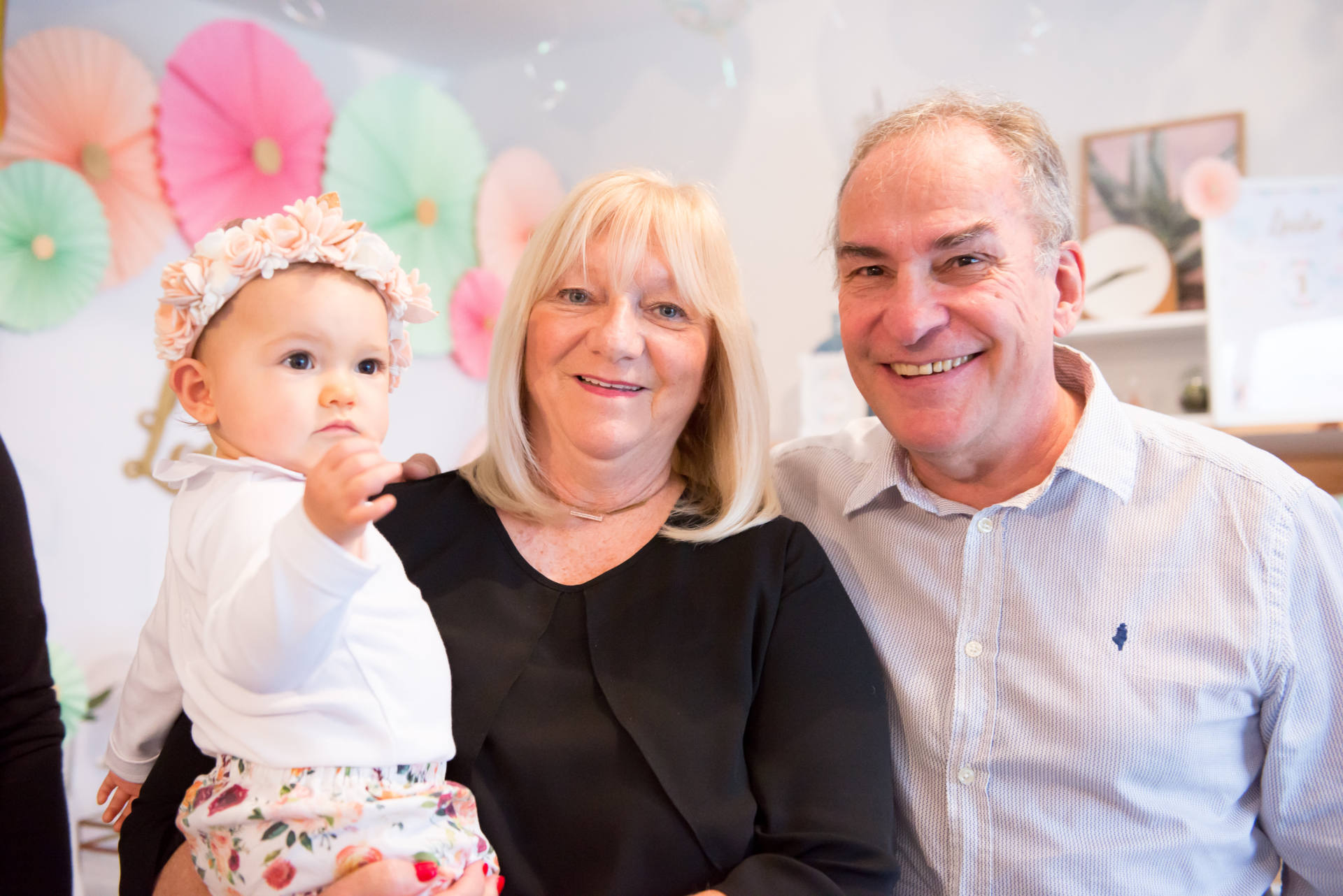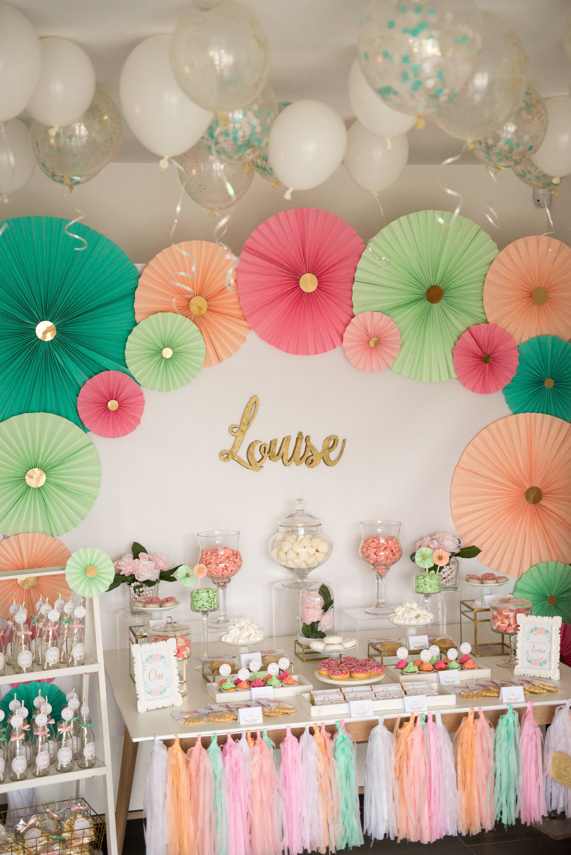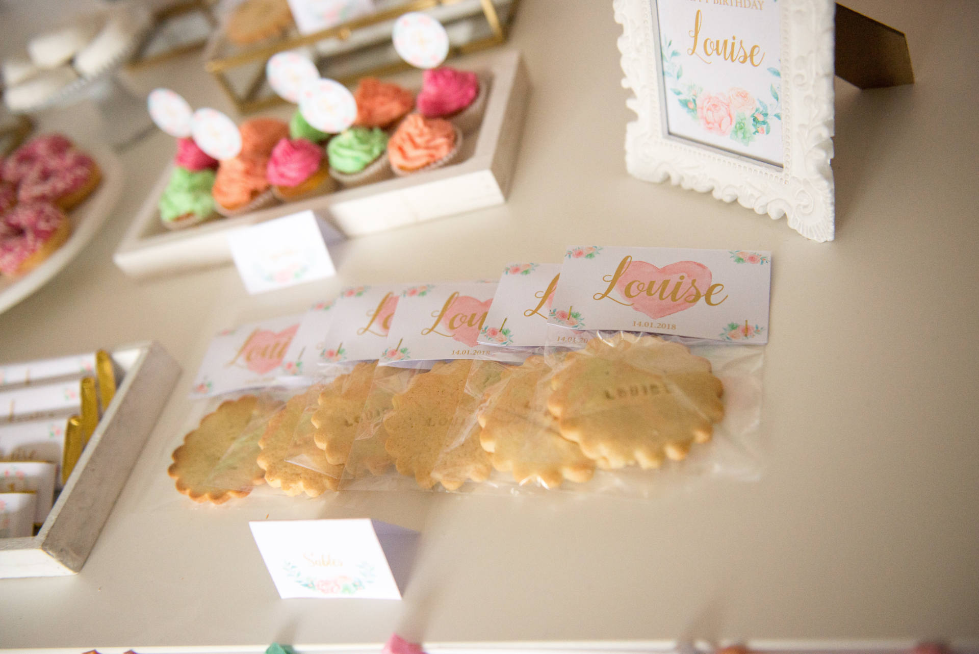 Pour Louise, j’avais quelques idées. Je passe beaucoup de temps sur Pinterest, j’adore les jolies tables d’anniversaire, de mariages et autres types d’évènements. Autant pour la welcome baby party, j’avais envie de rester dans des tons neutres et doux, autant cette fois, j’avais envie de couleurs. Louise devient une petite fille avec du peps, de l’énergie, je voulais que sa petite fête d’anniversaire soit à son image ! J’aime beaucoup le mint, le rose poudré, le pêche et le vert plus vif. J’avais vu quelques photos sur Pinterest alors je les ai envoyées à Happy Confetti qui a beaucoup aimé ce thème. Ensuite, je leur ai fais confiance et je n’ai rien vu. Le jour J, je les ai vues arriver avec plein de cartons. Au fur et à mesure que la décoration s’installait, c’était le bonheur, tout était vraiment superbe. Louise voulait toucher à tout déjà, ça semblait bien lui plaire. Pendant cette matinée, petite Loulou a joué à l’étage, puis comme si elle avait une horloge dans la tête, elle a mangé à 12h puis fait 1h30 de sieste. Juste ce qu’il fallait pour être en forme à 14h à l’arrivée de nos amis et des grands-parents. J’ai pris le temps de l’habiller : un petit boomer et un body avec un joli col, une petite paire de chaussures et hop, elle était prête. Juste pour faire la photo, j’ai voulu lui mettre un joli bandeau mais je savais que ça ne durerait que 2 minutes car elle passe son temps à les enlever. Et là, je sais pas pourquoi, elle l’a finalement gardé. Je crois qu’elle n’a pas capté que je lui avais mis vu qu’elle venait de se réveiller. J’adore sa petite moue endormie, je la trouve tellement choukinette. Je trouve que commencer à 14h était une bonne idée car une après-midi, ça suffit pour un bébé. C’est déjà beaucoup d’attention et beaucoup de sollicitations. On a commencé par dire bonjour à tout le monde et je lui ai montré sa jolie table avec des sablés, des bonbons, des chocolats. Tout y était et même si elle ne se rend pas encore compte, je peux vous dire qu’elle était contente de voir toutes ces couleurs et de goûter à tout ça ! Les filles d’Happy Confetti ont vraiment été top car elles ont pensé à décoré sa chaise haute avec une jolie guirlande ONE, des franges en papier et un ballon. C’était vraiment trop mignon. Du coup, on en a profité pour sortir le gâteau. Et là, croyez-moi ou non, j’avais pensé à tout, sauf à une bougie ! Le cake topper du gâteau était tellement beau qu’il se suffisait à lui-même. Elles l’ont reproduit quasiment à l’identique d’une des photos repérées sur Instagram. Et je leur tire mon chapeau, il était superbe !! Il allait parfaitement sur le magnifique gâteau mascarpone-vanille, une merveille créée par Cupcakes & Confetti ! J’ai eu de la chance car la merveilleuse pâtissière qui crée ces naked cakes que j’adore est enceinte, et le 14 janvier, c’était son dernier jour avant le congé maternité ! Un signe ! Habituellement, ces gâteaux sont plus beaux que bons mais alors là, tout le monde était d’accord pour dire qu’il était délicieux car plus léger que ce qu’on imaginait. Ce n’est pas Louise qui dira le contraire vu qu’elle a mangé une part entière, la même que pour les invités ! Je lui ai servi mais je pensais qu’elle grignoterait juste un peu. Au bout d’un moment, mon père me dit “Tu crois pas qu’elle va faire une indigestion, c’est gros et elle s’arrête pas !”. Du coup, je lui ai enlevé juste avant qu’elle ne finisse et elle s’est vraiment régalée. Du coup, je lui avais planté une “bougie qui crépite”, mon père en avait pris à Noël et ça l’avait beaucoup fait rire ! Ce sera un souvenir :).