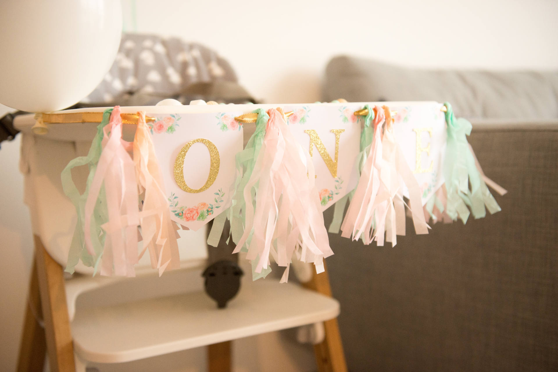 Revenons-en à ce premier anniversaire. Ça fait tout drôle de ne plus compter en mois et d’arriver à ce premier cap ! C’est quand même un bel anniversaire donc on a eu envie de faire une jolie fête dont on se souvienne et qu’on pourra lui raconter plus tard ! En septembre, j’ai fait un vide-dressing où une personne est venue échanger avec moi sur son concept d’organisation d’anniversaires (et autres fêtes) pour les bébés : Happy Confetti. Rien que le nom, ça donne du peps et ça m’a donné envie d’en savoir plus. J’ai trouvé leur idée géniale ! Elles proposent des boxs 100% personnalisables. Franchement, combien de fois j’ai passé des heures à chercher de la déco festive sur internet. Au final, j’achète plein de trucs, ça revient cher et ce n’est pas forcément à la hauteur de mes attentes. Je pense qu’elles se sont inspirées de ça car leur idée est géniale. Pour 10 personnes et pour 65€, elles envoient une box qui contient une belle décoration pour une jolie table d’anniversaire complètement personnalisée. Il suffit de leur donner un thème : soit des couleurs, soit une personnage, ou autres. Dans chaque box, il y a : le prénom de l’enfant, 10 gobelets personnalisés & 10 pailles personnalisées, 10 assiettes de couleur unie & 10 serviettes de couleur unie, 1 guirlande de franges, 1 guirlande de fanions, 9 ballons en latex, 6 pompons en soie, 1 sachet de confettis et un 1 mode d’emploi. Si on veut aller plus loin et que le budget le permet, on peut ajouter des petits chocolats personnalisés, des ballons gonflés à l’hélium avec un chiffre, des bouteilles en verre, des boîtes à pop-corns, des cadeaux d’invités … Si c’est une occasion particulière et que le budget est plus conséquent, on peut aller jusqu’à la prestation sur place. C’est ce qu’on a fait. Les filles d’Happy Confetti sont venues chez nous le matin, elles ont tout installé puis tout désinstallé le lendemain. Si on manque d’inspiration ? Il y a des dizaines de thèmes montrées en exemple sur le site ! Pour ce type de service, il faut compter 300€ minimum. Pourquoi pas pour des 1 an, des 10 ans, un baptême ou tout autre évènement marquant.