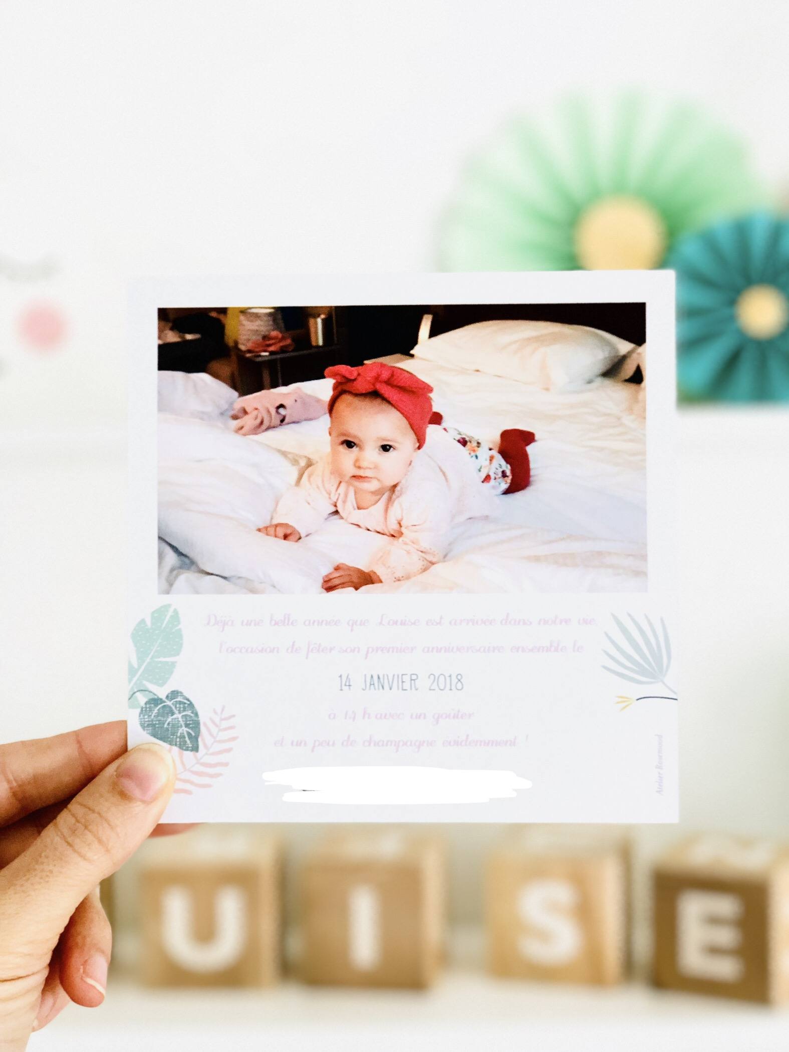 Avant toute chose, j’ai eu envie, pour cet anniversaire, de faire un carton d’invitation. Quand j’étais petite, mes parents faisaient mon anniversaire avec mes copines à la maison ou dans un parc, et il y avait toujours des petites cartes d’invitation à donner aux copines à l’école. Je trouve que c’est mignon. Je sais pas vous, mais moi, j’adore recevoir une invitation papier, une carte postale. Cette année, des amis nous ont même envoyés une carte de voeux avec des photos d’eux, on a trop adoré ! C’est pour ça que j’ai eu envie de faire des petites cartes. Comme d’habitude, j’avais envie de quelque chose de floral et j’ai trouvé mon bonheur sur Atelier Rosemood. C’est LE site que je préfère pour les faire-parts, les invitations, les remerciements, les cartes de voeux et tout ce qui est papeteries. Il y a les grands classiques mais aussi des créations bien plus originales, il y a régulièrement des nouveautés et il y a autant de choix pour les garçons que pour les filles ! Pour 20 invitations personnalisés + les enveloppes assorties, le tout avec un beau papier, il faut compter 40€. Je trouve que le rapport qualité prix est super bon. Je vous ai mis les photos bien sûr ! Vous êtes nombreuses à avoir commandé des faire-parts sur ce site après notre Welcome Baby Party et je n’ai eu que des retours positifs !