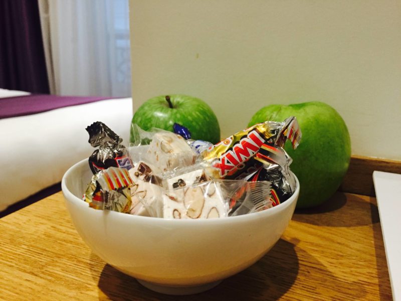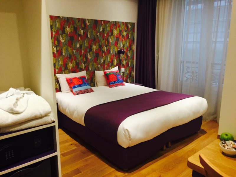 Trouver un hôtel à Paris, c’est pas toujours facile. Il faut que ce soit bien placé, mais pas dans un endroit trop touristique. Il faut être central sans que ce soit trop bruyant. Bref, le niveau d’exigence est toujours un peu haut ! Cette fois, on avait envie d’un hôtel cosy, sympa et au calme parce qu’on avait aussi envie d’être tranquille. Et en arrivant, première bonne surprise, l’hôtel est dans une petite ruelle du côté de Pigalle. Résultat, un calme absolu ou quasiment ! Après quelques pas dans cette petite rue pavée, l’hôtel arrive. A l’accueil, la déco est vraiment chouette et on est tout de suite bien reçu par le réceptionniste. Direction le 2ème étage où on découvre une chambre trop mignonne dans un style simple, bohème avec des touches de liberty. Je suis étonnée de voir que la chambre est spacieuse, on est plutôt habitué aux espaces riquiqui à Paris ! Avec des petites gourmandises à l’entrée de la chambre, ça commençait plutôt bien !