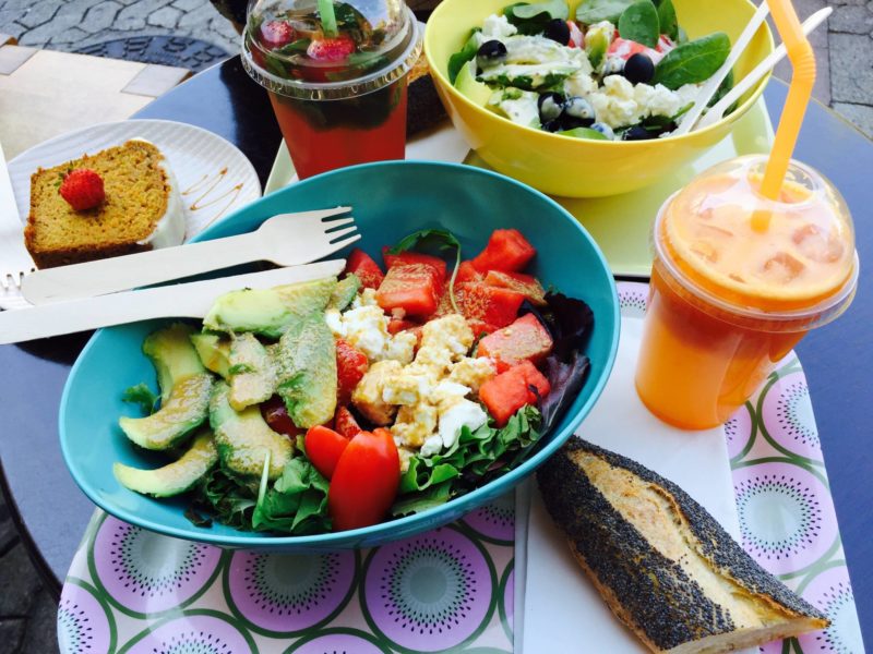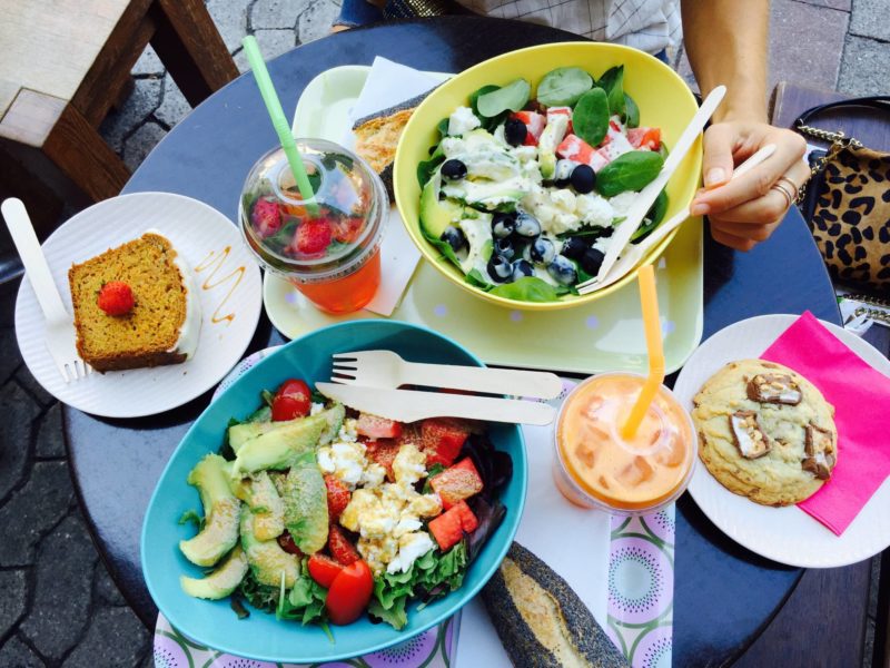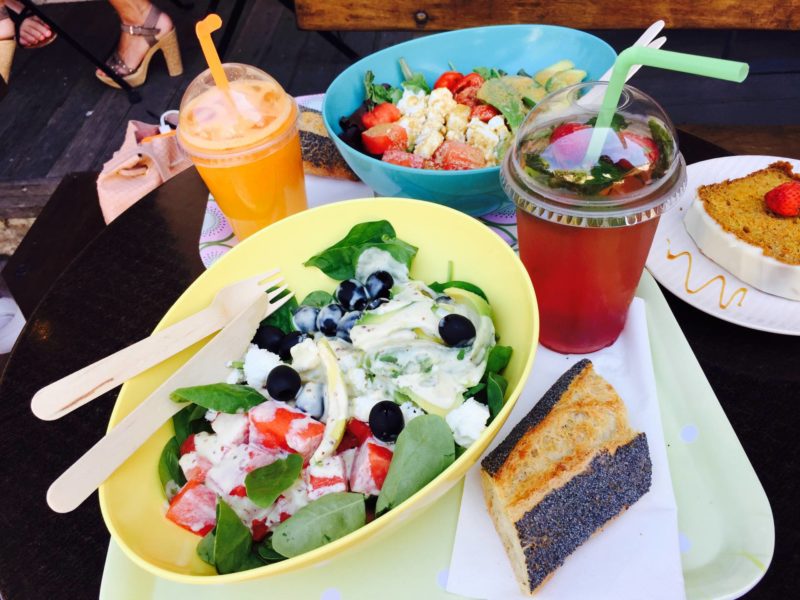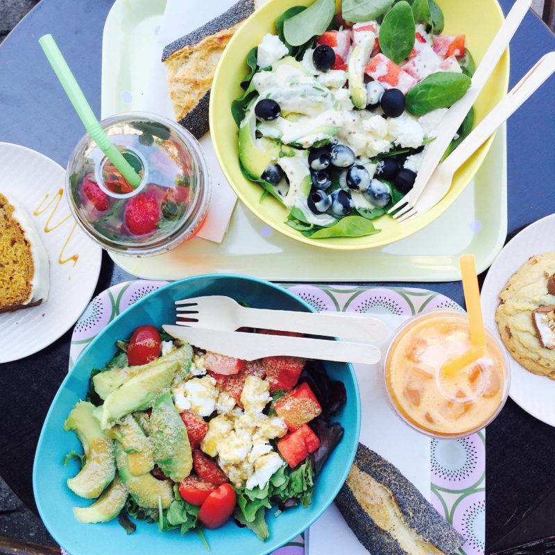 Pour ce petit summer lunch au Lucky Break Coffee, on a pris une salade composée nous-mêmes au salade bar. Elles sont servies dans un saladier, elles sont vraiment copieuses ! Et pour vous donner un ordre de prix, les nôtres ont coûté 8,50€ chacune donc vraiment accessibles ! Il y a aussi des sandwichs, draps, petits-déjeuners, assiettes brunchs, smoothies, thés glacés et bien sûr, plein de pâtisserie de folie ! Avec nos salades, on a pris un smoothie ACE pour moi et une iced tea hibiscus fraises et menthe pour Caro. Evidemment, on a goûté les desserts qui étaient vraiment délicieux ! Un cookie snnickers (de folie !) et un carrot cake qu’on a partagés ! Bon, j’ai pas pensé de les prendre en photo, ou plutôt j’ai eu cette pensée une fois qu’on avait commencé à se goinfrer ! Bref, il faudra que je revienne pour un breakfast ou un brunch !
