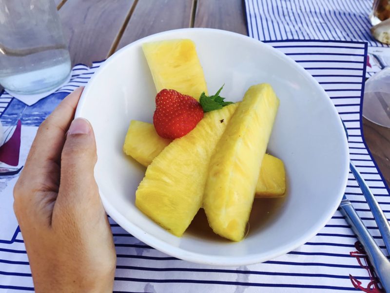 Depuis peu, juste à côté, le Bay Star a ouvert sa plage : le Bay Star Beach ! La seule plage de sable à Saint Laurent du Var, et c’est agréable ! Évidemment, il y a des transats. On avait prévu de les tester mais Louise n’avait pas très envie ce jour-là, elle voulait faire sa sieste dans son lit ! Du coup, on a juste déjeuné sur la plage. Franchement, c’est tout aussi agréable que le Bay Star Café, l’esprit plage en plus ! Le mobilier est blanc, le sol est en bois, c’est vraiment cool ! Dès notre arrivée, en tant que jeune maman qui n’a plus autant l’occasion de sortir depuis l’arrivée de sa mini, “Viiiite, un mojito Monsieur !” ! Ça fait longtemps que j’en avais pas bu un aussi bon. J’aurais pu en boire deux ! En entrée, on avait vu qu’elles étaient copieuses donc on a partagé une assiette de saumon fumé et saumon mariné avec de la mousse d’avocat et du mesclun. C’était un DÉLICE ! Pour continuer, Steph a pris une tagliata de boeuf. Il en prend de temps en temps et il s’est vraiment régalé. De mon côté, plutôt poisson, j’ai pris de l’espadon qui était servi sur une salade de légumes croquants ! C’est une super idée, c’est hyper frais, je pense que je le referai de temps en temps chez moi ! En dessert, Steph a pris une simple glace. Quant à moi, j’ai voulu goûter le carpaccio d’ananas servi avec un sirop mojito ! Il est presque là ce 2ème mojito ! C’était parfait pour finir le repas même si l’ananas n’est pas arrivé en carpaccio mais en quartiers donc un peu moins fin, mais très bon !