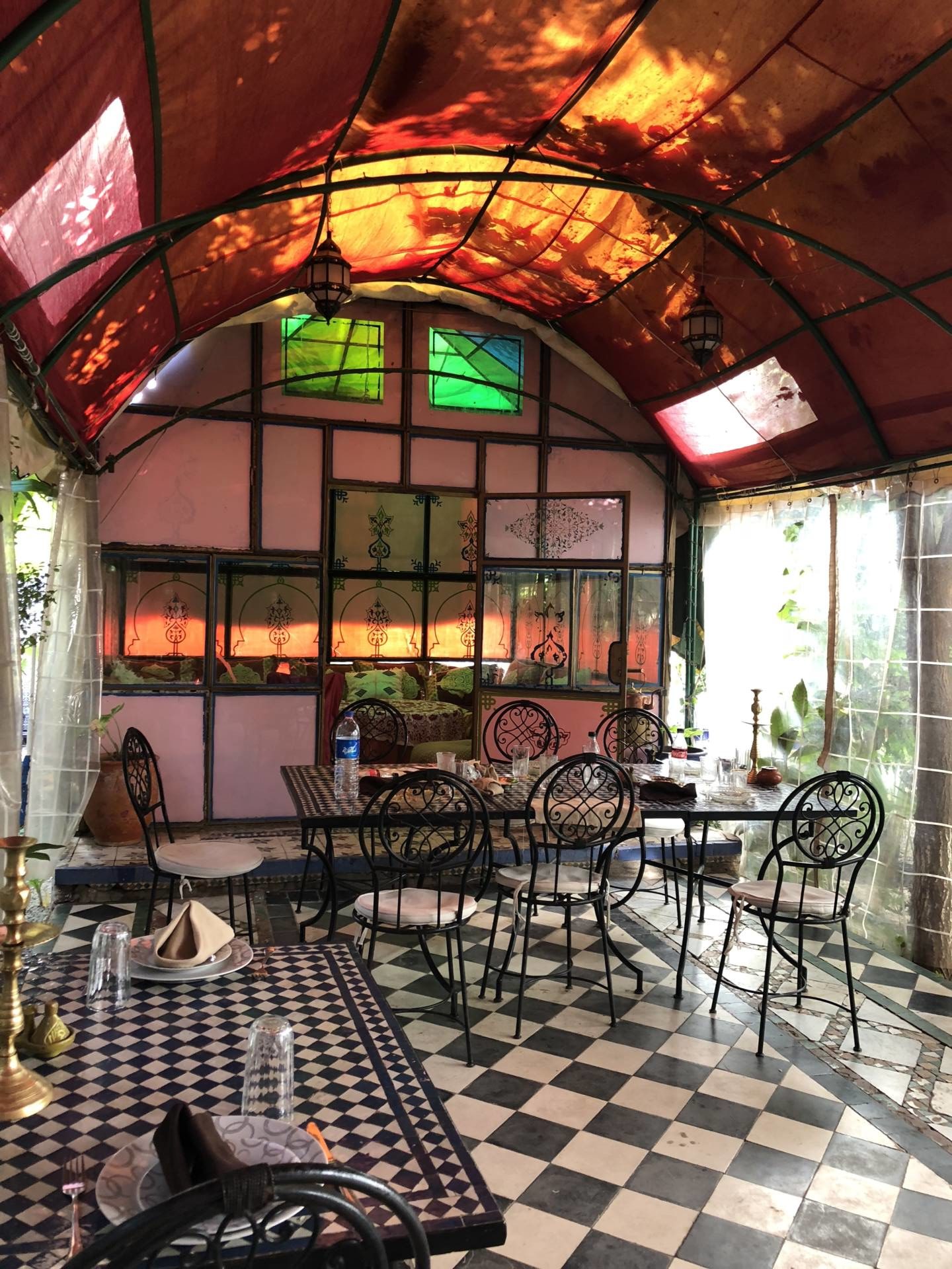 Le Jardin : Quand on reste 5 jours, on a pas non plus envie de manger 10 tajines et couscous ! On est tombé sur ce restaurant je ne sais plus comment mais alors, une merveille ! Un superbe patio, une cuisine plutôt occidentale mais revisitée à la marocaine. Un très beau cadre au calme, de la verdure, des lumières tamisées, une ambiance top ! On y est allé deux fois et on s’est toujours régalé ! Gaspacho, entrées marocaines, et crème brûlée à la fleur d’oranger, tout parfait ! C’est plus cher que les restaurants plus simples. Il faut compter entre 100 et 150 dr pour un plat, 60-70 dr pour un dessert ! Mais c’est vraiment bon ! Parfait pour un repas en tête-à-tête d’ailleurs ! Je recommande ++ !