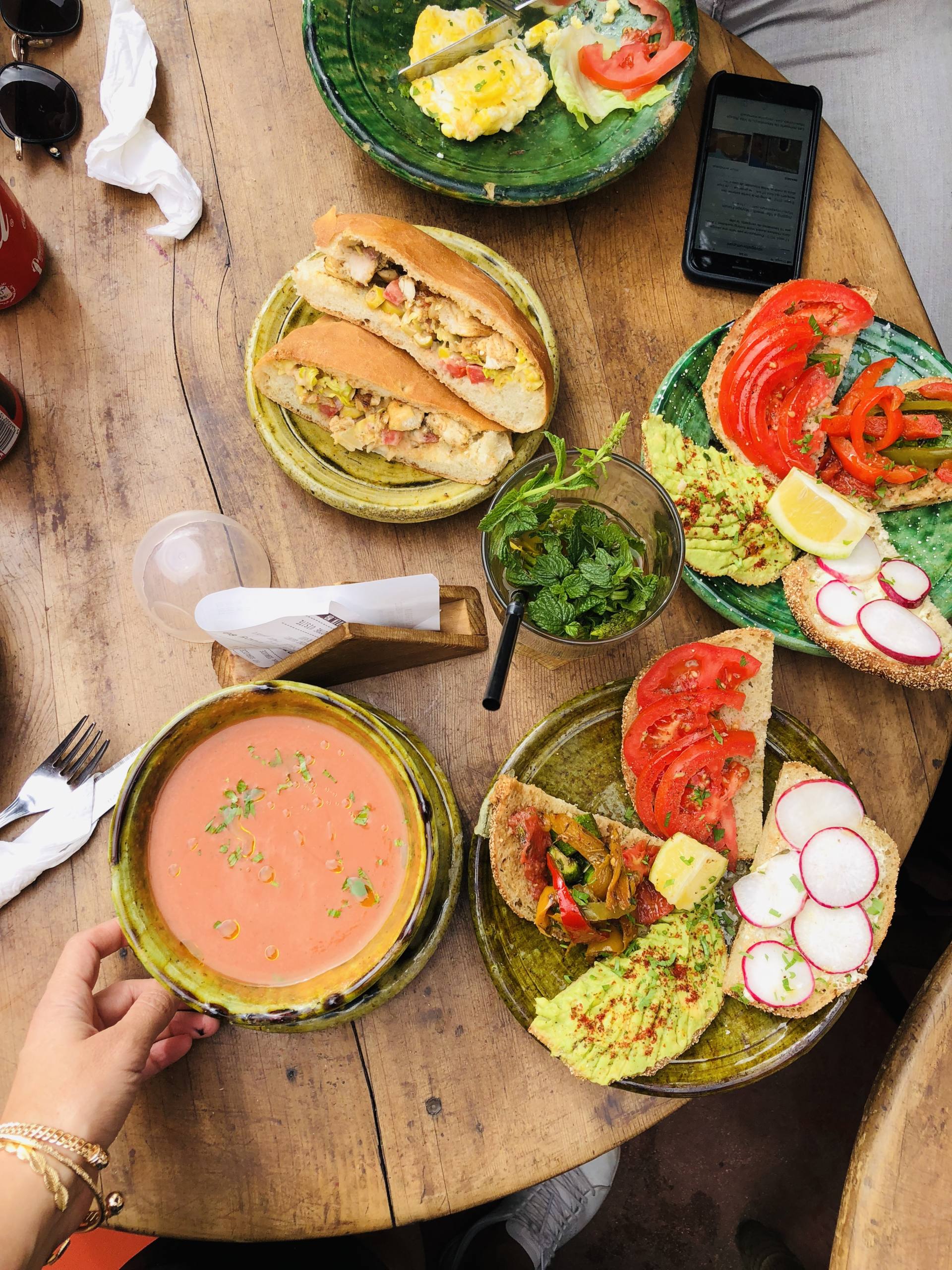 Le café des épices : Un joli café-restaurant sur ma place préférée de Marrakech ! Une adresse sur 3 niveaux mais le plus sympa est d’être sur la terrasse tout en haut pour profiter de la vue ! Un peu d’attente est nécessaire mais c’est très sympa ! Tajines à 60dr ! J’ai opté pour le sandwich végétarien : 4 petites tartines super bonnes ! J’ai aussi pris un gaspacho qui était divin ! Tout le monde a vraiment aimé autour de la table. Pour le dessert, la tarte aux amandes n’était pas folle par contre !