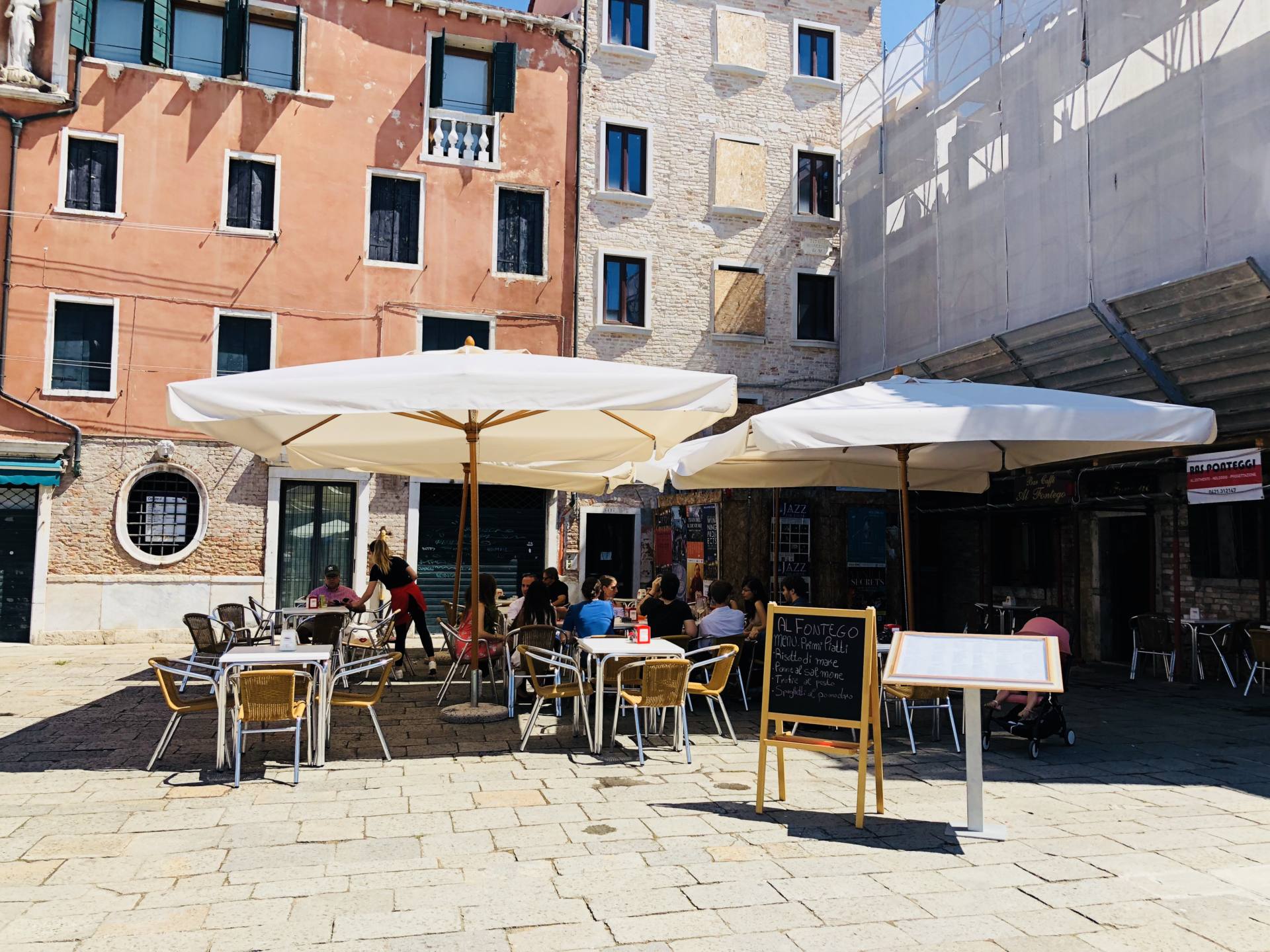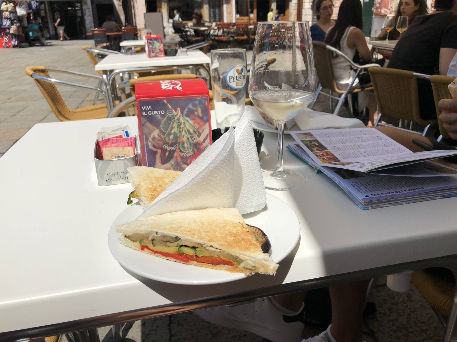 •• Pour un lunch sur le pouce à prix mini : un bar avec une terrasse sur une place plus calme : Al Fontego. Prosecco à 4€, bière à 3€, sandwich toast très bon à 3€, pâtes à 8-9, tramezzini (mini-sandwichs apéro) à 1,50€ ! Ce n’est évidemment pas pour manger de la haute gastronomie mais pour un encas pas cher, correct niveau food tout en étant assis sur une belle place, le rapport qualité-prix est bien (moins de 15€ pour 2 pour 3 toasts et 2 boissons).