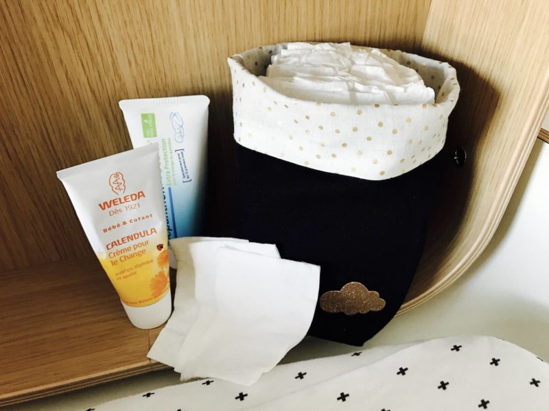 Quant aux couches, je suis aux Pampers pour l’instant mais vu la polémique, je vais passer aux Love & Green. En attendant, sur les conseils de ma sage-femme, pour isoler la peau de la couche, j’utilise des carrés de coton tissé que je mets dans la couche. Je vous donnerai mon avis sur les Love & Green plus tard du coup !