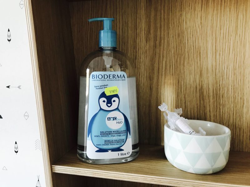 – une eau micellaire pour son visage et son coup : Louise régurgite en fin de biberon car elle a le hoquet. Malgré le bavoir et les langes que j’ai toujours pas loin, ce qu’elle régurgite est très acide et est en contact avec sa peau. D’ailleurs, cela fait des marques blanches si on ne nettoie pas. On le voit le matin si elle en a eu dans la nuit. Du coup, je lui nettoie le visage avec une eau micellaire pour bébés. J’ai la solution micellaire de chez Bioderma (7,98€ le litre sur Easypara) car c’est tout bêtement celle qu’il y avait en maternité. Je suis une grande adepte des eaux micellaires pour moi et je trouve que c’est un moyen assez doux de nettoyer la peau. C’est aussi frais et l’odeur de la Bioderma est agréable mais subtile. Celle-ci n’est pas bio ni vraiment naturelle mais pour l’instant, elle la tolère bien. À voir si je la garderai ensuite ou si j’opterai pour une autre bio et plus naturelle mais je n’ai pas encore trouvé.