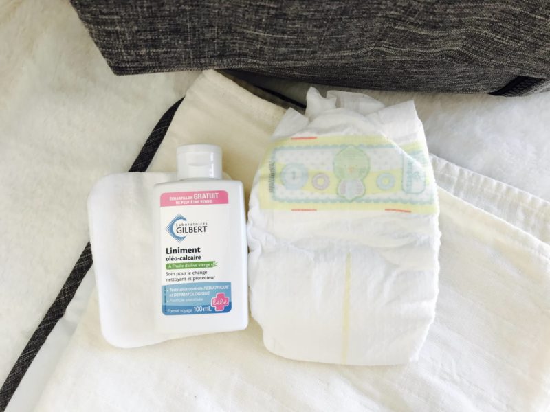 – un nettoyant pour les fesses : c’est le produit que j’utilise pour lui nettoyer le siège au moment de changer sa couche. J’ai choisi le liniment oléo-calcaire de chez Gifrer. C’est très naturel, un mélange d’huile d’olive et d’eau de chaux, et cela hydrate sa peau en douceur au passage. Il lui convient très bien et le prix est très abordable. En format de voyage pour le sac à langer, j’ai celui de chez Laboratoires Gilbert reçu à la maternité et qui est très bien aussi.