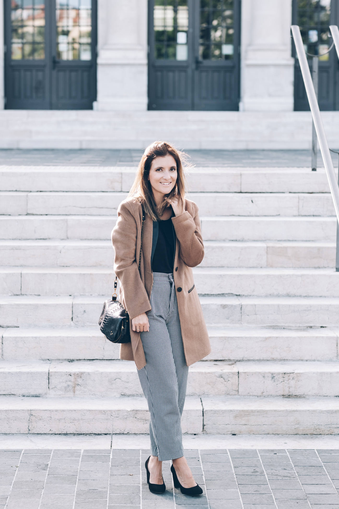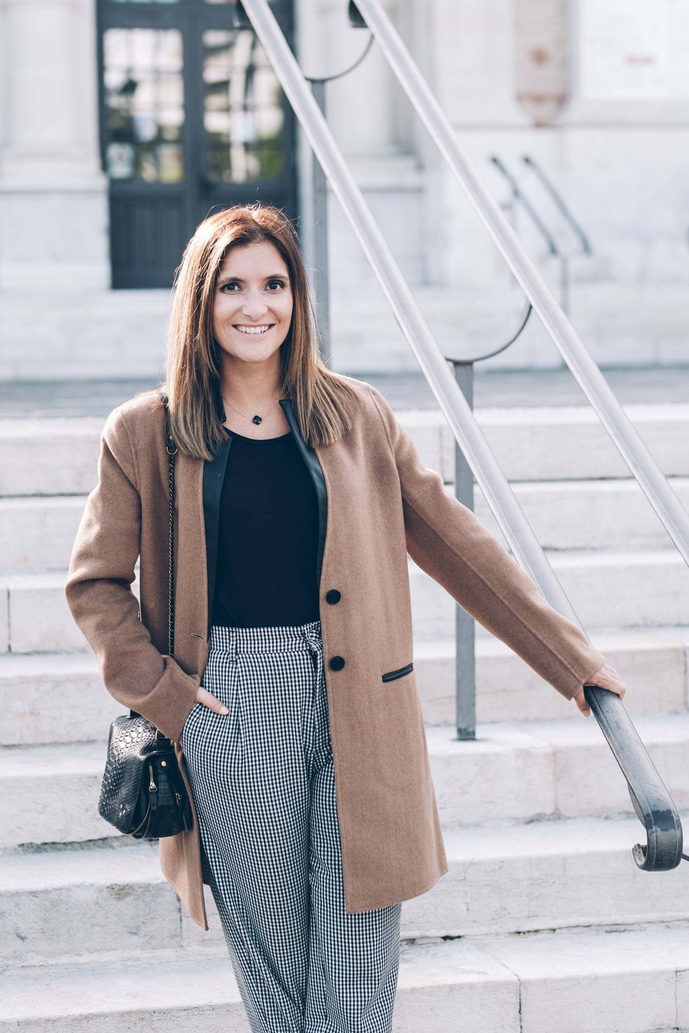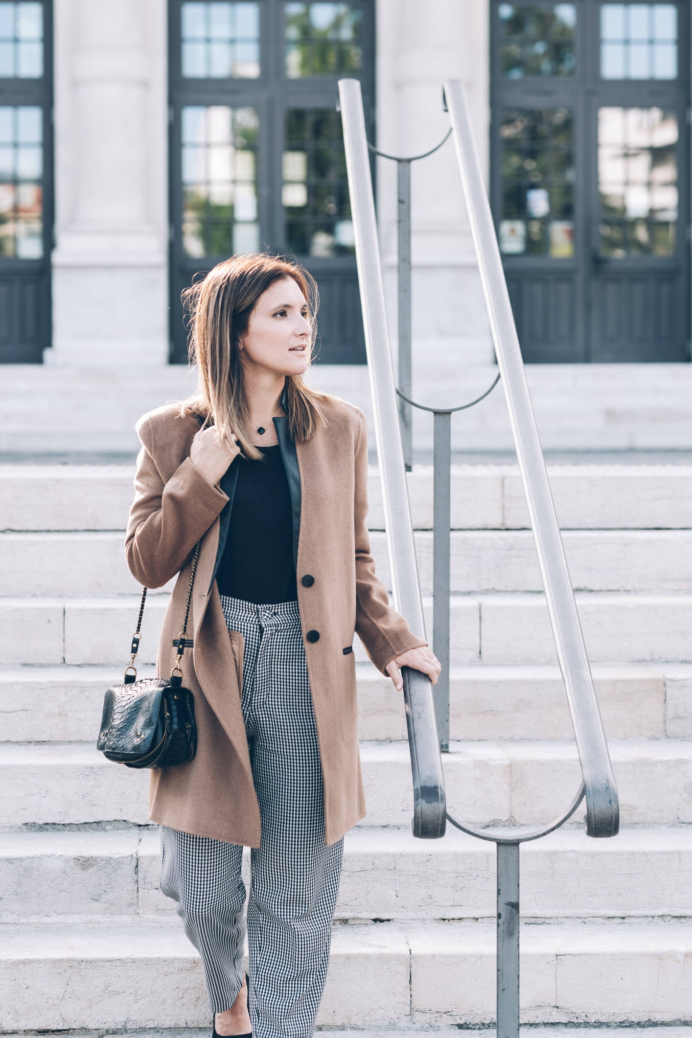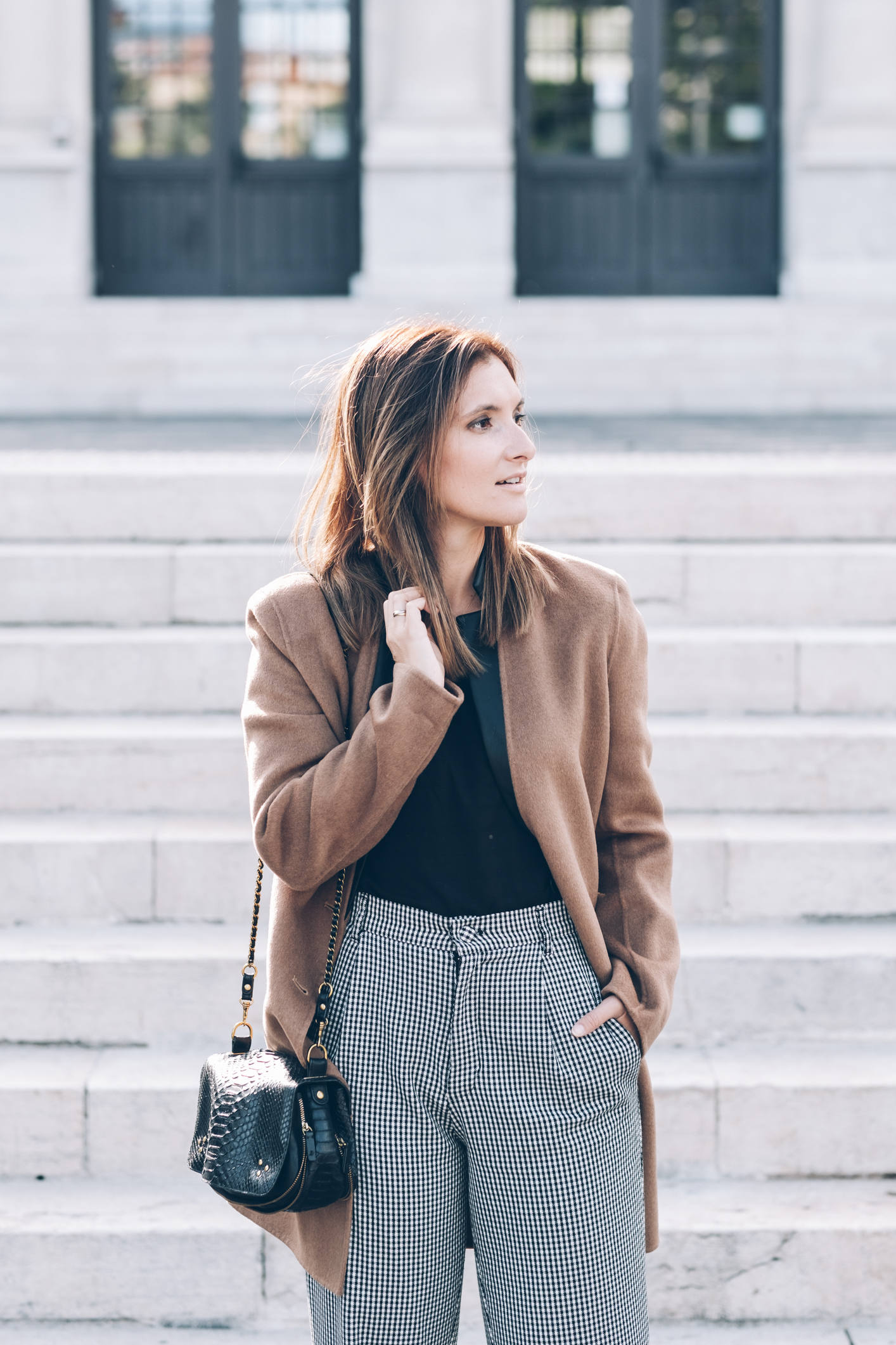 Allez, on arrête de parler cheveux (j’en ai déjà parlé ici avec ma nouvelle routine capillaire), je suis trop contente de vous partager un look avec ce pantalon pied-de-poule que vous adorez chaque fois que je le porte et que vous le voyez passer en story ! Je l’ai repéré à Bruxelles, chez Zara. A l’origine, c’est ma copine qui l’a pris et je l’ai trouvé canon donc je suis allée en prendre un aussi. Mes copines n’étaient pas unanimes et si je les avais écoutées, je ne l’aurai jamais pris. Alors effectivement, ce n’est peut-être pas la coupe qui me va le mieux. Mais parfois, ça fait du bien d’envoyer valser tout ça, d’arrêter d’attendre, d’arrêter de se freiner, et de porter ce qui nous fait plaisir. Et finalement, je le porte souvent et je l’adore. Je l’ai même racheté en couleur terracota ! J’aime le porter de plusieurs façons, soit avec des escarpins noirs, soit avec des baskets et légèrement retroussé, soit avec des mocassins. Bref, il offre pas mal de possibilités et c’est aussi ça que j’aime dans une pièce, avoir plusieurs options pour la porter ! Je le porte la plupart du temps avec un tee-shirt très basique, ici, c’est un tee-shirt fluide que j’ai depuis 5-6 ans mais que j’adore. Je l’avais shoppé en soldes chez Comptoir des Cotonniers pour 27,50€. Je m’en souviens encore, j’étais étudiante et bien contente de dégoter cette pièce ! Je l’ai tellement porté, la qualité est au rendez-vous, il est toujours niquel 5-6 ans après ! Avec cette paire d’escarpins, ça donne un rendu élégant comme j’aime. Le manteau camel casse le côté noir et blanc. J’ai déjà quasiment le même manteau de la même marque, acheté en 2013 ! Je suis folle de la coupe. Alors quand j’ai vu qu’il existait en camel, j’étais trop contente. J’adore ses empiècements en cuir ! Mon sac est un de mes préférés, dès qu’on entre dans l’hiver, je le sors illico ! D’ailleurs, je songe à m’acheter un autre Bobi dans un autre coloris. Quelques bijoux dorés, comme d’habitude !