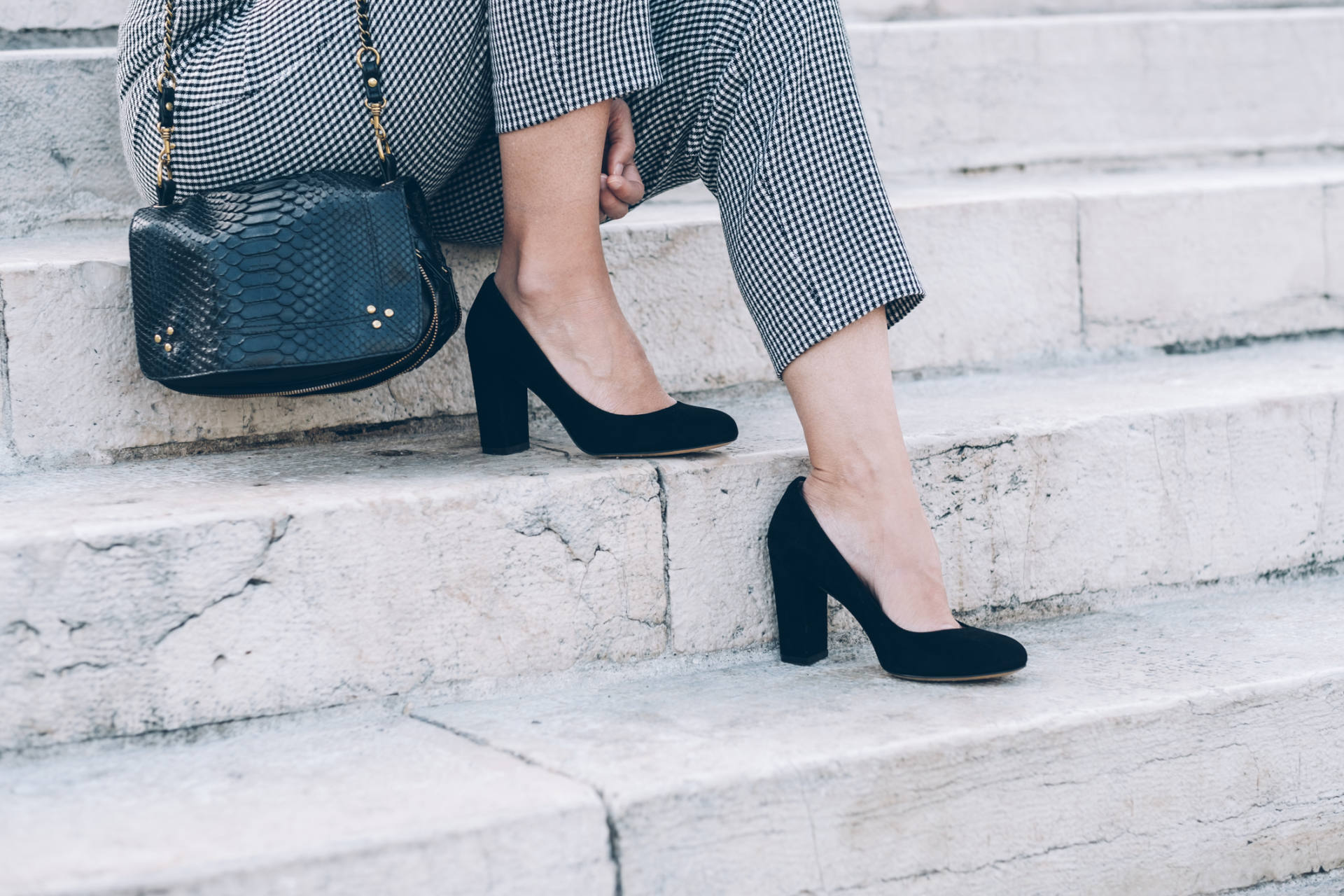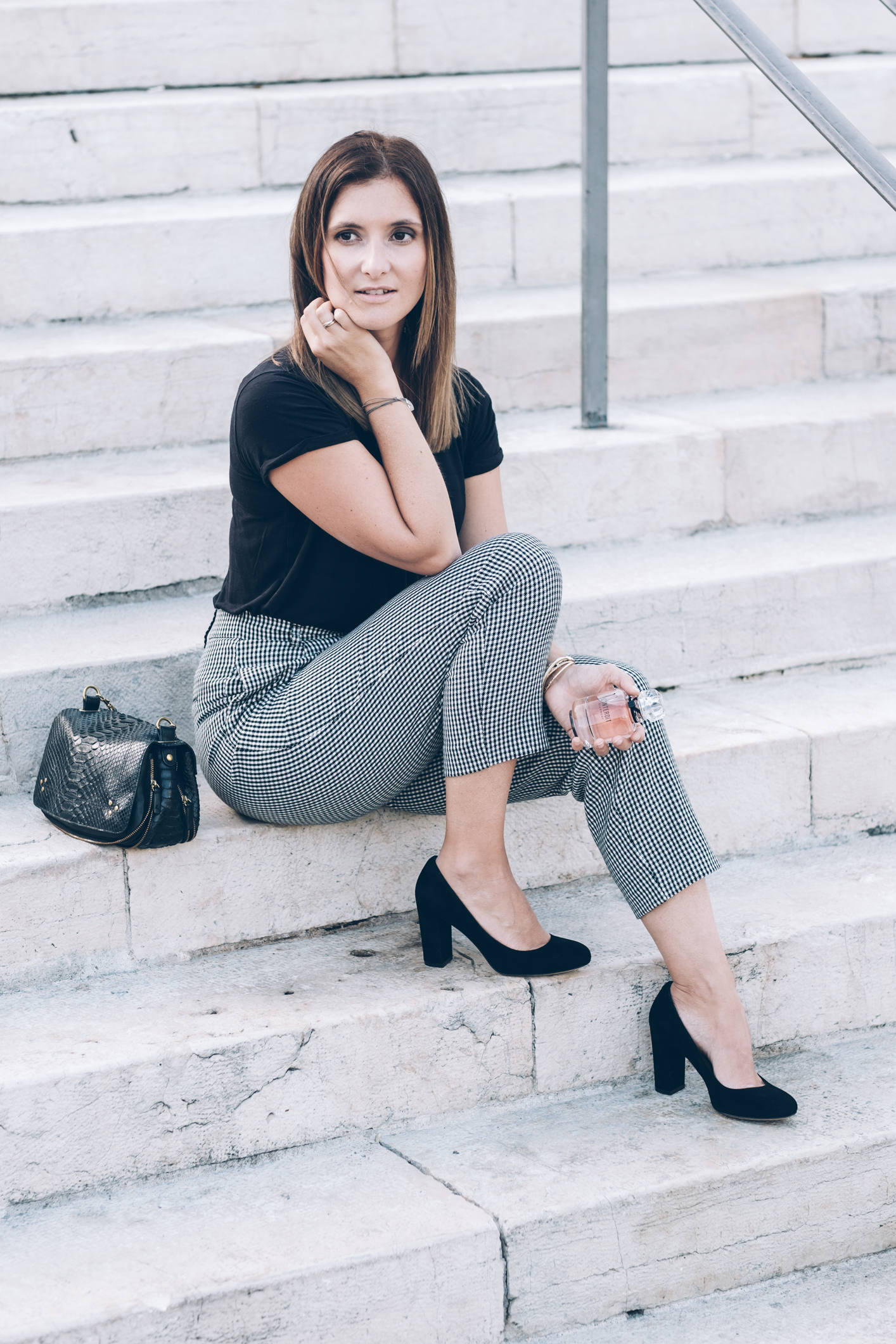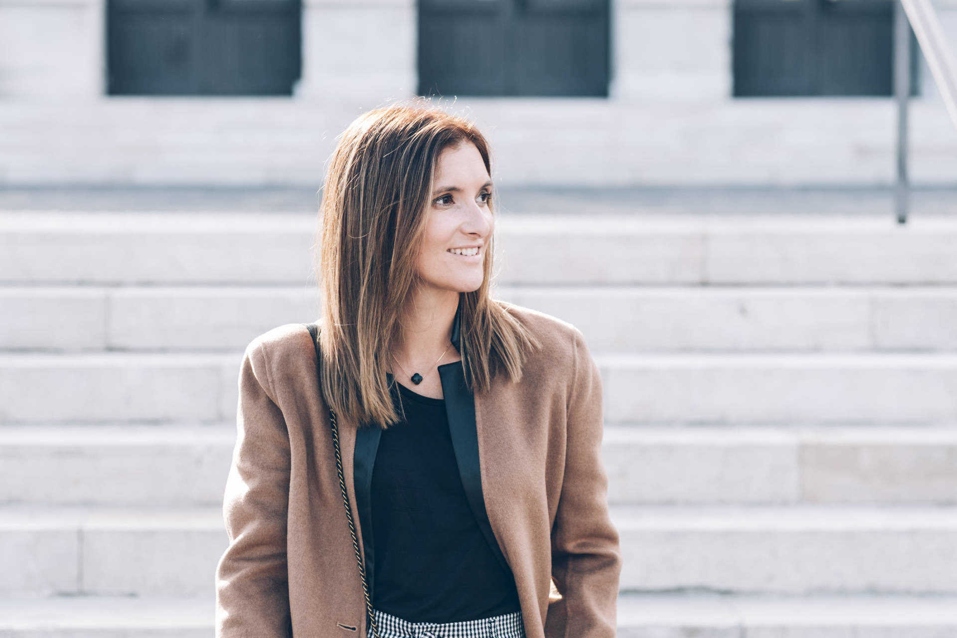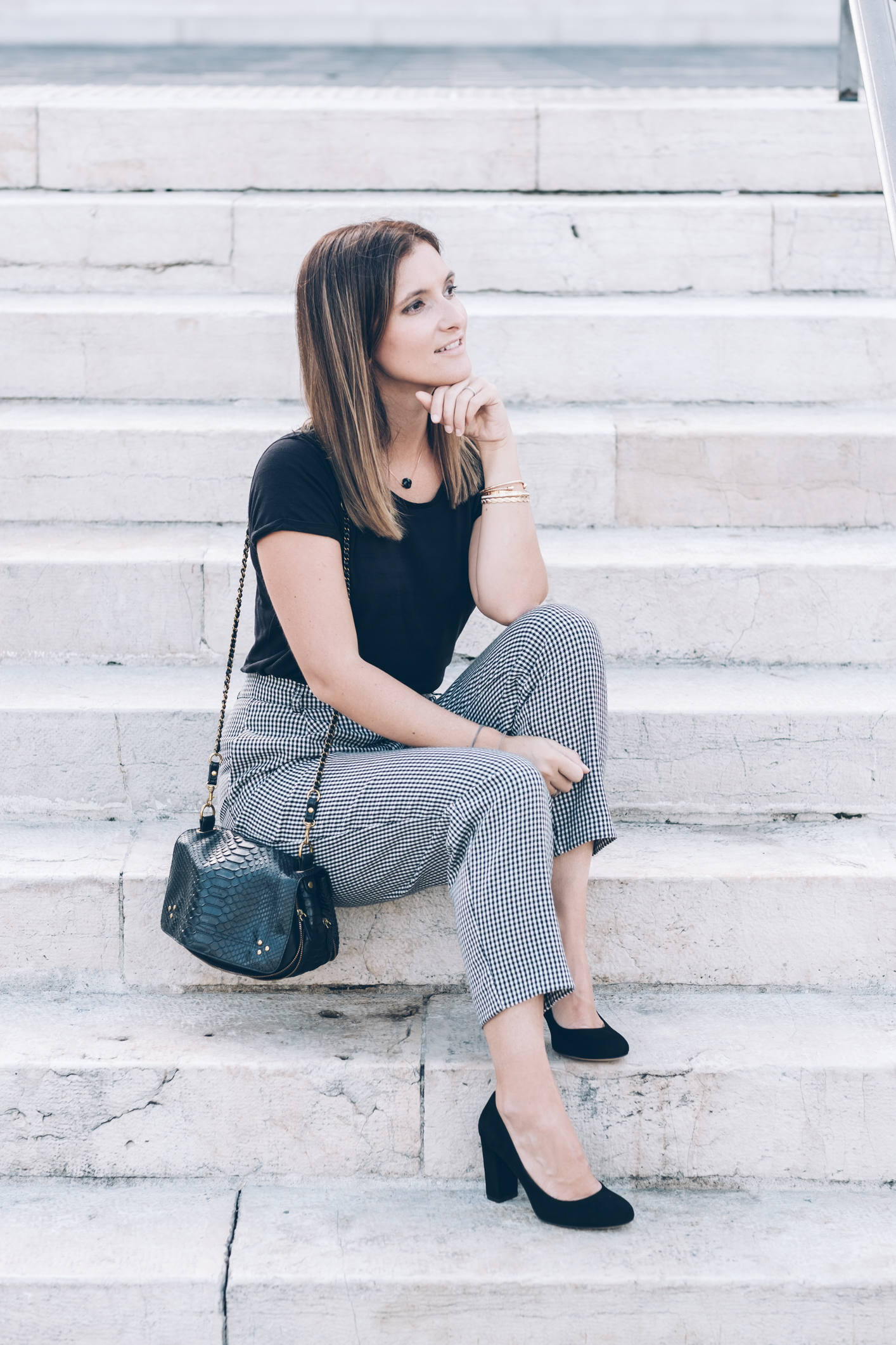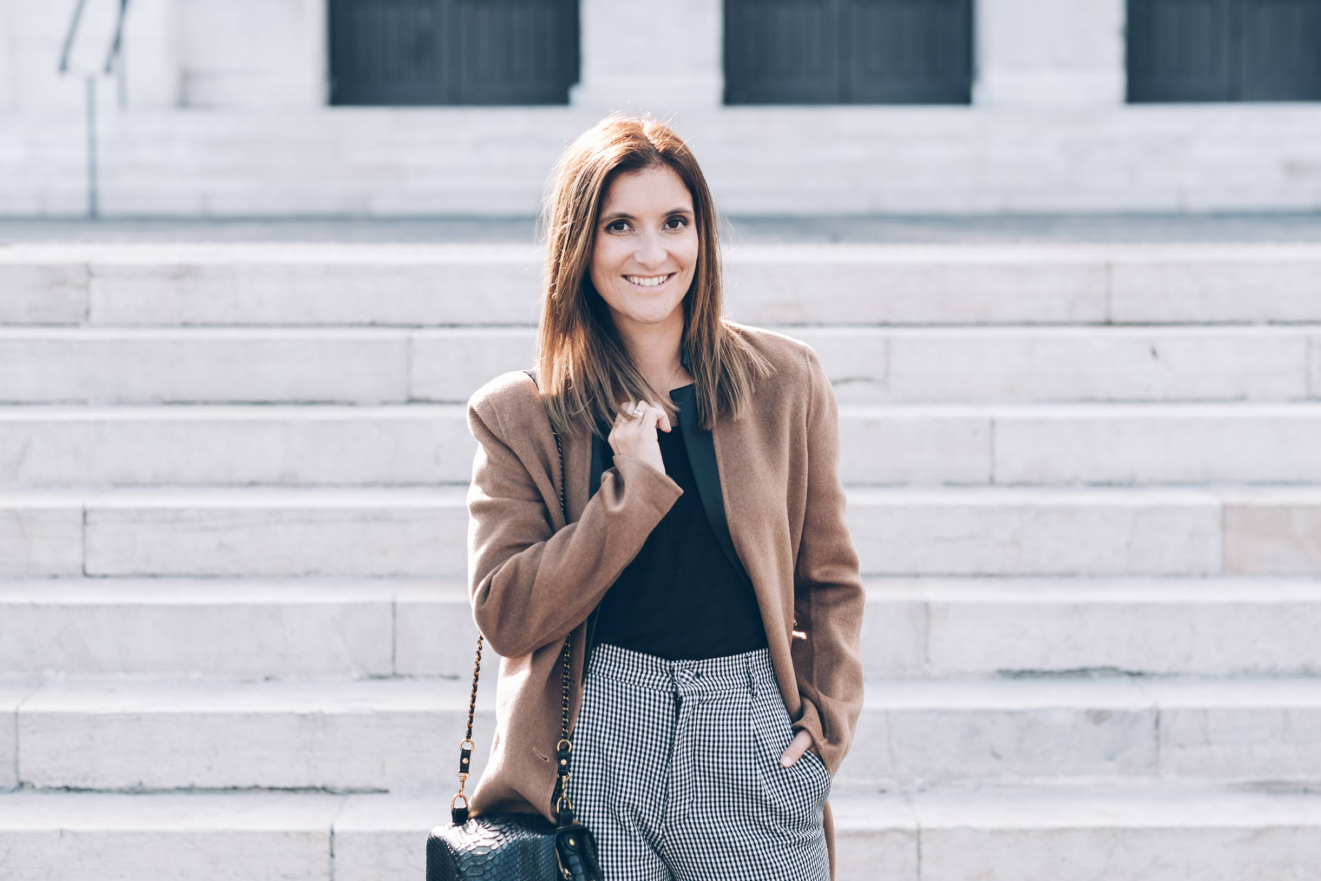 Allez, on arrête de parler cheveux (j’en ai déjà parlé ici avec ma nouvelle routine capillaire), je suis trop contente de vous partager un look avec ce pantalon pied-de-poule que vous adorez chaque fois que je le porte et que vous le voyez passer en story ! Je l’ai repéré à Bruxelles, chez Zara. A l’origine, c’est ma copine qui l’a pris et je l’ai trouvé canon donc je suis allée en prendre un aussi. Mes copines n’étaient pas unanimes et si je les avais écoutées, je ne l’aurai jamais pris. Alors effectivement, ce n’est peut-être pas la coupe qui me va le mieux. Mais parfois, ça fait du bien d’envoyer valser tout ça, d’arrêter d’attendre, d’arrêter de se freiner, et de porter ce qui nous fait plaisir. Et finalement, je le porte souvent et je l’adore. Je l’ai même racheté en couleur terracota ! J’aime le porter de plusieurs façons, soit avec des escarpins noirs, soit avec des baskets et légèrement retroussé, soit avec des mocassins. Bref, il offre pas mal de possibilités et c’est aussi ça que j’aime dans une pièce, avoir plusieurs options pour la porter ! Je le porte la plupart du temps avec un tee-shirt très basique, ici, c’est un tee-shirt fluide que j’ai depuis 5-6 ans mais que j’adore. Je l’avais shoppé en soldes chez Comptoir des Cotonniers pour 27,50€. Je m’en souviens encore, j’étais étudiante et bien contente de dégoter cette pièce ! Je l’ai tellement porté, la qualité est au rendez-vous, il est toujours niquel 5-6 ans après ! Avec cette paire d’escarpins, ça donne un rendu élégant comme j’aime. Le manteau camel casse le côté noir et blanc. J’ai déjà quasiment le même manteau de la même marque, acheté en 2013 ! Je suis folle de la coupe. Alors quand j’ai vu qu’il existait en camel, j’étais trop contente. J’adore ses empiècements en cuir ! Mon sac est un de mes préférés, dès qu’on entre dans l’hiver, je le sors illico ! D’ailleurs, je songe à m’acheter un autre Bobi dans un autre coloris. Quelques bijoux dorés, comme d’habitude !