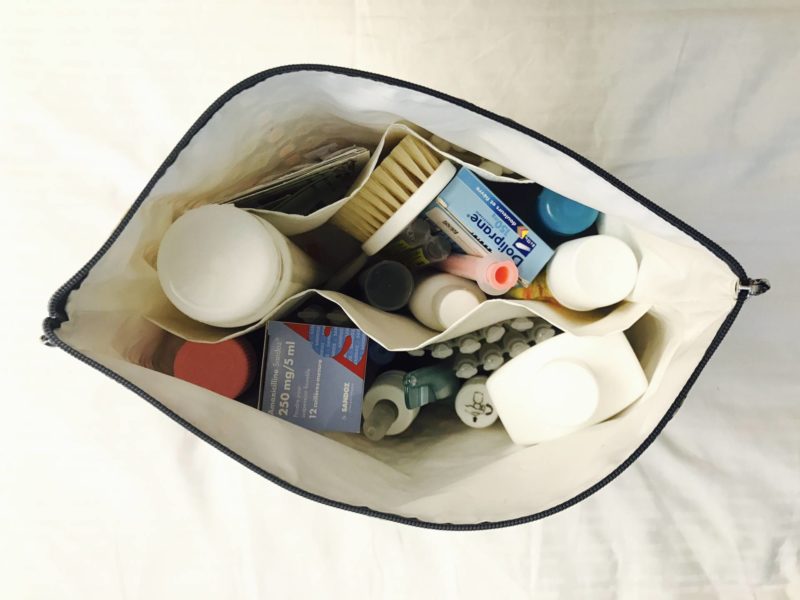 - 1 trousse de toilette : quelques médicaments au cas où, du liniment, un nettoyant pour le bain, du sérum physiologique, des tétines, les vitamines et un lair corporel car elle a la peau sèche en ce moment