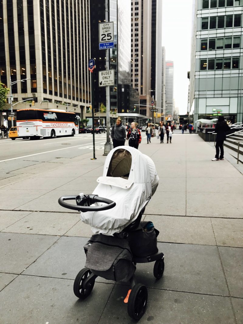 New-York City est une ville immense donc il est compliqué de faire comme en Sardaigne ou à Copenhague où on rentrait en journée pour préserver la sieste de l’après-midi. Là, quand on part, c’est pour la journée. Du coup, on a vraiment voulu préserver le confort de Louise : être bien au chaud, pouvoir bouger, participer au voyage et pouvoir dormir. C’est pour cette raison qu’on a pris notre poussette Stokke Xplory qui a été idéale. Elle est extrêmement confortable, Louise a fait des siestes d’une heure paisiblement en position bien couchée, à l’abri. Pendant ses périodes d’éveil, on la redresse d’un cran pour qu’elle voit ce qui se passe et qu’elle joue avec ses jouets. Quand c’est l’heure du repas et qu’on a pas de chaise haute, on redresse le hamac au dernier cran pour qu’elle soit assise. On avait peur qu’il fasse froid ou qu’il pleuve, on voulait qu’elle soit bien abritée donc on a mis le Winter Kit sur la poussette. C’est génial car elle est vraiment comme dans un cocon, à l’abri de l’humidité et du vent, mais elle a quand même de l’espace pour bouger.