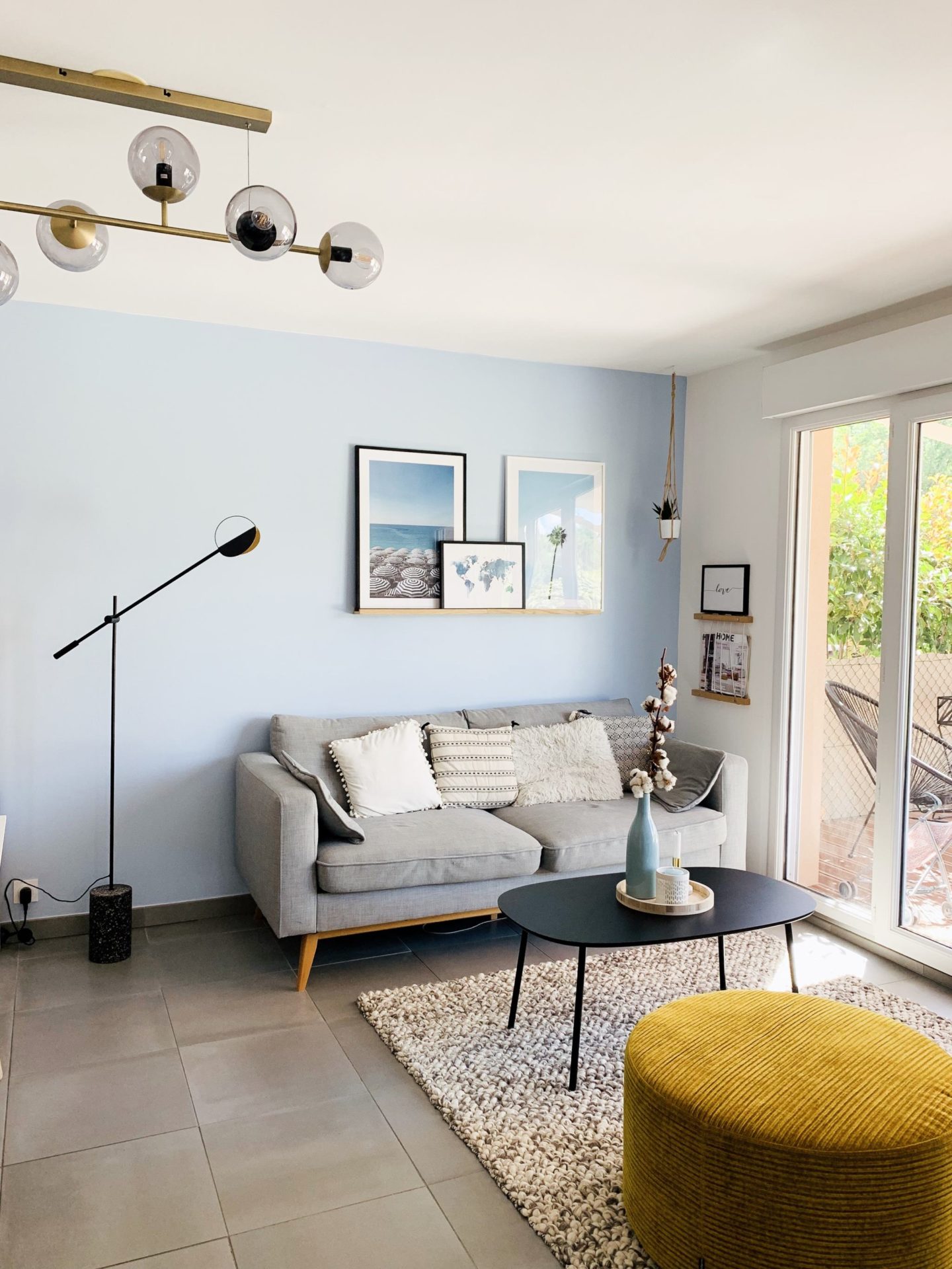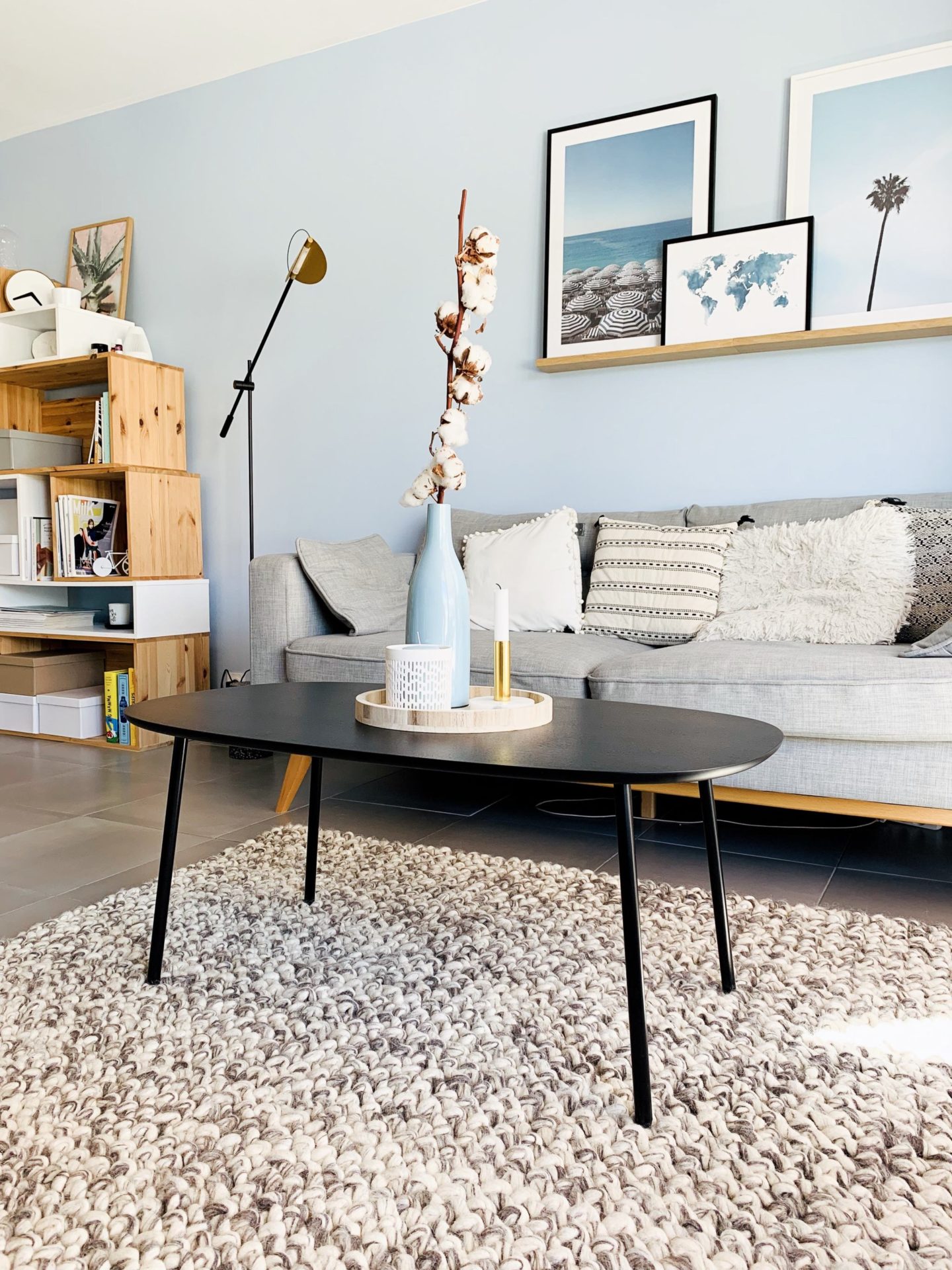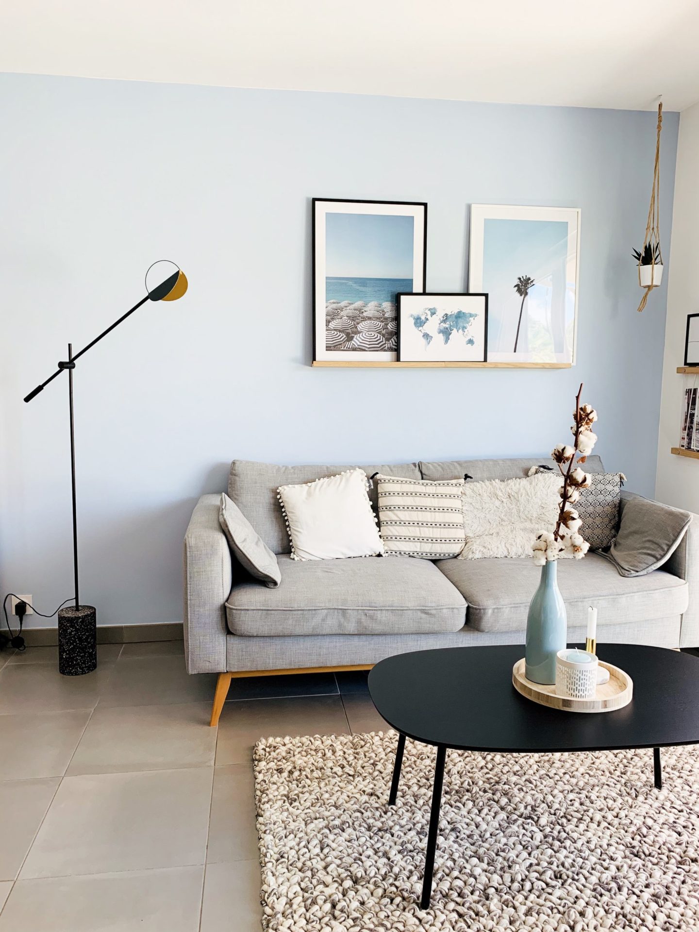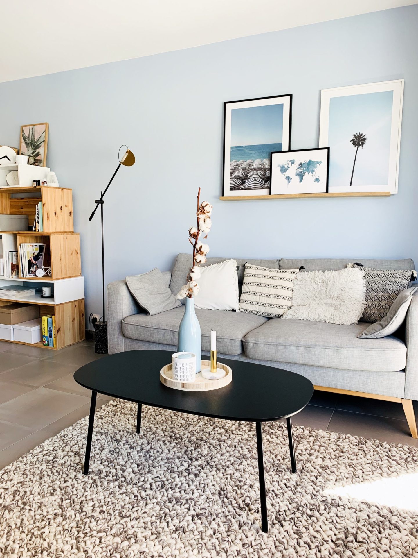 Quand on a emménagé, on a tout acheté sans être encore dans l’appartement. Ce dont on était sûr, c’est qu’on voulait une ambiance assez épurée, simple. Du bois, du blanc, du gris, un cocon agréable d’inspiration scandinave. Mais sans s’en rendre compte, on a acheté que des meubles assez (trop) similaires. J’aimais le rendu mais je m’en suis lassée assez vite. Si vous voulez, j’avais fait un article ici ! Alors cette année, j’ai eu envie d’apporter de la couleur, du relief dans le salon. Ce tout blanc me lassait et donnait trop un aspect pas fini ! Avant même d’emménager, le bleu polaire me plaisait énormément puisque j’avais vu une cuisine dans ces tons. Stéphane n’était pas trop pour car il trouvait que cela n’était pas assez intemporel pour une cuisine. Peut-être a-t-il eu raison car une cuisine est censée durer vraiment longtemps. Mais du coup, je me suis dit « et pourquoi pas un mur ! ». On est allé voir en magasins et j’ai trouvé cette teinte « Bleu Polaire » à Castorama. Je ne sais plus si c’était la marque Colors ou Tollens mais Steph m’a dit que la qualité n’était pas aussi bonne que les peintures Little Shop of Colors utilisées dans la cuisine et notre chambre. C’était compliqué à étaler sans faire de traces. Mais finalement, le rendu est top. Steph, c’est le champion de la peinture, il adore faire ça !