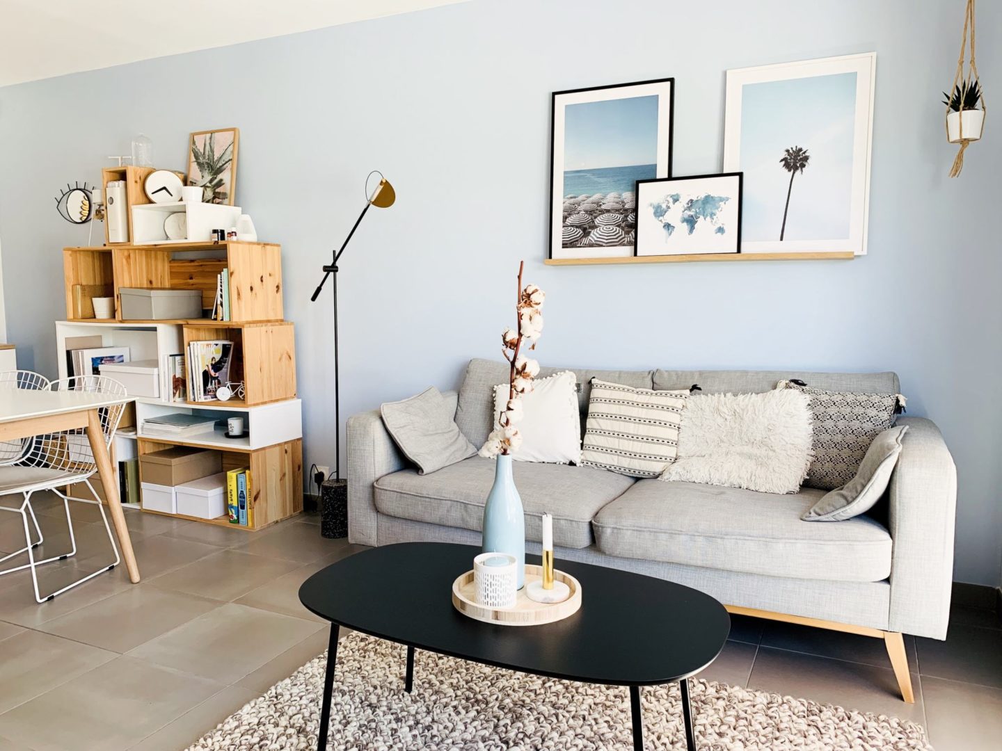 J’ai aussi changé les cadres ! Depuis qu’on avait le mur bleu polaire, c’était pas top d’avoir des visuels de cactus et de palmiers. J’ai gardé le cadre LOVE que j’ai déplacé et j’ai refait faire ceux sur l’étagère. J’en ai profité pour prendre la taille au-dessus afin que ca occupe davantage le mur. Les deux grands font 50x70cms, le petit fait 40x50cms. Je trouve que ça rend bien mieux. Côté visuels, j’ai mis des affiches qui nous correspondent mieux : une vue de Nice, un palmier en écho à notre région, et une carte du monde car on adore voyager. Les tons apportent beaucoup dans le salon. C’est très sympa. On me demande souvent mais les deux petites tablettes viennent de chez Castorama. Quant aux cadres, ils viennent de chez Desenio, il y a tellement de choix sur le site !