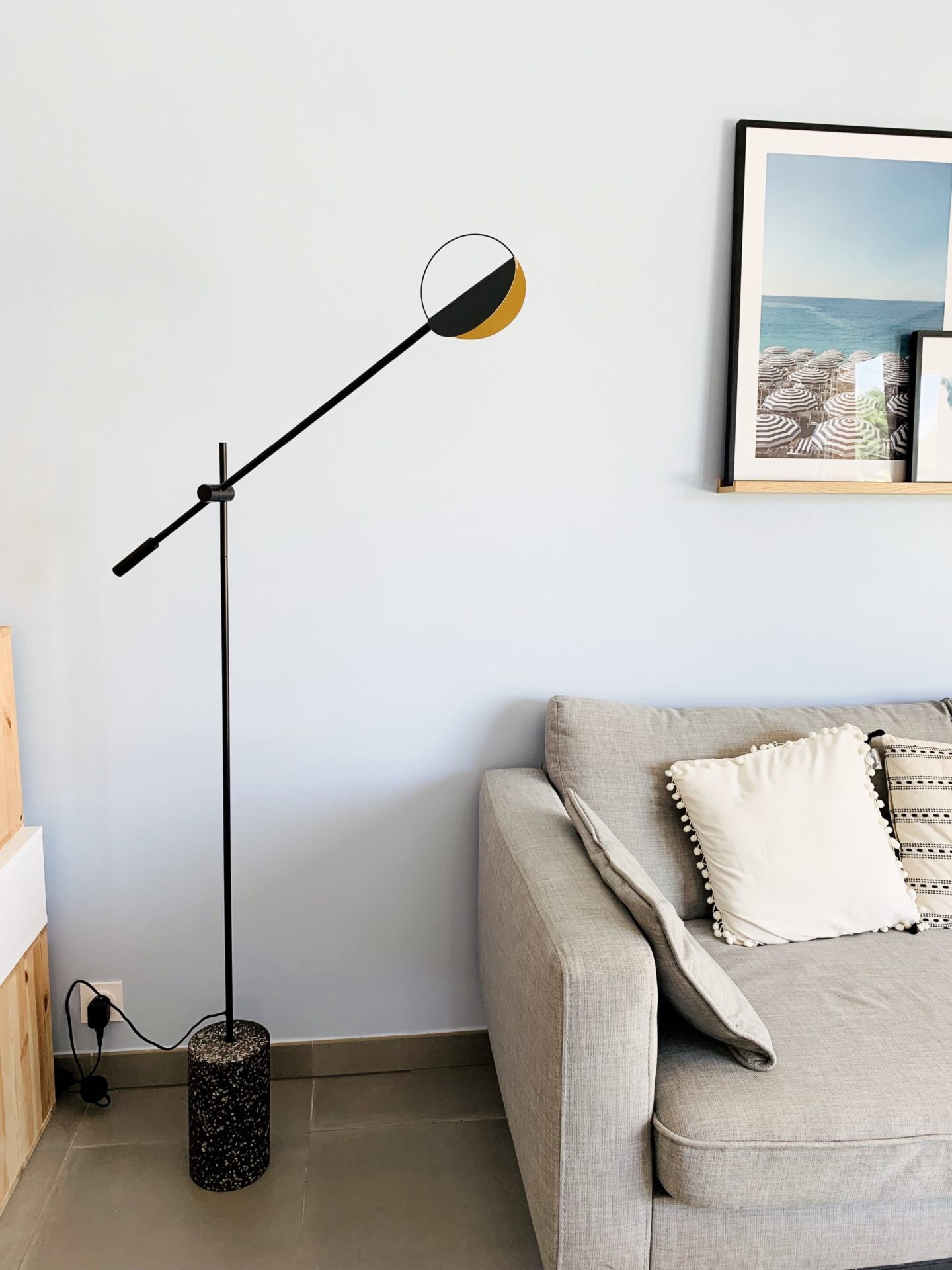 Côté luminaires, on en avait pas, enfin si, les ampoules ! Ça fait un moment que je regardais mais que je ne trouvais jamais rien. C’est aussi un poste très coûteux quand on cherche quelque chose d’original. Pour le lustre, nous avons opté pour une pièce Bolia en laiton doré avec des boules noires fumées. Cela donne une lumière tamisée, cela éclaire à la fois dessous mais aussi sur les côtés, ce qui était vraiment l’objectif car la source d’éléctricité a été placée au milieu de la pièce, c’est à dire ni au-dessus du salon, ni au-dessus de la salle à manger. Avec ce lustre, on a vraiment de la lumière partout ! À côté du canapé, on voulait un lampadaire mais surtout, pas imposant ! Celui-ci de chez Bolia est parfait car le bras s’oriente, ainsi que la partie lumineuse. Je trouve le pied superbe, il ressort bien, c’est vraiment bien fait ! Gros coup de coeur.