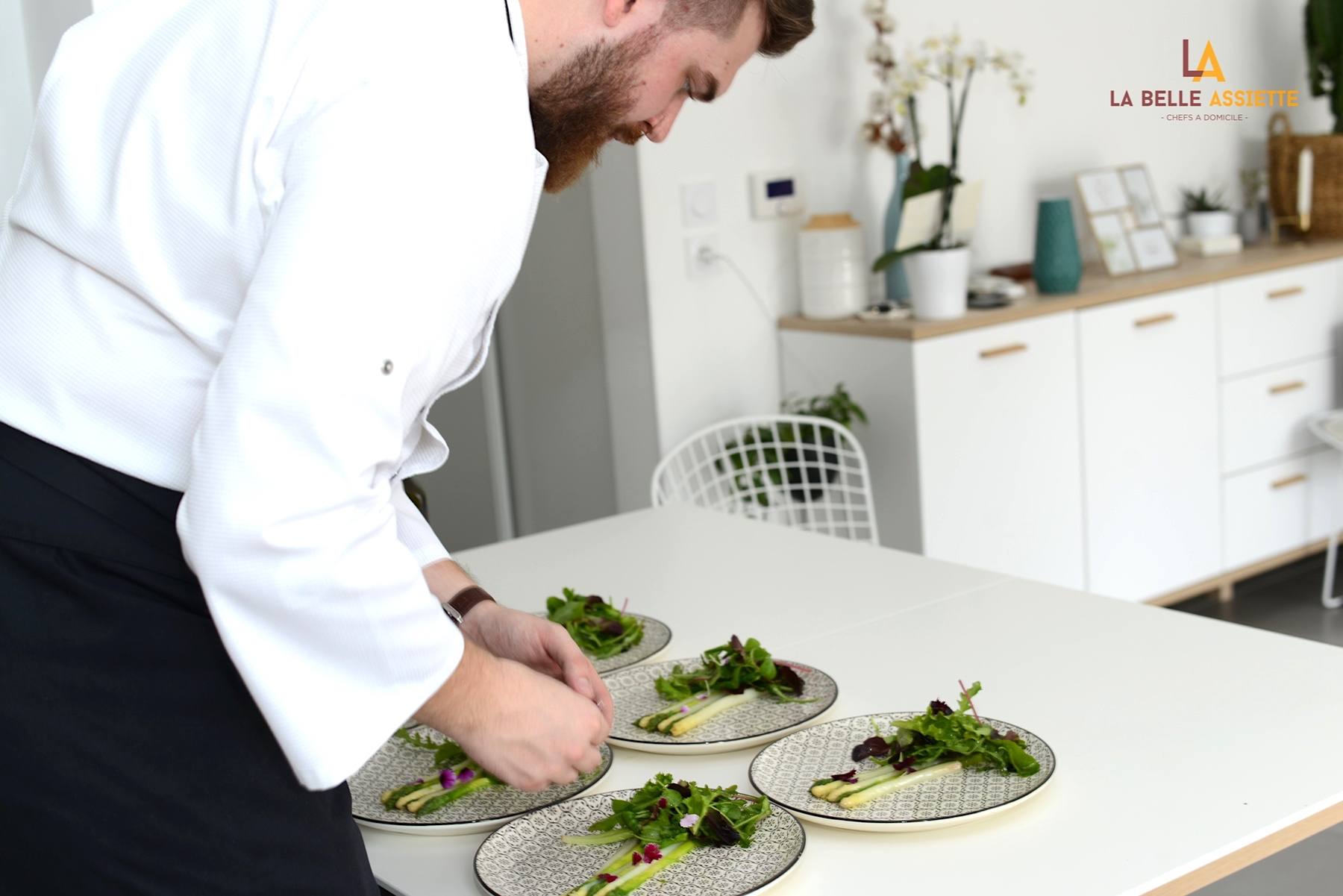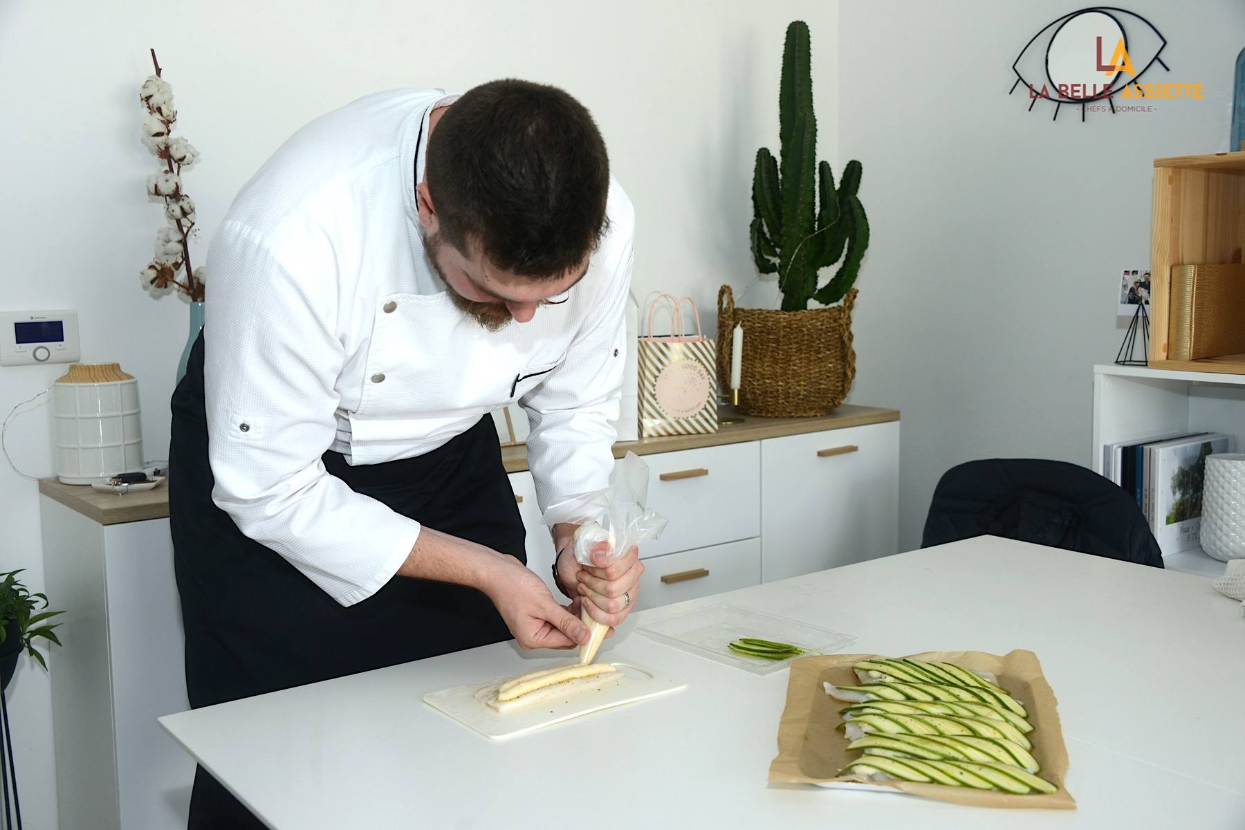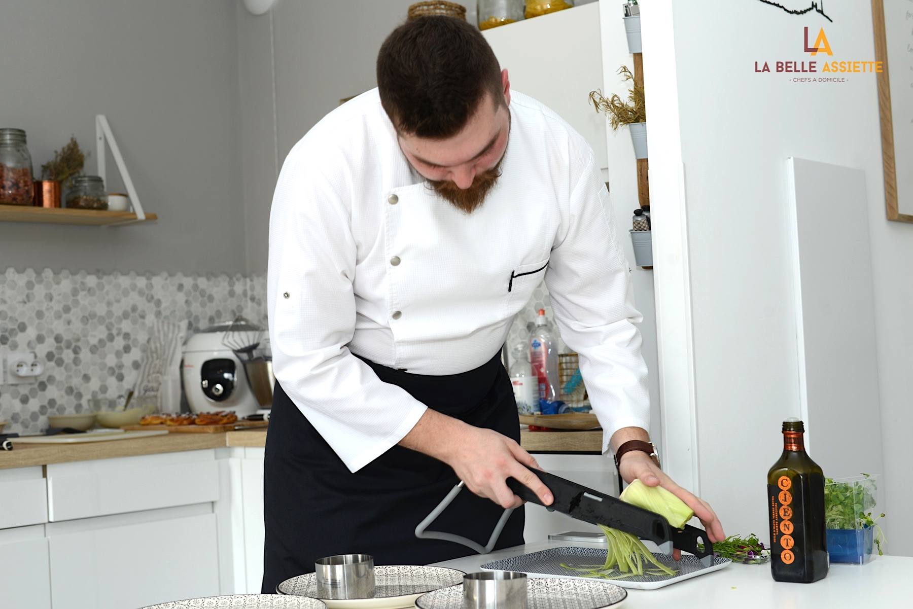 Cette année, on avait envie que ce soit la fête des mères jusqu’au bout, alors pas de repas à faire, pas de débarassage, pas de contraintes, juste du plaisir. C’est un chef qui est venu cuisiner à la maison : Maxime Kozlitine ! Le BONHEUR ! Ça a eu l’air de vous intriguer quand je vous ai montré cela en stories ! Du coup, je vais vous en montrer un peu plus ! Ça fait bizarre de voir quelqu’un chef chez soi, et quel plaisir, quand il est reparti, c’était encore plus clean que quand il est arrivé ! Je l’ai réservé via le site La Belle Assiette où on peut réserver un chef selon le lieu de la réception. On peut choisir le menu souhaité (plusieurs gammes, plusieurs prix). Ensuite, j’ai eu un petit échange avec le chef pour connaître nos préférences culinaires et il m’a demandé ce dont je disposais comme équipements dont je lui ai envoyé une photo de la cuisine. Puis dimanche, il est arrivé avec un peu de matériel, les ingrédients et ses préparations. Il a terminé les cuissons et dressé les assiettes chez nous. Il se charge aussi du service, du rangement et du nettoyage. Pour vous donner un exemple, nous avons choisi un menu à 35€ par personne. On s’est régalé avec :