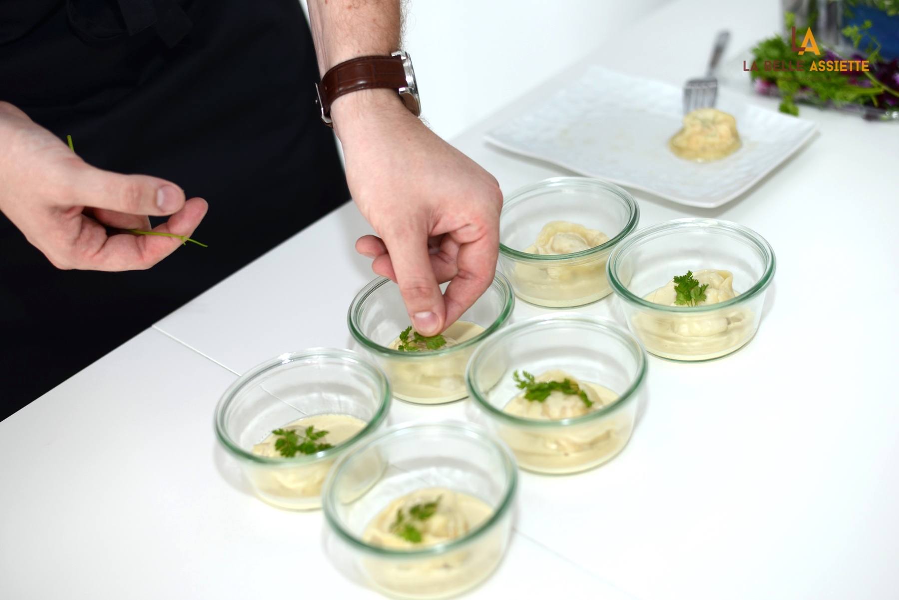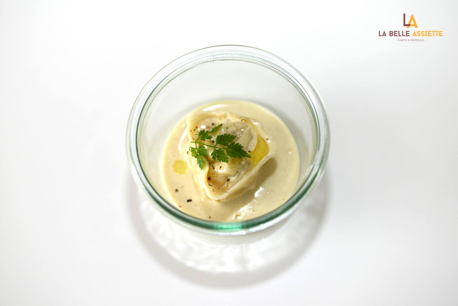 - un amuse-bouche : raviole de saumon à l’aneth et crème au gingembre