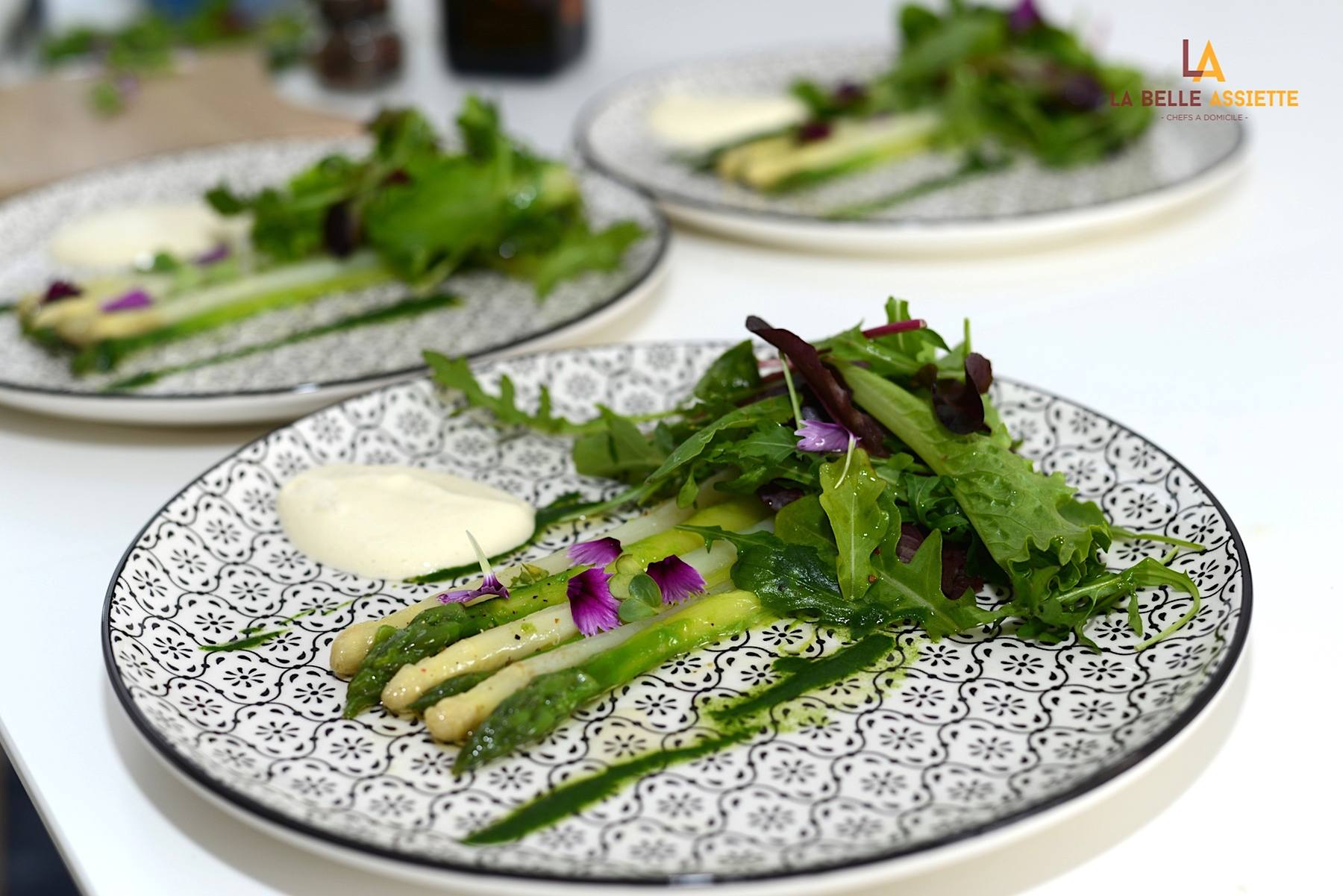 - une entrée : asperges et fleurs, avec une petite salade de mesclun
