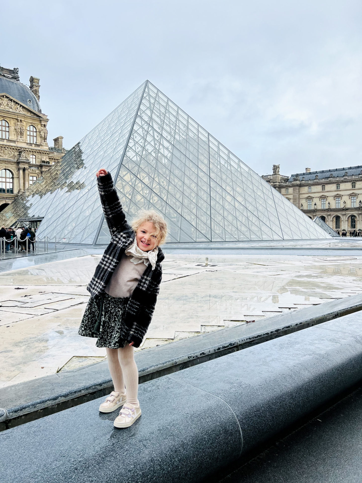 Premier coup de fatigue en partant vers 11h30, et une petite sieste dans le métro l’a requinqué. On allait au Louvre pour voir la cultissime pyramide, la cour du Palais Royal, les colonnes de Buren et le jardin des Tuleries où il y avait le marché de Noël pour manger sur le pouce. Là encore, ce sont des monuments assez ludiques à voir. Elle a couru entre les colonnes de Buren, on lui a expliqué qu’avant des rois vivaient ici, on a fait la photo avec une jolie perspective sur la pyramide … on ne s’est pas éternisé à chaque spot, c’était vraiment une balade dynamique pour évite qu’elle ne s’ennuie. A cet âge-là, on passe vite d’activité en activité !