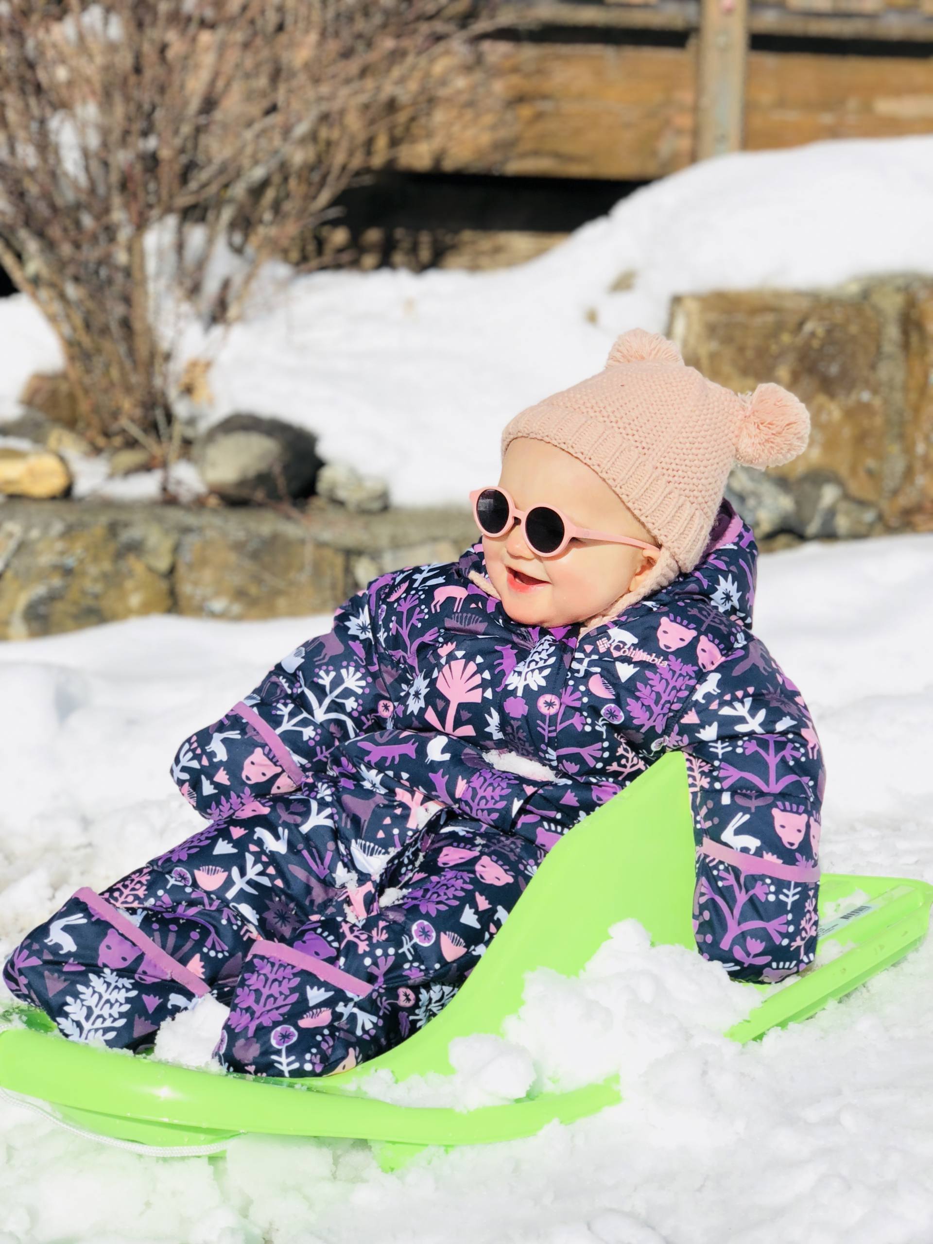 Quant à sa tenue, on a privilégié des vêtements spécifiques à la montagne. J’ai bien pensé de prendre sa combi-pilote et des chaussons fourrés mais ça n’aurait pas suffi. Elle n’est pas déperlante et elle aurait vite eu froid aux pieds ! Du coup, on s’est tourné vers des vêtements techniques et c’est sur le site Les Petits Baroudeurs qu’il y avait ce dont on avait besoin. C’est un site spécifique pour les loisirs outdoor, créé par des parents habitant en montagne et passionnés de nature. Je pense qu’on y retournera quand on aura besoin d’équiper Louise pour aller faire des balades en montagne ou plus tard pour d’autres activités. Pour le ski, l’intérêt de ce site est qu’il propose des combinaisons pour les bébés à partir de 3-6 mois. C’est une belle combinaison de ski Columbia* qu’on a choisi pour Louise. On a pris du 6-12 mois car ça taille assez grand (73-77cm). Là, elle a 13 mois et demi et ça lui convient encore parfaitement. L’intérieur est en polaire et à l’extérieur, elle est déperlante. Petit plus, il y a un surplus de matière au niveau des mains et des pieds qui est rabattable et qui permet d’englober les extrémité pour les mettre à l’abri ! J’ai trouvé cette idée géniale, surtout quand elle faisait de la luge ! Côté bottes, il y en avait en taille 19 sur le site. C’est pas facile à mettre pour les bébés qui ne marchent pas alors je vous conseille de mettre plutôt des bottes souples fourrées. Mais pour un bébé qui tient debout et qui marche, c’est top ! Sous la combinaison, je lui avais mis un body manches longues et un pull chaud. Rien ne sert de multiplier les couches, des vêtements techniques suffisent. En bas, je lui avais mis des collants. Bien sûr, jamais sans son bonnet et surtout des lunettes de soleil car en montagne, c’est très agressif pour leurs petits yeux ! Louise a les Izipizi et bonne nouvelle, elles sont à 19€ sur Smallable !