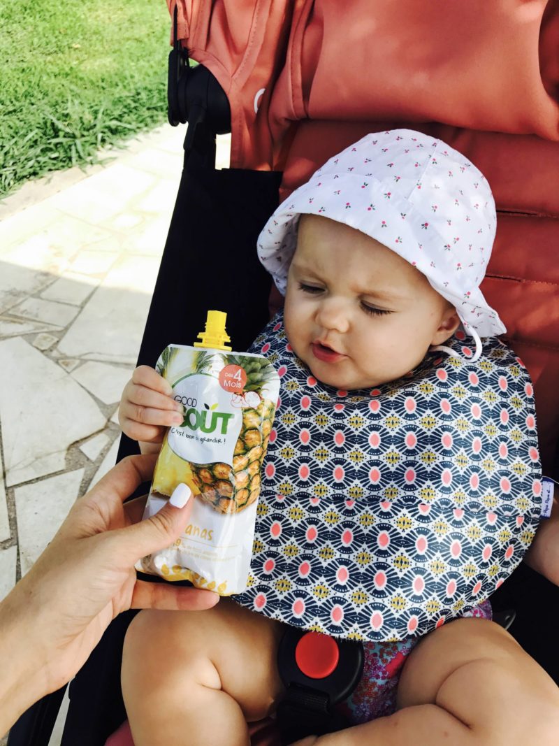Pour nous, pour ne pas se sentir débordé/épuisé pendant les vacances, on a choisi de s’organiser au maximum et de bien anticiper. On est parti avec 12 repas et 12 goûters. Chaque jour, on avait juste à piocher sans se poser de questions, sans chercher de supermarchés. On avait prévu des conditionnements légers, pour ne pas se surcharger. Good Goût et Baby Bio font des gourdes et des doypacks, c’est le plus pratique par rapport au pots. C’est aussi de la bonne qualité. On avait pensé à prendre de quoi nettoyer pour s’épargner le supermarché : un petit pot de liquide vaisselle, la brosse à biberons. Globalement, on a organisé nos valises de façon très logique pour toujours savoir où est chaque chose. Je n’avais pas envie de toujours chercher, de galérer. Comme pour beaucoup de choses, s’organiser permet de mieux profiter ! C’est d’autant plus valable avec un bébé.