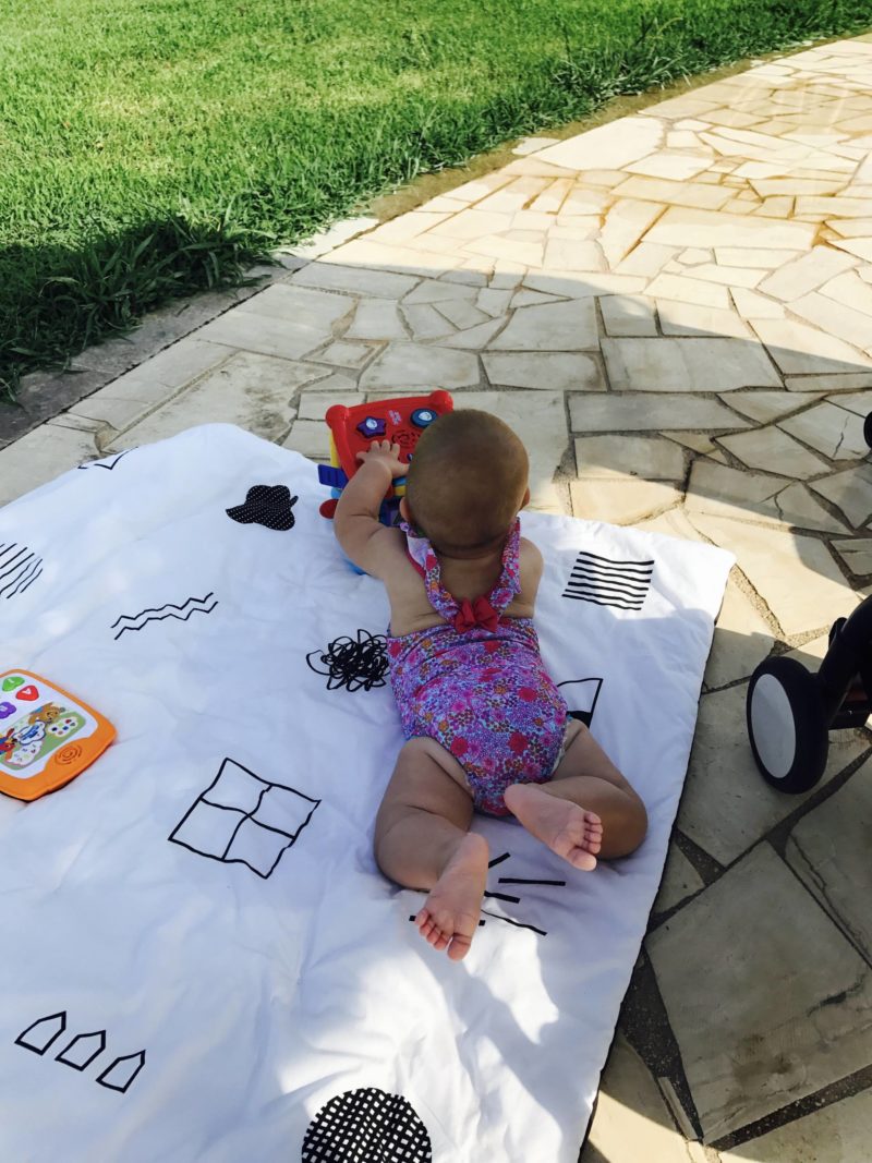 De notre côté, on s’est limité à nos deux gros sacs de voyage Eastpack qu’on a depuis 5-6 ans. Les affaires de nous 3 étaient dedans. J’avais ensuite prévu un tote bag avec un tapis d’éveil et ses jeux préférés. Pas 36 mais 5-6 pour avoir de quoi l’occuper quand même, pour son éveil et son plaisir aussi. Le tapis d’éveil, ça a été génial. Il a servi à la piscine, à la plage, dans les hôtels. Si on la met au sol, elle gratte tout et elle met tout à la bouche. Tout tenait dans un tote bag donc ça allait très bien.