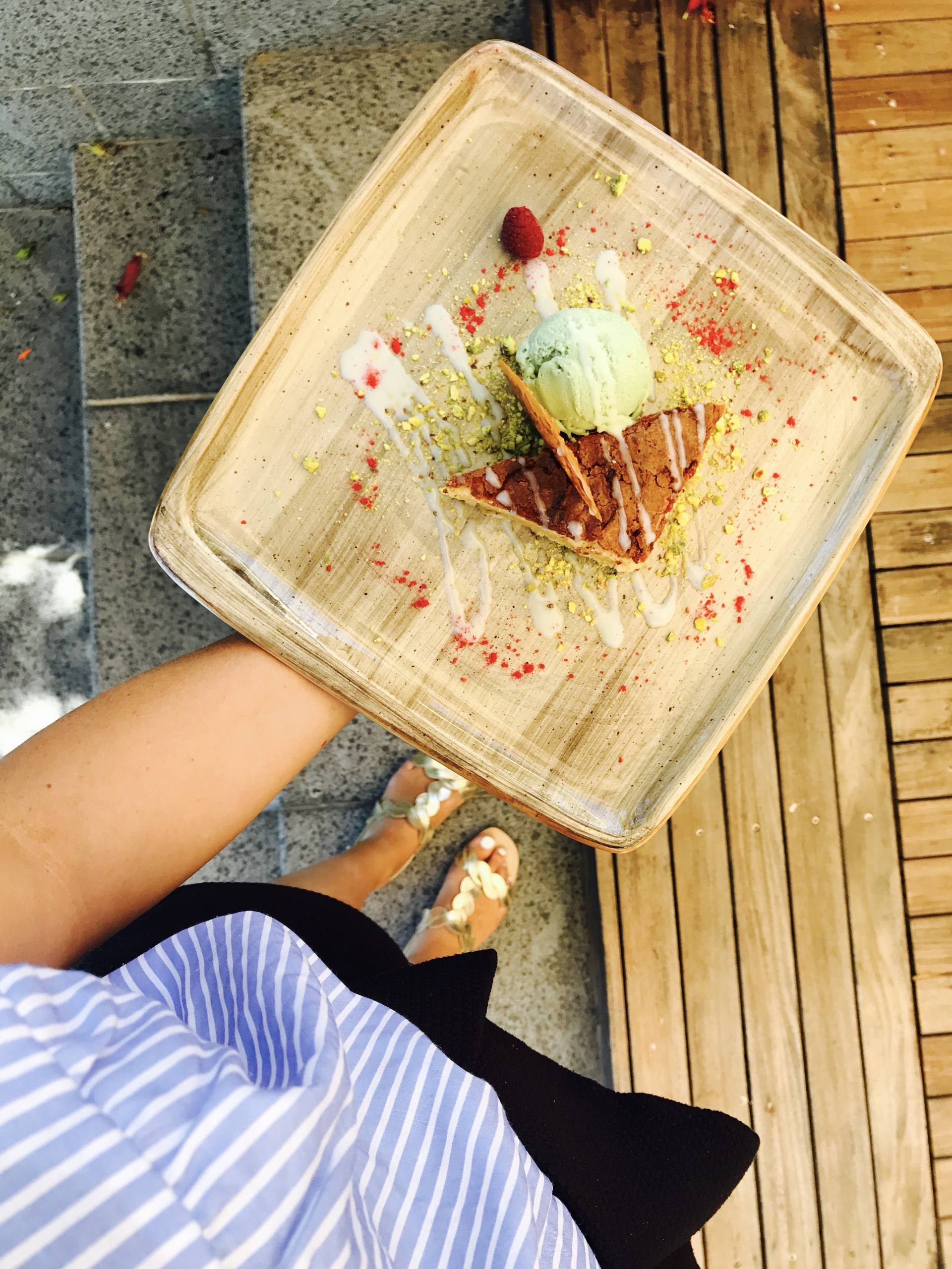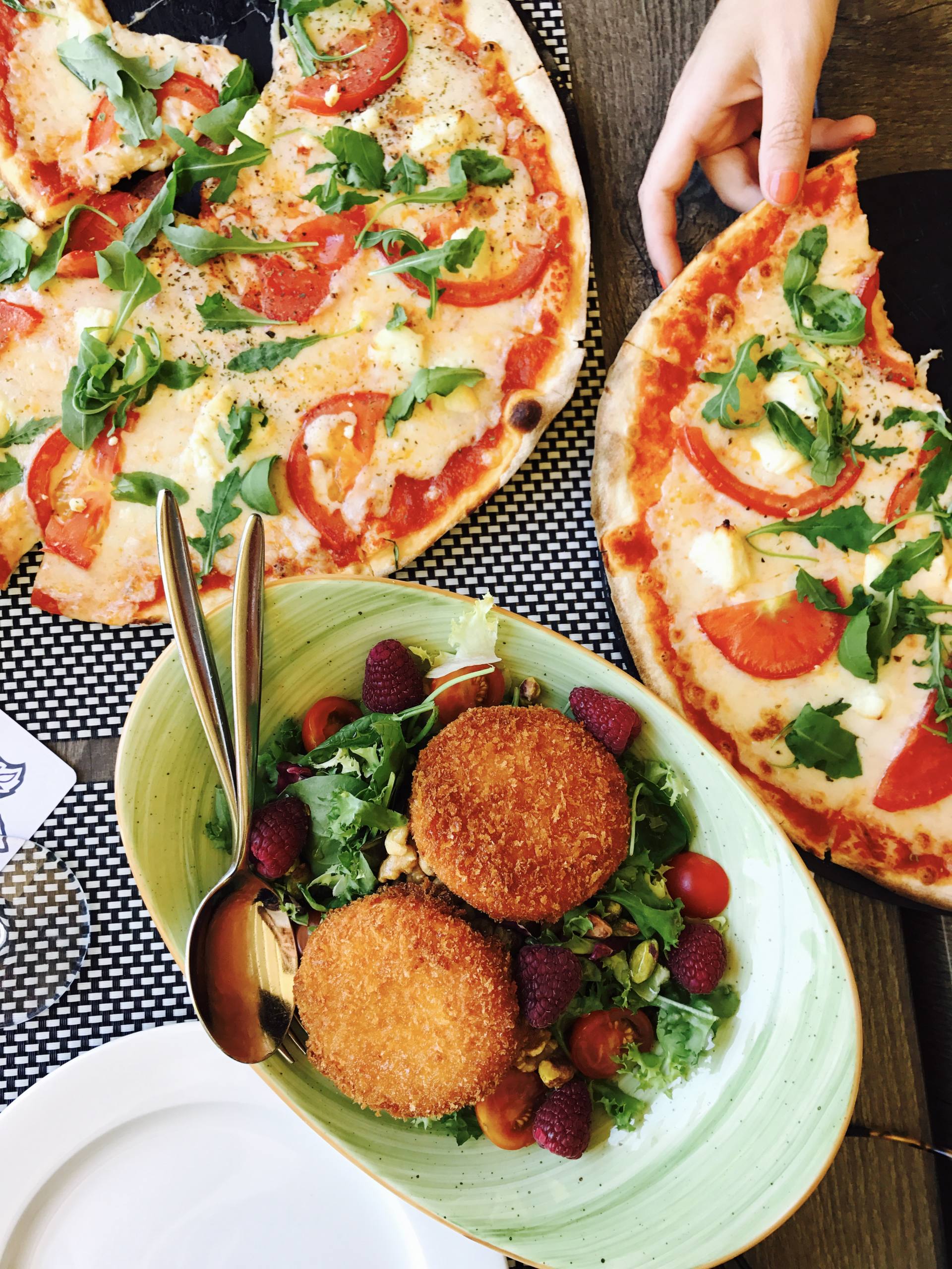 - Le Zen Bar : C’est le restaurant au bord de la piscine dédiée aux familles. C’est légèrement d’inspiration italienne mais avant une carte type snack bar élaboré avec des salades, pizzas, burgers, wraps et sandwiches ! J’ai testé un full chèvre : pizza au chèvre (une merveille !) et salade chèvre-graines-noix-berries ! Vous imaginez bien que je n’ai pas mangé tout ça toute seule, j’ai partagé 😉