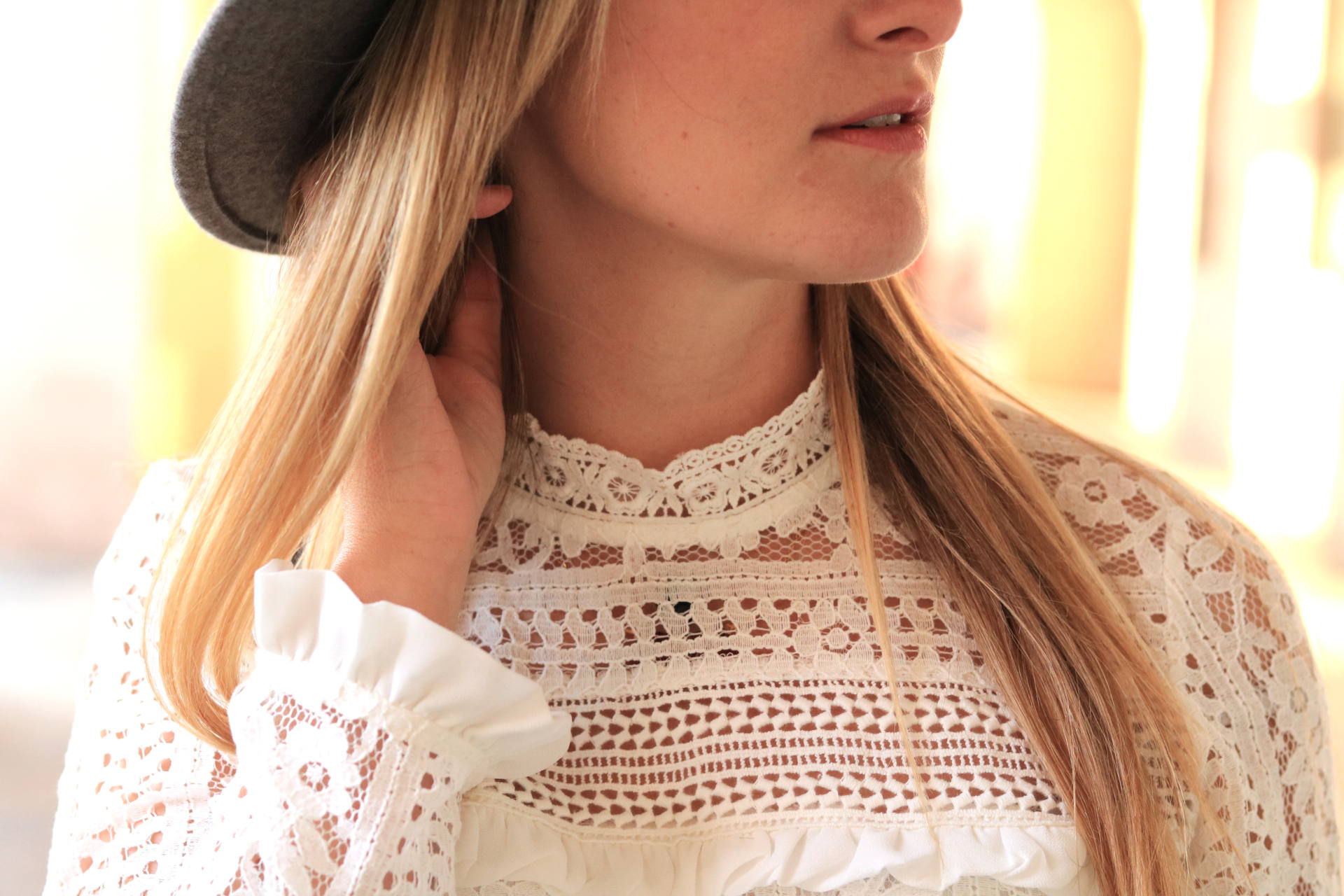 J’ai aussi shoppé cette magnifique blouse. Vous le savez, j’adore les blouses blanches, j’adore la dentelle, alors j’ai fouillé dans les soldes mais aussi dans les nouvelles collections pour dégoter de nouvelles blouses blanches. Et celle-ci est un véritable coup de coeur. J’adore le col avec plein de détails, beaucoup de dentelle, les poignets bien travaillés. Similaire à celles que je retrouve chez Sézane, mais le prix est beaucoup plus doux car elle est à 44,99€ ! Les manches sont légèrement raccourcies aux bras et j’adore ça, ça dégage bien les poignets pour laisser apercevoir les bijoux ! C’est très élégant.