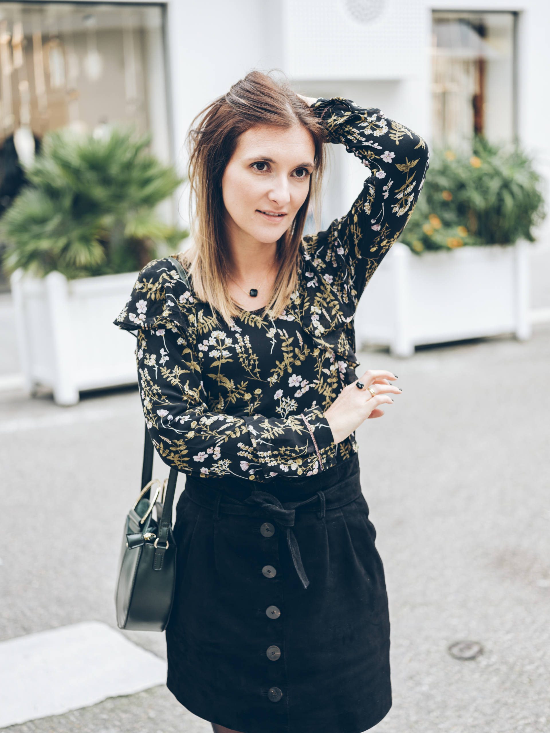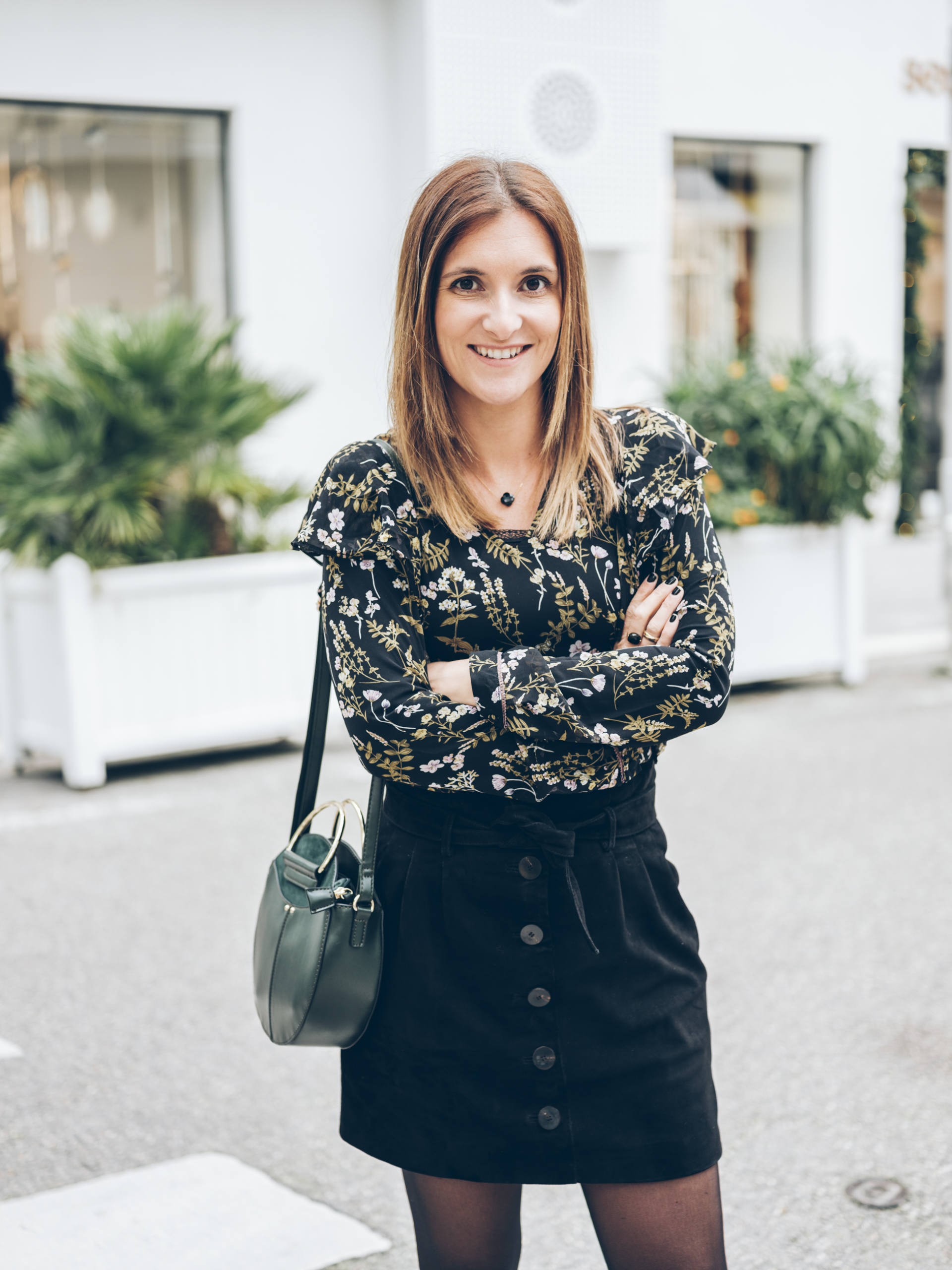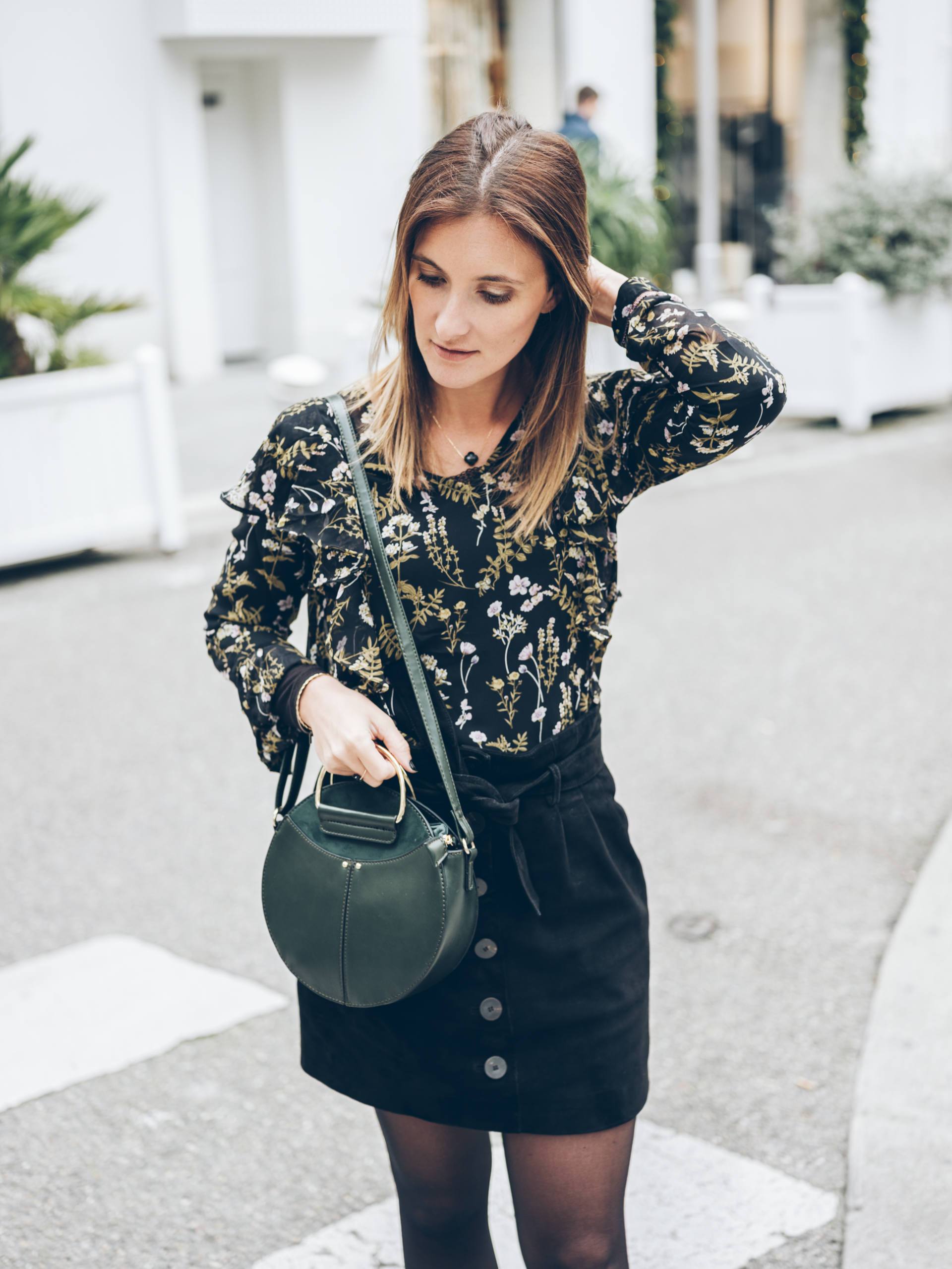 Pour ce look, j’ai osé le vert ! Comme je disais, je n’ai jamais trop porté cette couleur, mais j’ai craqué sur ce sac, alors je me suis dit qu’une blouse avec un rappel de couleur, ce serait peut-être pas mal. Verdict, j’aime beaucoup, et je crois que c’est ma série de photos préférée depuis bien longtemps ! Je n’ai pas pris trop de risque car j’ai associé ces deux pièces à ma jupe et à mes bottines préférée de cet hiver ! Mais ça me fait bizarre de porter du vert quand même !