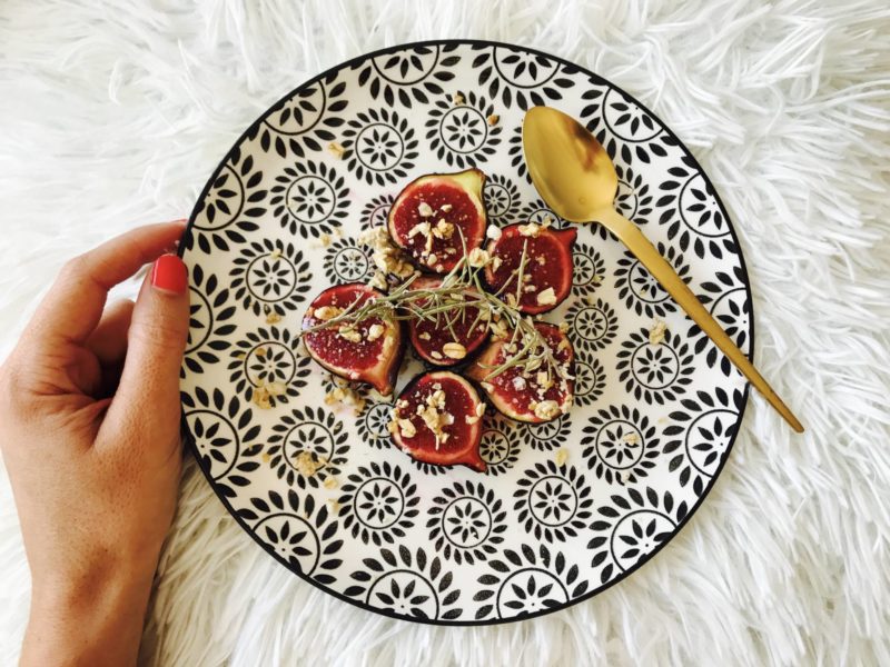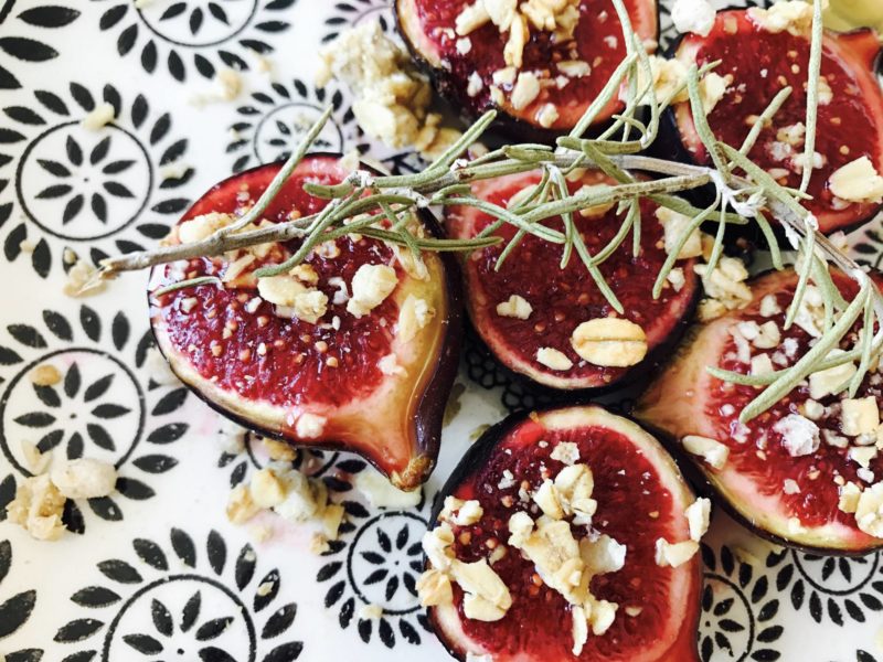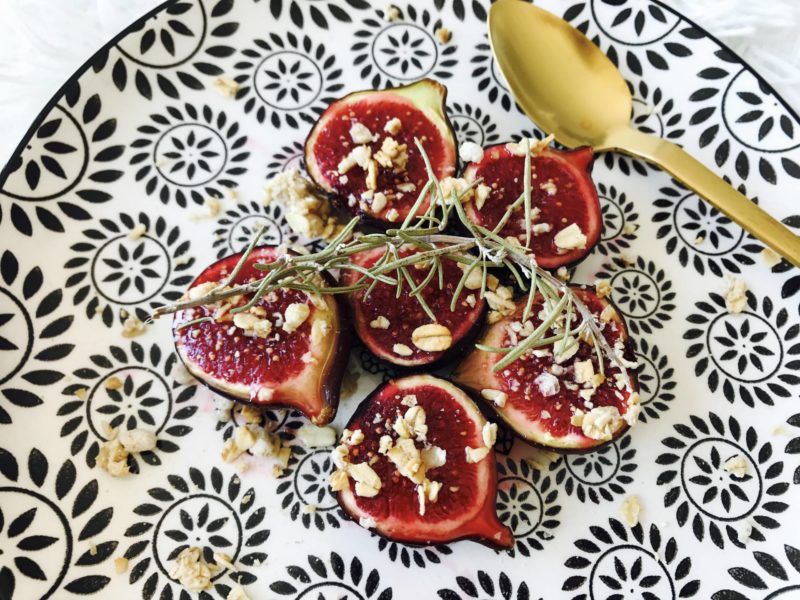 Je commence avec un fruit de saison : la figue, et donc avec des figues rôties au miel et romarin ! Je n’aime pas trop la figue crue. Par contre, cuite, je suis fan ! Le midi, quand je n’ai pas trop envie de passer des heures en cuisine mais que je veux un dessert gourmand et assez sain, j’en fais rôtir 2-3 au four avec un miel bien charpenté et une branche de romarin ! En ce moment, j’ai la chance d’avoir un miel fait-maison qu’on m’a offert, il est trop bon et avec un goût un peu fort comme j’adore. À la sortie du four, j’ajoute soit un peu de granola croustillant, soit un sablé que j’ai concassé. Première option saine, deuxième option plus gourmande. Dans les deux cas, c’est la régalade ! À faire au petit-déjeuner, en dessert ou au goûter !