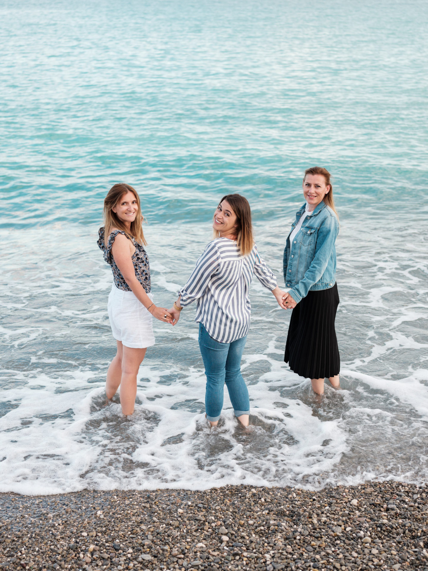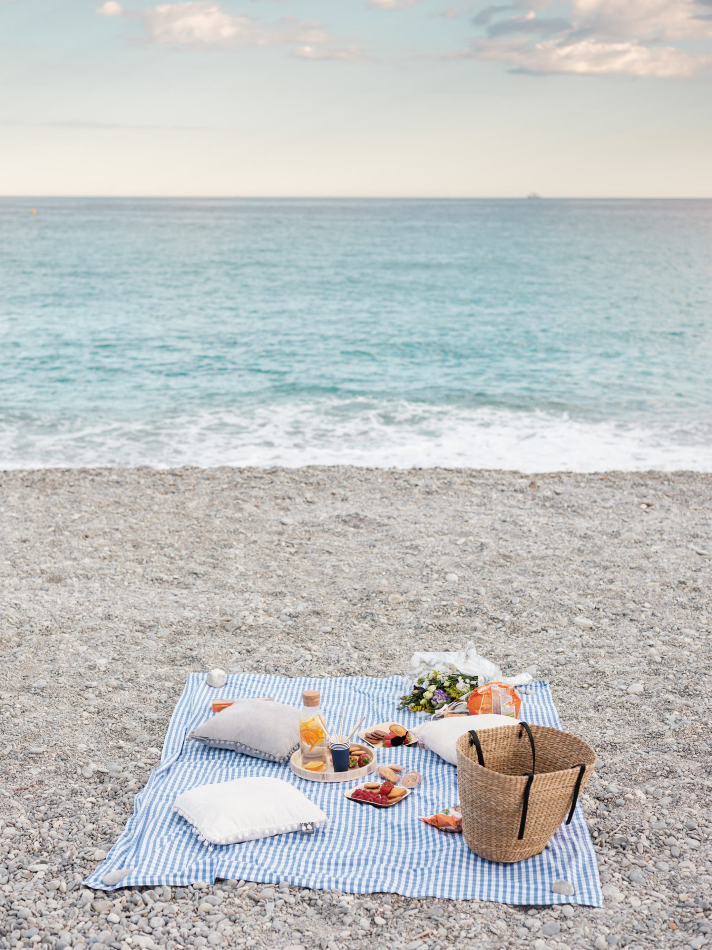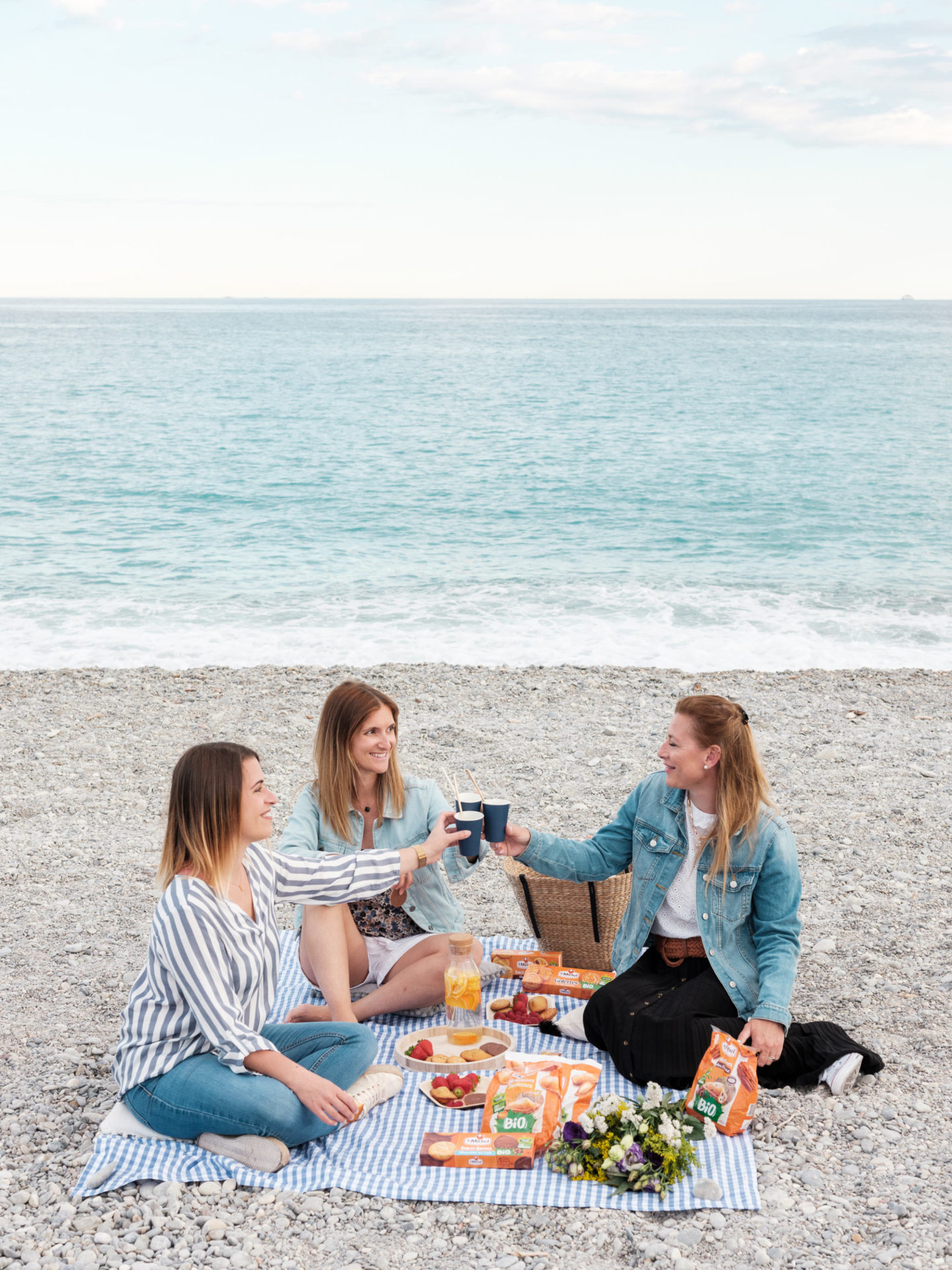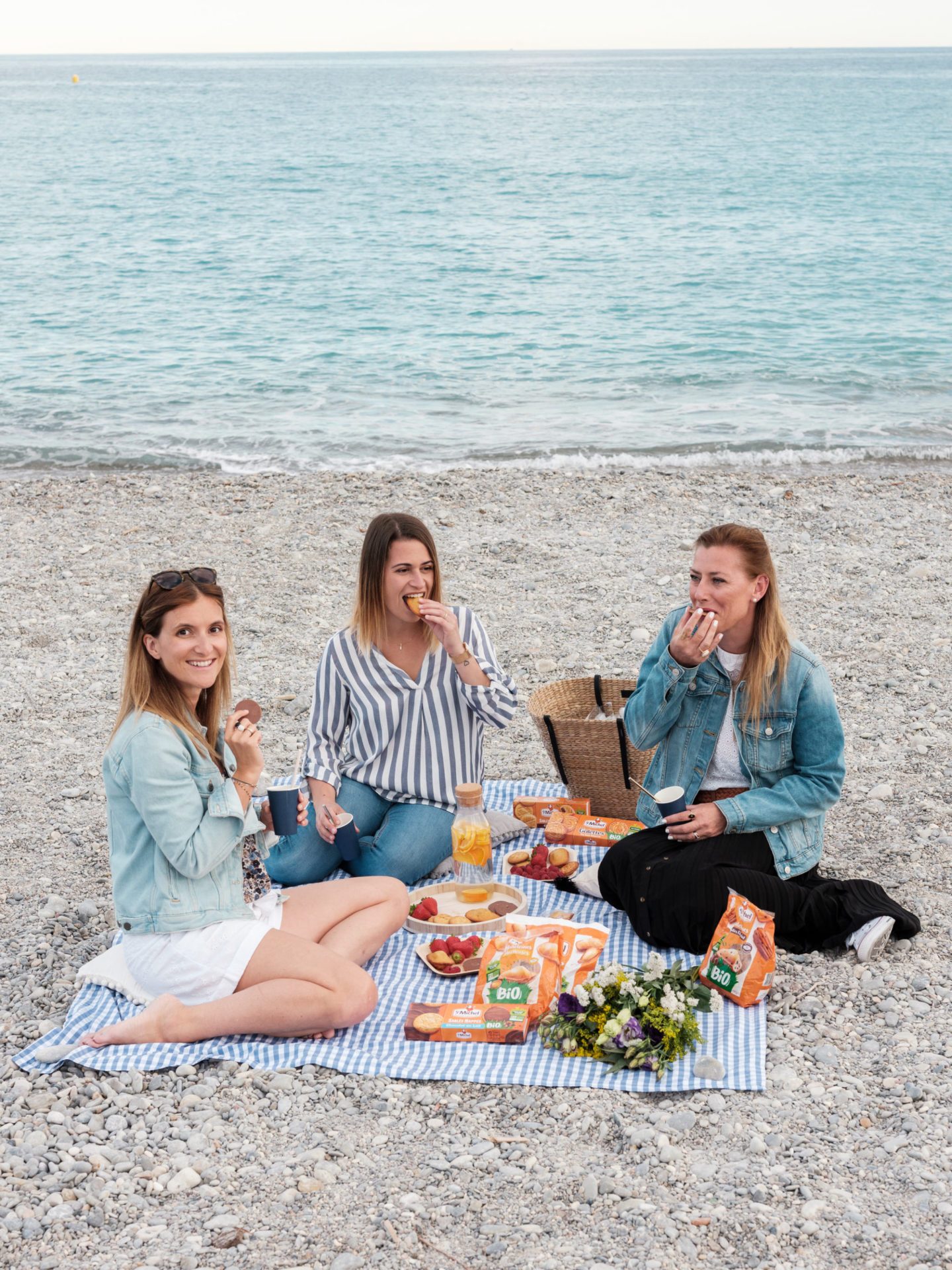 Revenons-en à cette soirée quand même ! Je n’avais jamais organisé de petite rencontre comme celle-ci. J’avais envie que le moment soit à l’image de St Michel, convivial, simple, cool et gourmand. Du coup, j’ai opté pour la plage, sur la Promenade des Anglais. C’est un endroit emblématique de Nice et surtout, j’ai eu de la chance, le soleil, le grand ciel bleu et les bonnes températures sont revenues pile poil le matin-même. J’avais prévu une petite nappe bleue et blanche, tous les biscuits à leur faire goûter, mais aussi des fruits et une eau citron/orange. C’était surtout l’occasion de discuter, de prendre le temps d’échanger. On a parlé de tout de rien, d’elles, de moi, de mon métier, surtout du leur ! Et de plein de choses en fait. Deux mamans de 3 enfants avec une vie bien remplie, ça fait forcément plein de sujets de conversation. On en a profité pour goûter l’eau. Marion a fini un peu trempée par une belle vague, et on vous le dit, elle est bien fraîche encore la Méditerranée, un petit 18 degrés en soirée, ça pique !