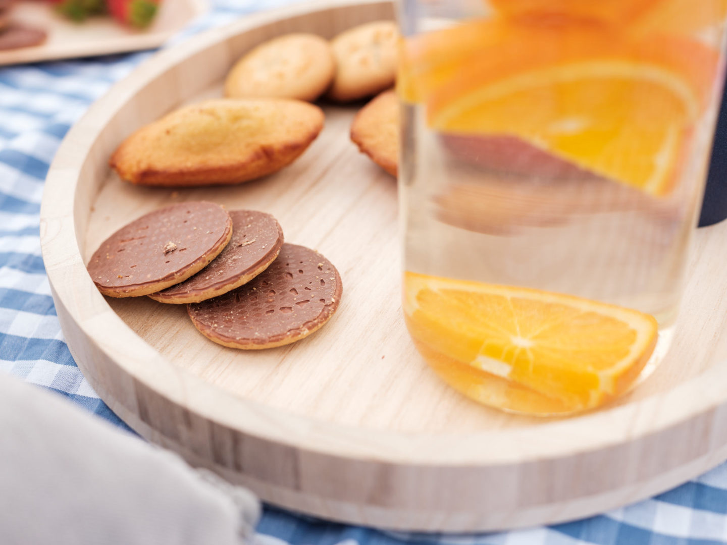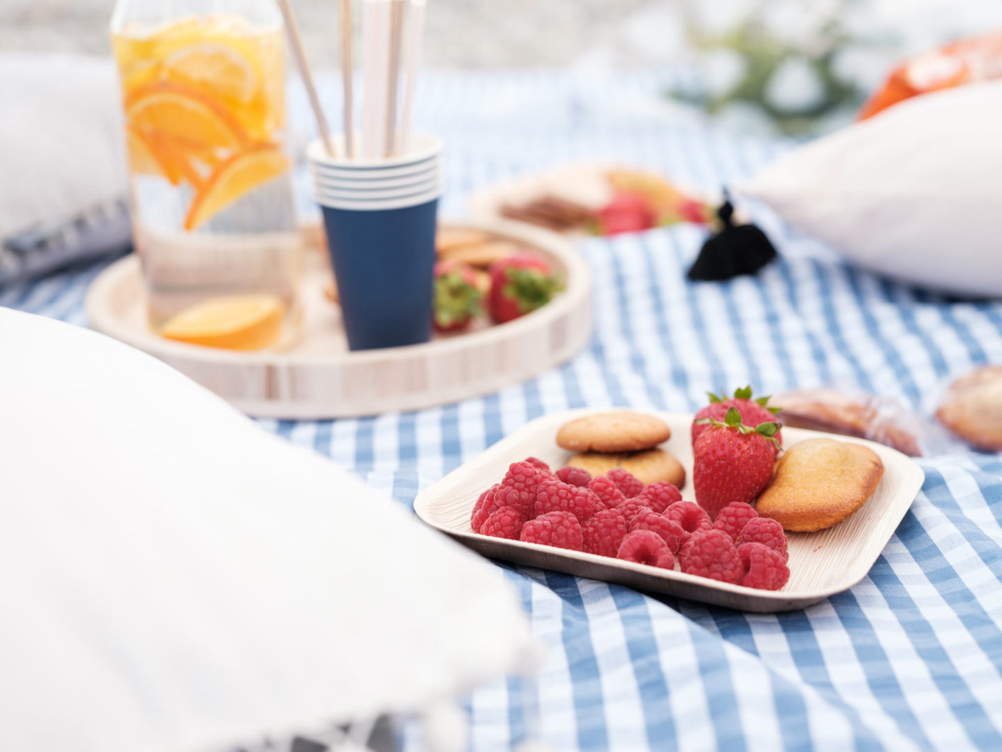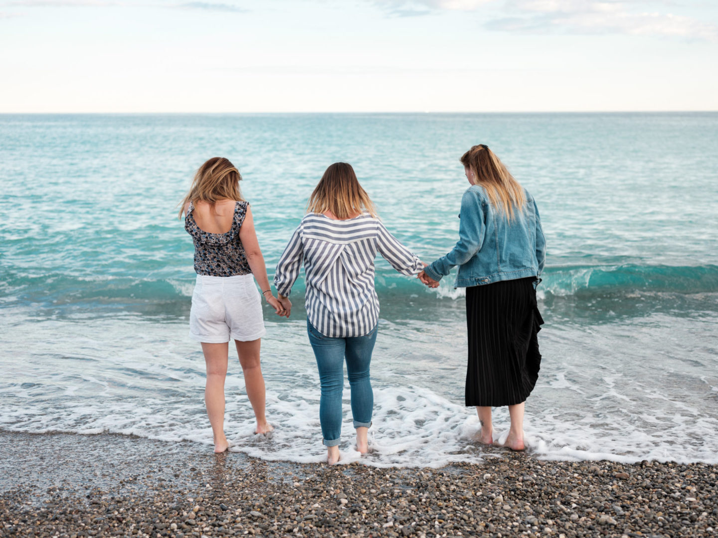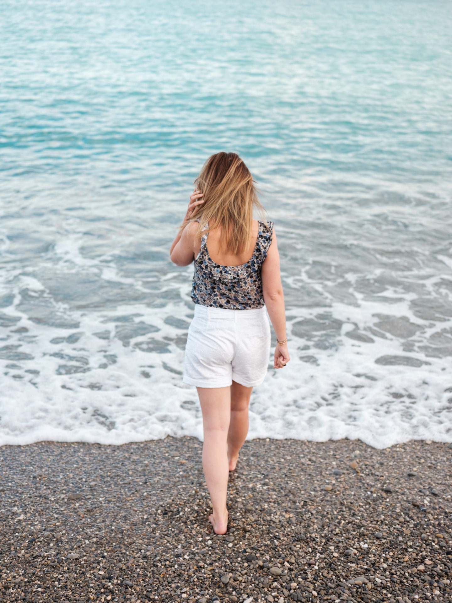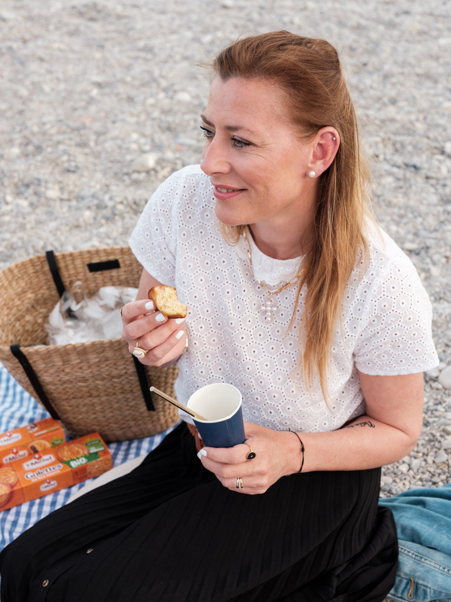 Revenons-en à cette soirée quand même ! Je n’avais jamais organisé de petite rencontre comme celle-ci. J’avais envie que le moment soit à l’image de St Michel, convivial, simple, cool et gourmand. Du coup, j’ai opté pour la plage, sur la Promenade des Anglais. C’est un endroit emblématique de Nice et surtout, j’ai eu de la chance, le soleil, le grand ciel bleu et les bonnes températures sont revenues pile poil le matin-même. J’avais prévu une petite nappe bleue et blanche, tous les biscuits à leur faire goûter, mais aussi des fruits et une eau citron/orange. C’était surtout l’occasion de discuter, de prendre le temps d’échanger. On a parlé de tout de rien, d’elles, de moi, de mon métier, surtout du leur ! Et de plein de choses en fait. Deux mamans de 3 enfants avec une vie bien remplie, ça fait forcément plein de sujets de conversation. On en a profité pour goûter l’eau. Marion a fini un peu trempée par une belle vague, et on vous le dit, elle est bien fraîche encore la Méditerranée, un petit 18 degrés en soirée, ça pique !
