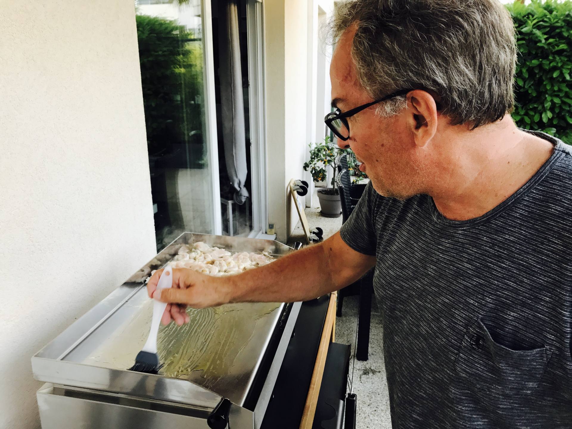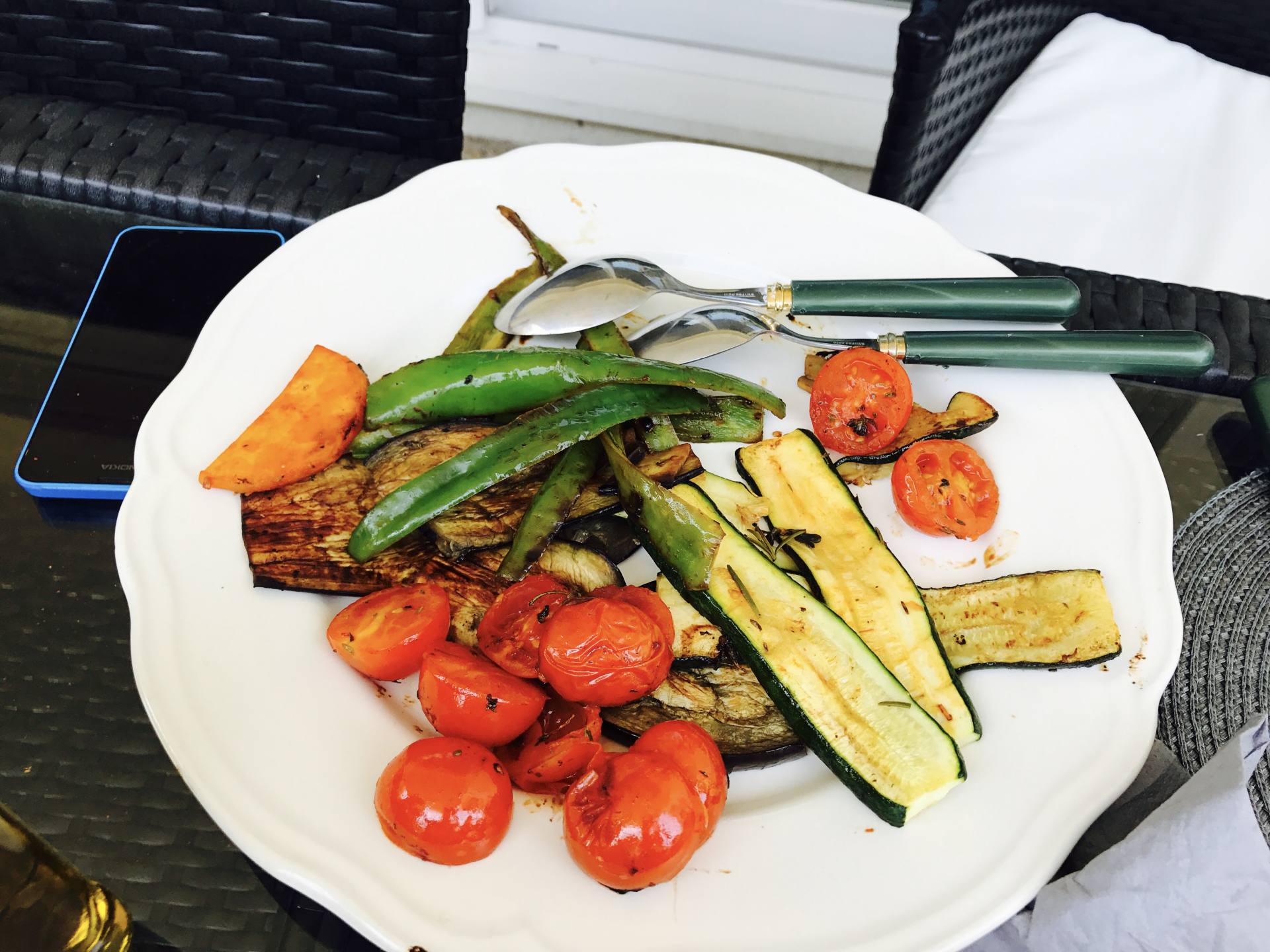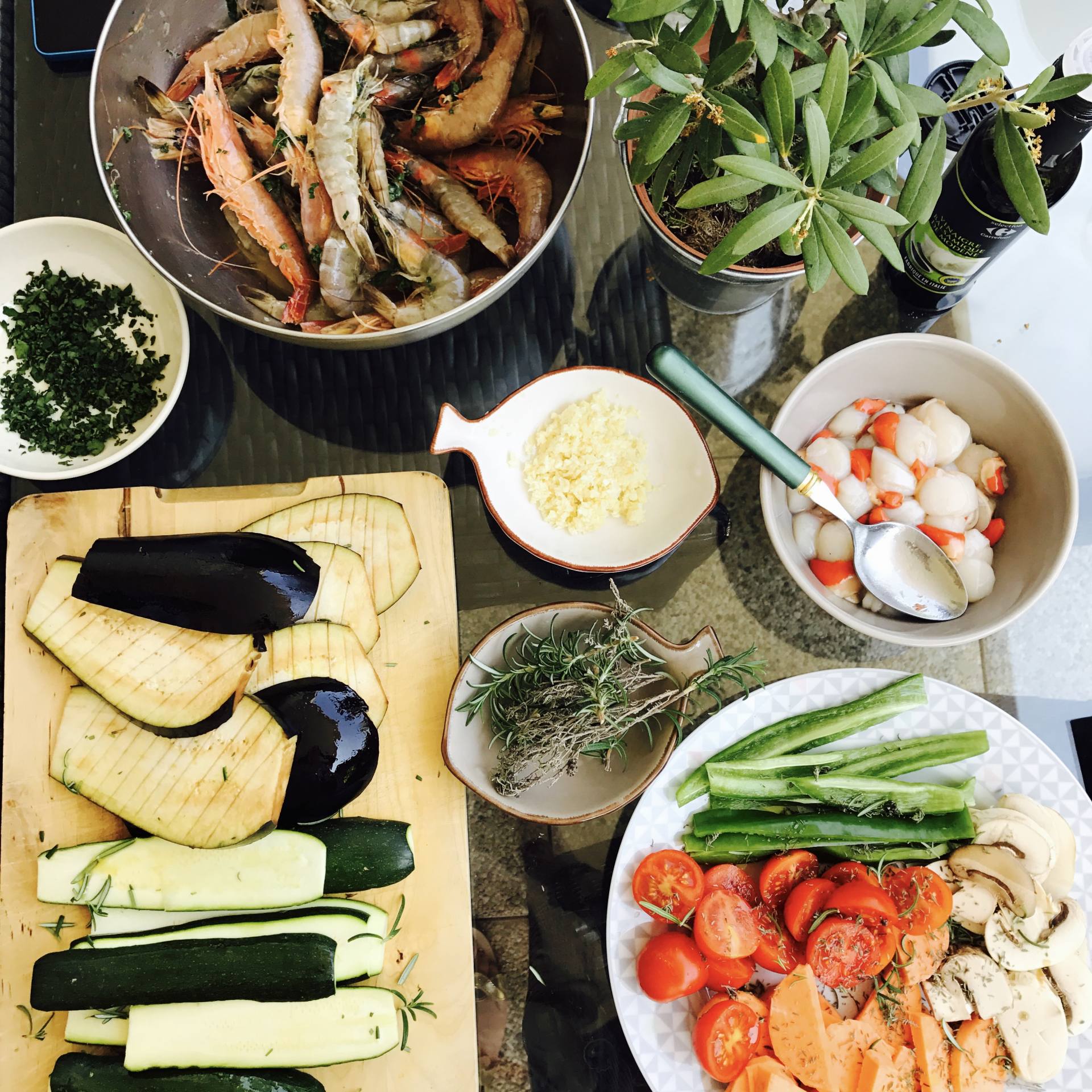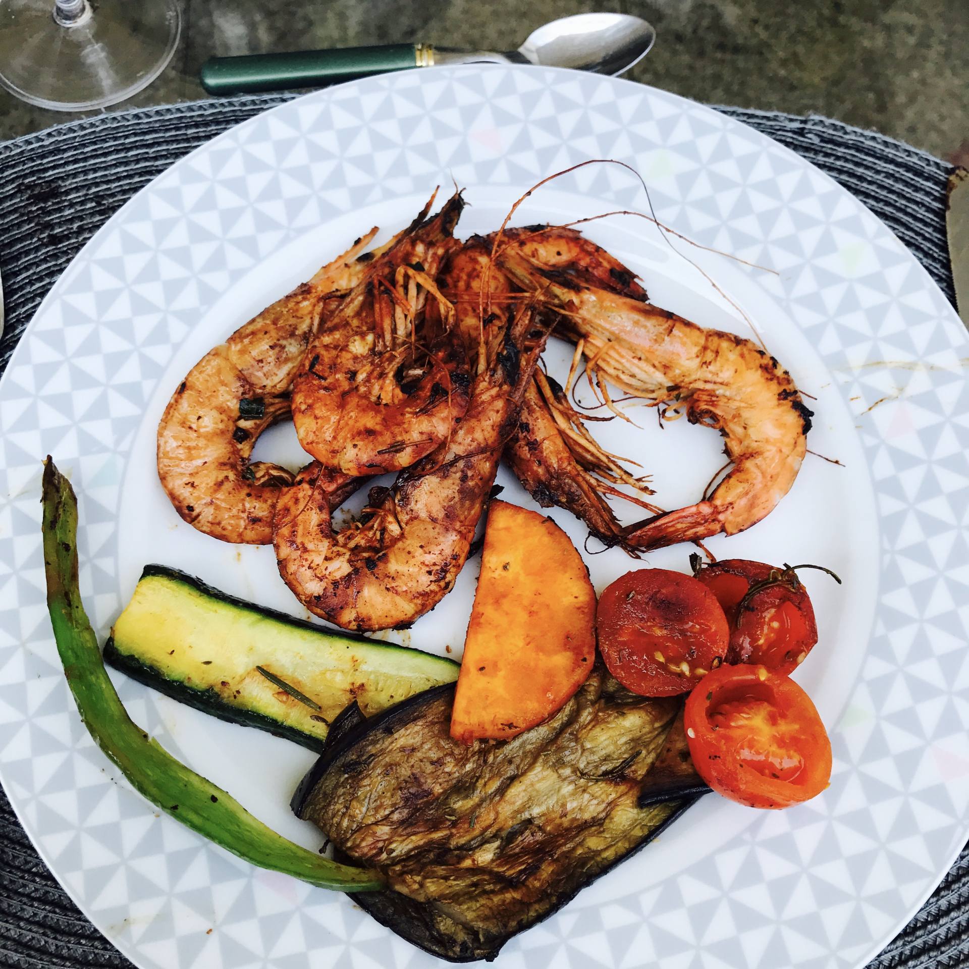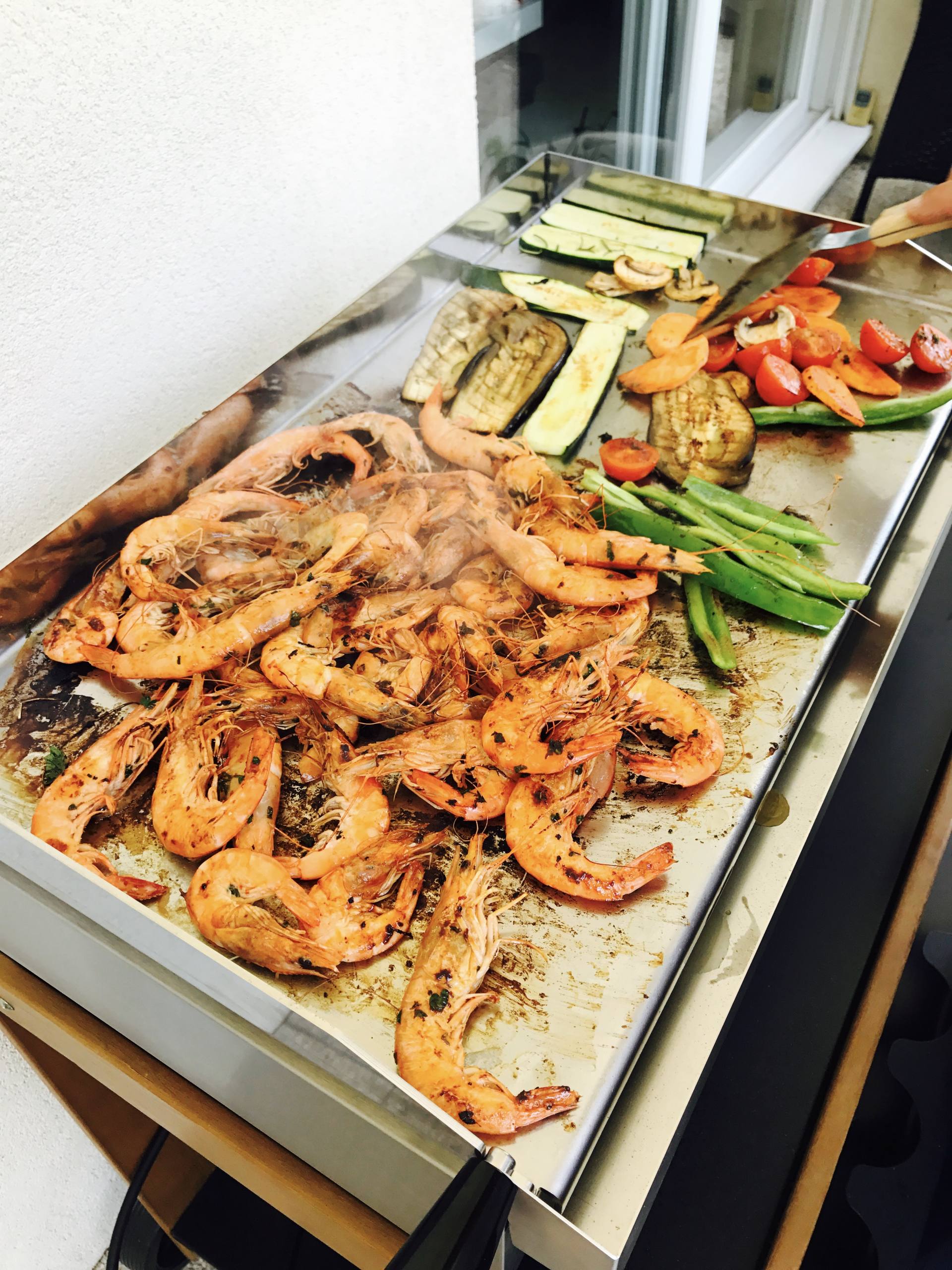 J’adore les gambas ! Je les aime flambées, ou pas. Souvent, au restaurant, je les prends snackées car la cuisson est juste comme j’aime. Pour cette fois-là, elles étaient marinées avec de l’ail, du persil, du citron et un peu de piment d’espelette. Il faut vraiment juste les saisir, faire un aller-retour pour garder le moelleux à l’intérieur. Avec les gambas, on avait fait des noix de St Jacques. Là aussi, la cuisson est très rapide, attention à ne pas les oublier ! Pour aller avec, place aux légumes grillés : courgette, poivron, aubergine et champignons, avec quelques tomates cerises qui ont rôti sur la plancha. C’est vraiment hyper bon, facile et rapide à réaliser !