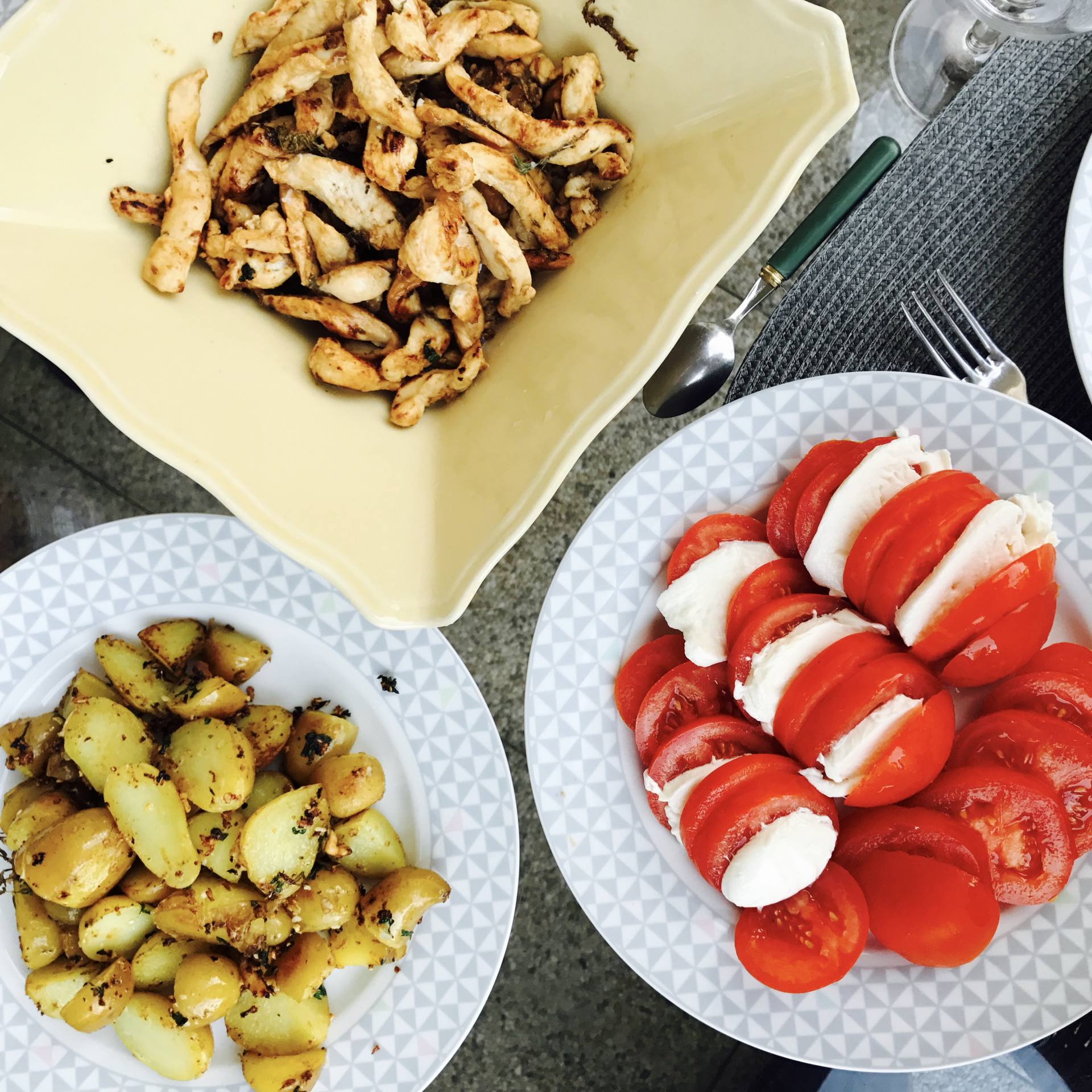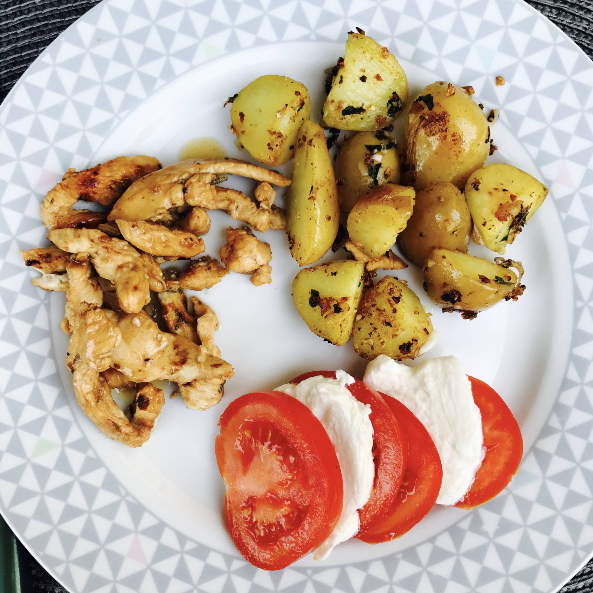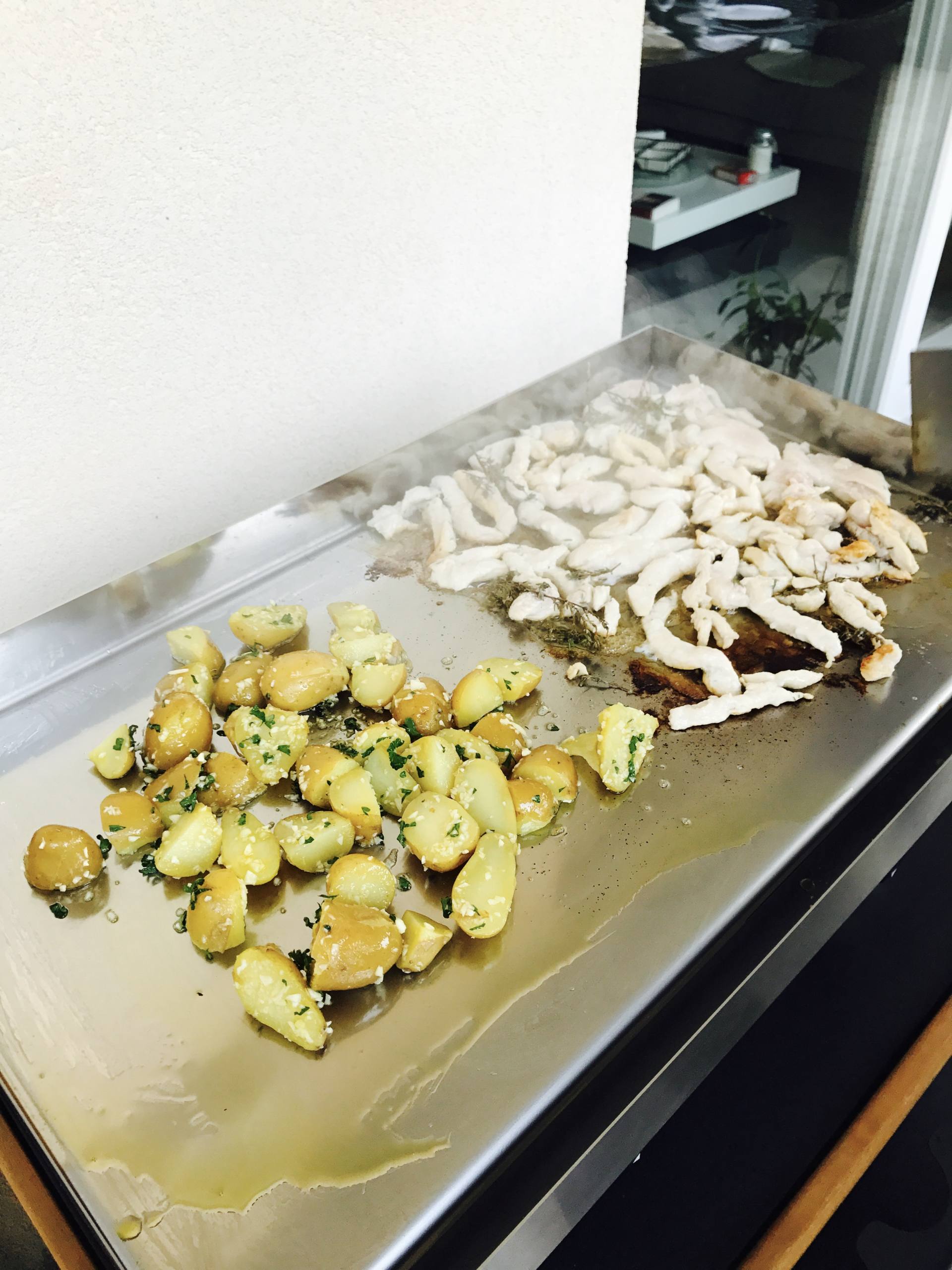 Pour cette recette, le poulet a mariné dans du citron, avec du thym, de l’ail et des fines herbes pour bien le rendre moelleux. Les pommes de terre grenailles ont été précuites dans le cuit vapeur puis coupées en morceaux en gardant la peau. Dans un sac congélation, il faut mettre les pommes de terre, de l’huile d’olive, de l’ail et du persil. Secouez pour répartir de façon homogène. Vous pouvez ensuite tout mettre sur la plancha : le poulet (sans la marinade) et les pommes de terre. La cuisson est rapide aussi pour ne pas enlever le moelleux du poulet. Dès que c’est cuit, mettre le poulet dans le saladier où il reste de la marinade et remuer. Vous sentirez bien la marinade en dégustant ! Pour les pommes de terre, directement dans l’assiette, on pique et on mange !