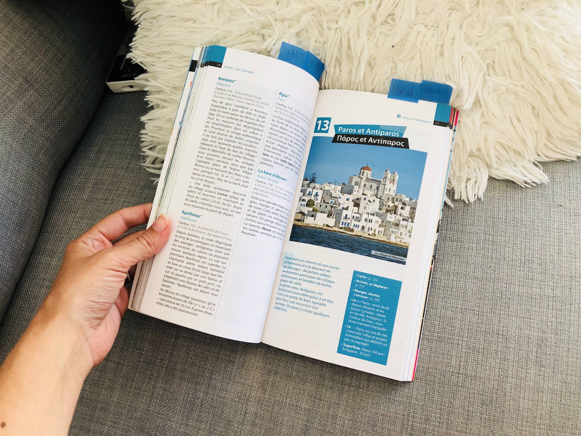 Mon premier plaisir quand un voyage est validé, c’est d’acheter le Cartoville ou un guide pour la destination en question. Cette fois, pas de cartoville. J’ai pris “Guide Evasion” spécifique Îles Grecques, Les Cyclades et Athènes. Il a l’air bien structuré, il y a des visuels, et il se dit être le guide des voyageurs indépendants. A priori, il devrait nous convenir. Je mets toujours des marques-pages aux endroits de nos destinations, ça va plus vite quand on doit l’ouvrir ! Je vous en redirai un peu plus après ce voyage en Grèce. Dès qu’on arrivera sur chaque île, on se débrouillera pour récupérer les plans pour pouvoir se repérer. De notre côté, comme toujours, on prépare une pochette avec à l’intérieur : les réservations Booking/Airbnb imprimées, les confirmations des trajets en ferries et un planning journalier où on a indiqué les horaires pour les jours de changement. C’est pratique plutôt que de toujours chercher dans les emails. Habituellement, je fais aussi un carnet de bord, mais là, c’est différent, ce n’est pas un road trip, on a plusieurs jours à chaque spot donc on fera selon les envies. Par contre, on part aussi avec une liste de bonnes adresses et conseils, le résumé de tout ce que vous m’avez donné !